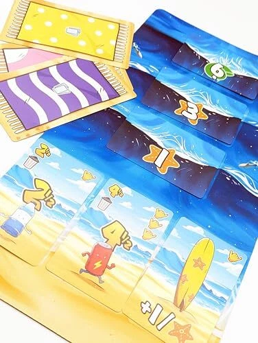 You and your rivals are surfers trying to gain the most points by catching the best collection of waves by the end of the game, dodging bluebottle stings, scoring bonus points from surfboards that match the waves you catch, and by satisfying each game’s 3 unique goals. 3 incoming waves are always visible to all surfers, who select and simultaneously reveal a 1 to 5 energy card they commit to catch the wave (worth 1 to 10 points) in the breakzone closest to the beach. The highest energy card revealed wins the wave, which is collected to be scored at the end of the game. However tied energy cards will cause surfers to wipe out, giving the next highest energy card surfer the win. 'Respect’ is the tiebreaker here, and a resource players can gain OR use to buy extra energy and surfboard (bonus point) cards from the beach when they win, or place second on each wave. The catch is that when you win and take a wave, the energy card you used is trashed (removed from the game), weakening your remaining energy, while the second place and other surfers discard their energy cards and may regain them later. So there is some advantage in coming second and strategically gaining more respect OR buying cards from the beach… Surfboards bought from the beach with respect add bonus victory points to some wave types, skewing the value of certain waves for some surfers as the game progresses. Temporary energy bought from the beach gives surfers an edge in later rounds. Bluebottle stingers sometimes blow into the breakzone, and players must avoid playing the lowest energy cards to escape their sting (0 to -3 points on the underside of each chosen bluebottle token). Or bravely take a sting to save a playable card for the next wave! Players running low on energy can rest (pass) to gain 1 respect, and regain their previously discarded energy cards. The ideal play is to commit just enough energy to win a wave as efficiently as possible at the right time. And then carefully choose when you take more respect (max 4), or when to the beach and what you buy. The game end is triggered when either: 1. All 5 bluebottles have been resolved, or 2. Any player only has their zero energy card left. The player with the most points between waves caught, matching surfboards, bluebottle stings and end game goals wins. Surfing Competition Theme: Players take on the role of surfers aiming to score the most points by strategically catching waves, avoiding bluebottle stings, and achieving unique goals throughout the game. Wave Catching Mechanism: Three incoming waves are visible to all players, and they simultaneously reveal a 1 to 5 energy card to catch a wave, with the highest energy card winning. Tied energy cards lead to wipeouts, with 'Respect' as the tiebreaker, a resource players can gain or use strategically. Resource Management: Winning a wave trashes the energy card used, weakening the surfer's remaining energy. Players in second place or lower can regain discarded energy cards and gain respect, which can be used to buy extra energy and surfboard cards from the beach. Surfboard and Energy Strategy: Players can purchase surfboards from the beach, adding bonus victory points to specific wave types. Temporary energy can also be bought, providing an advantage in later rounds. The strategic choice between coming first or second adds depth to gameplay. Bluebottle Sting Challenge: Bluebottle stingers can affect players with negative points. Players must balance playing high-energy cards to win waves with avoiding stings. Resting to gain respect and regain discarded energy cards adds a tactical layer.