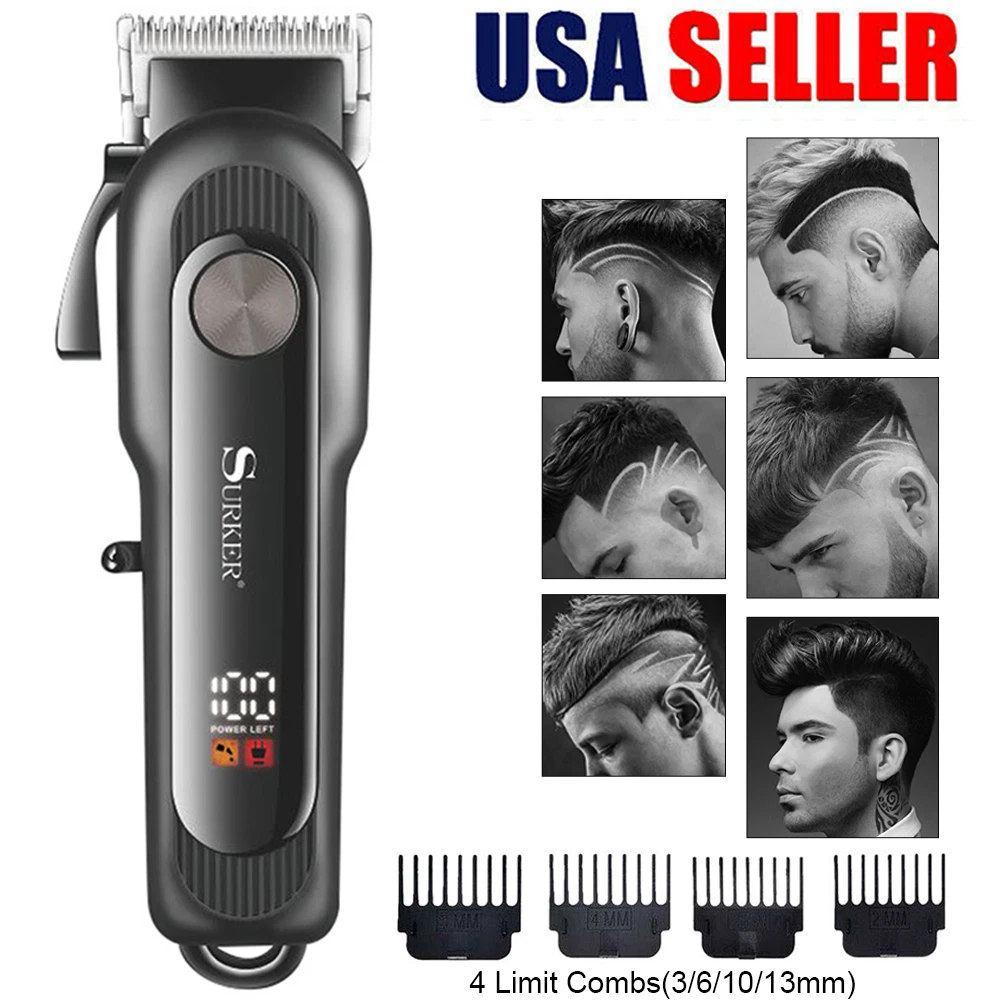Product details: 1 Using high quality steel, sharp and durable. 2: limit comb * 4 (3/6/9/12mm) 3: The R-type blade safely, cuts hair easily and does not hurt the skin. 4: waterproof design, easy to clean. 5: Large capacity lithium battery can work up to 240 minutes. Product parameters : Brand: Surker Product Name:SK-911 Body weight: 252g Color box size: 23.5*6.5*14cm Machine size: 19*5/7.4*1.9 Inch Color: Black / Grey Voltage: 110-240V 50/60HZ Power 5W, Use Time: Charge 3 hours , Use 150 mins Include: host*1 USB cable*1 limit comb*4, cleaning brush*1