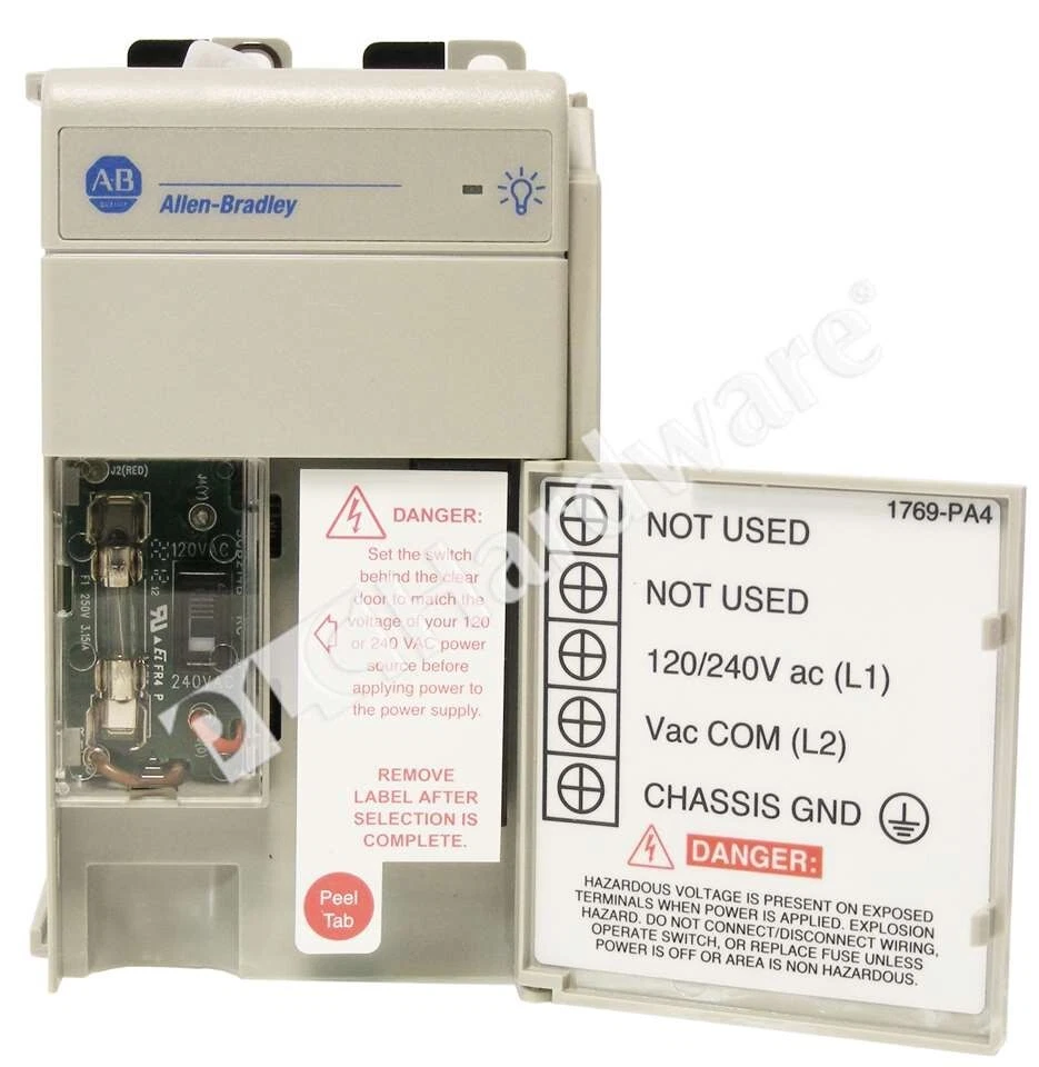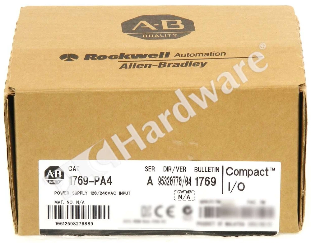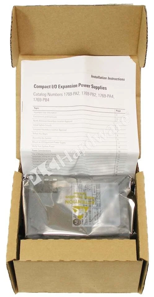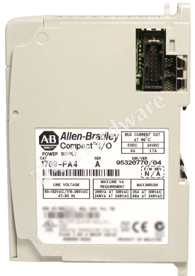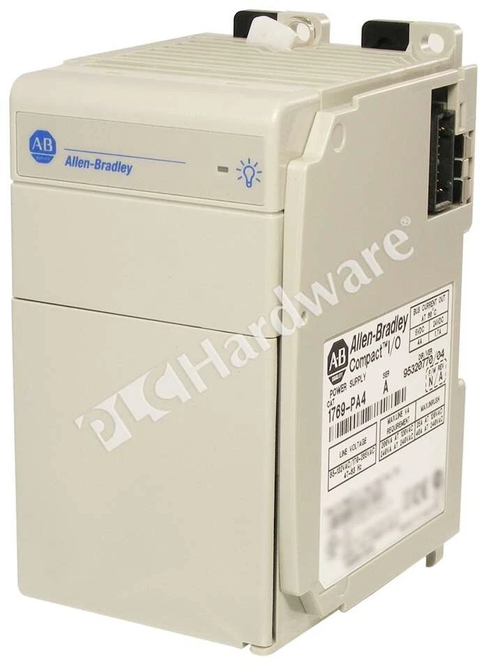 Rockwell Automation > PLC & HMI > I/O Products > CompactLogix > 1769-PA4/A General Product Information Mfr. Part Number: 1769-PA4/A Manufacturer: Rockwell Automation Description: Allen-Bradley 1769-PA4 Compact I/O Expansion Power Supply, Input Voltage Range: 120/240V AC Input (85-132V AC or 170-265V AC, switch selectable), Output: 4A @ 5V DC, 2A @ 24V DC; Supplies power to 1769-L3x Processors and I/O Modules, Series A Specifications: 1769-PA4 provides power to up to Eight I/O Modules on either side of the power supply for a maximum of 16 modules. Power consumption: 200 VA @ 120V AC, 240 VA @ 240V AC; Inrush Current, max: 25 A @ 132V AC; Isolation Voltage: 265V (continuous); Fuse Type: Wickmann 19195-3.15A, Littelfuse 02183.15MXP. Miscellaneous: Input power switch behind the clear door must be set to match 120V or 240V AC power source. Wire size: 14 AWG (2.5 mm) solid copper wire rated at 90 °C (194 °F) or greater, 1.2 mm (3/64 in.) insulation max. This Item Details You are bidding on: One Surplus in Original Open Box Allen-Bradley 1769-PA4 Series A, CompactLogix Power Supply 120/240VAC, DC Output. Notes: The unit is Series A. The Serial Number in the pictures has been altered for privacy purposes. Condition: SOP ( S urplus O pen P re-owned ) Shipping and Warranty Availability: In Stock We are NOT Authorized Distributor of this item Shipping Date: Same business day, if cleared payment received by 6 PM EST We sell pre-owned SURPLUS and USED equipment ONLY Warranty: 60 DAYS Replacement Warranty Manufacturer's Warranty and Support DO NOT apply This Item Pictures Shipping Shipping Date: Same business day, if cleared payment received by 6 PM EST Carriers: US Destinations: FedEx Ground Service International Orders: USPS Express Mail International (insured) * Expedited shipping is available for an extra fee * International buyers pay all customs duties, taxes & brokerage fees Payment Payment Methods: Credit Cards Wire-transfer: contact us for payment instructions * Payment must be received within 3 days after the purchase * eBay may collect tax where applicable Warranty and Returns Warranty: 60 DAYS Replacement Warranty. Manufacturers' warranties DO NOT apply Product Returns: Return Authorization is required for all Product Returns Warranty and Returns are subject to our Policies and Terms Products must be returned in the same condition as delivered Contact Us Company Address: PLC Hardware 11706 Garrison Forest Rd Owings Mills, MD 21117, USA Mon-Fri: 8:30am - 8.00pm ET Toll Free: 1. 800. 752. 5962 Email: PLCHardware.com We buy Allen Bradley, Siemens, Schneider Electric & Fanuc surplus Disclaimer PLC Hardware (PLCH) is an independent distributor of used and pre-owned surplus industrial automation and networking equipment. We are not an Authorized Distributor or in any way affiliated with Cisco, Fanuc, HP, Rockwell Automation, Schneider Electric, Siemens and any other listed manufacturers. We have developed our own global sourcing relationships with End Users, independent distributors, auction houses, asset recovery companies, independent contractors and procure our equipment through such sources. PLC Hardware sells hardware products only and does not re-sell software licenses. Some hardware products may contain software and may not be legally operated without first purchasing a proper software license from the manufacturer of such products. PLC Hardware respects intellectual property of others, and we ask our customers to do the same. Customer acknowledges and agrees that PLCH does not provide any operating system software or software right-to-use licenses with the products it sells. Customers understand and agree that proper software licensing, software maintenance and upgrades are subject to applicable manufacturer's Software Licensing Agreement. Customer shall be solely responsible for obtaining proper software licenses for applicable products from the manufacturer. As PLC Hardware is not an Authorized Distributor of the products, manufacturers' warranties and support do not apply . Customers must check manufacturer’s website for further information. All listed logos, trademarks or service marks are property of their respective owners.