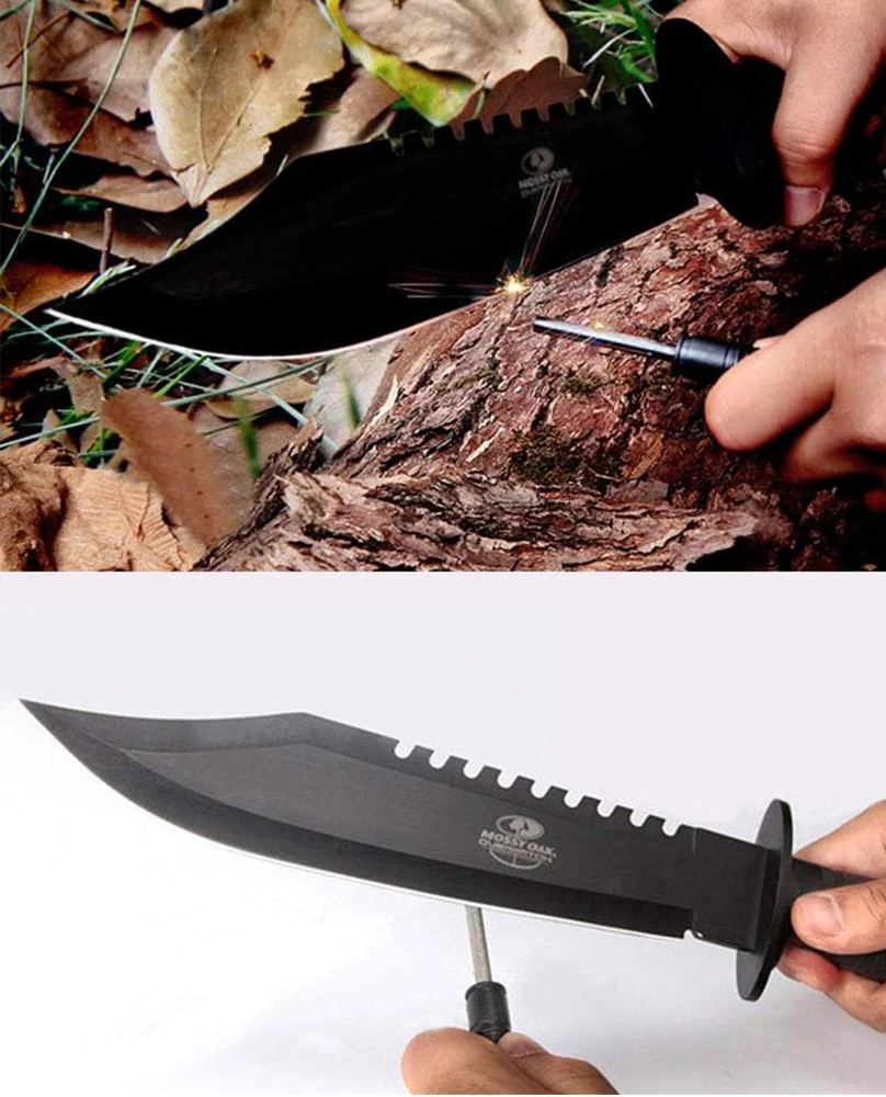15" Fixed Blade Knife: Ultra-sharp combat knife, stronger than any hunting knife or bowie knife. Overall Length: 15 inch; Blade Length: 10 inch; Thickness: 5/32 inch (3.8 mm); Weight: 16.8 oz Razor Sharp Clip Point Blade: The survival Knife is made of stainless steel for excellent hardness, improved edge retention and rust resistance. Survival knife's clip point blade features saw back, black anodize, ideal for camping expeditions, survival training or military combating Rubber Handle & Nylon Sheath: Classic rubber handle of survival knife, provides high friction and comfortable non-slip grip for use. Heavy duty nylon sheath with easy open fastening system and belt hanging system for easy and safe carry Sharpener & Fire Starter: Packed below the plastic container in the paper box, please check carefully. Fire starter (black) and a sharpener (sliver) is suitable for outdoors camping Occasions: As a perfect camping and hunting survival knife, Mossy Oak fixed blade knives are built to last. it’s suitable for hunter, camper, survivalist or outdoor sports enthusiast so that you can enjoy your adventure Product Description MOSSY OAK OUTDOOR GEARS Add to Cart Add to Cart Add to Cart Add to Cart Add to Cart Add to Cart Add to Cart Customer Reviews 4.6 out of 5 stars 192 4.7 out of 5 stars 5,253 4.7 out of 5 stars 432 4.5 out of 5 stars 118 4.3 out of 5 stars 95 4.6 out of 5 stars 2,325 4.6 out of 5 stars 3,368 Price $12.99 $ 12 . 99 $18.99 $ 18 . 99 $28.99 $ 28 . 99 $19.99 $ 19 . 99 $19.99 $ 19 . 99 $21.99 $ 21 . 99 $12.99 $ 12 . 99 Quantity 1 pack 2 pack 1 pack 1 pack 1 pack 1 pack 2 pack Material Stainless Steel Stainless Steel Stainless Steel D2 Steel Stainless Steel Stainless Steel Stainless Steel With Sheath ✔ ✔ ✔ ✘ ✔ ✔ ✘ Color Black Black Black Black Black-Brown Camo Stone-washed Use Scene Hunting/Outdoors Hunting/Outdoors Hunting/Outdoors Hunting/Outdoors Hunting/Outdoors Hunting/Outdoors Hunting/Outdoors Sturdiness ✔ ✔ ✔ ✔ ✔ ✔ ✔ About MOSSY OAK Everyday, we put our lifelong dedication to work, cultivating new ways to share our passions and expertise. From the dirt to wildlife groceries to the fostering of the outdoor lifestyle, MOSSY OAK is in the business of being outdoors. Built for control and precision, this multi-purpose hunting survival knife works great for any tasks. Suitable for various moutdoor situations High-end Stainless Steel & Blade Coating Selected high-quality stainless steel and black finished coated, sharp, wear-resistant, and high hardness. Comfortable Rubber Grip The handle is made of high quality TPR rubber, provides high-friction grip, making the knife comfortable to hold and easy to handle, non-slip design. Magnesium Fire Starter We equipped with a Magnesium sticks for this hunting knife, which can easily solve the problem of using fire for outdoor survival. Get A Sharp Edge in 10 Seconds The Hunting Knife and Tool Sharpener quickly return the edge on knives in about 10 seconds.