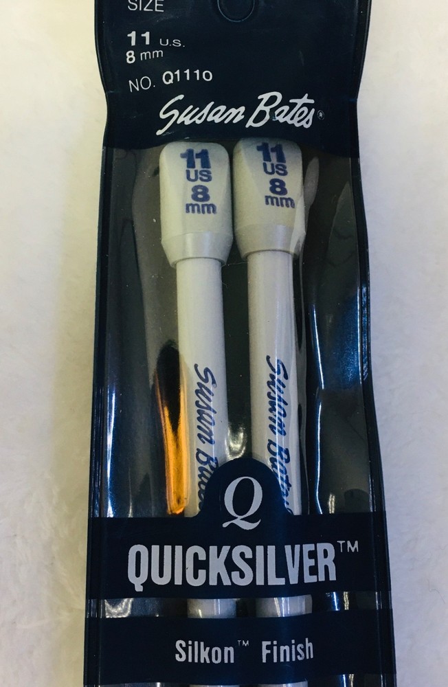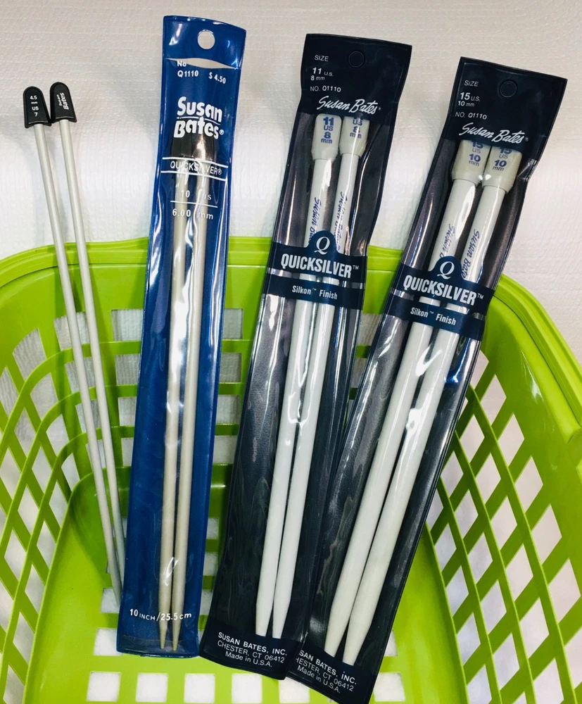 One (1) Pair of Susan Bates Quicksilver 10” Length Single-Pointed Knitting Needles Sizes US 11 (8mm) and US 15 (10mm) are being offered individually (separately from each other). Combined shipping is available if you want more than one size (please read last photograph to learn how). Please Use Drop-Down To Choose The Size You Would Like. There are only two sizes left now! *** I refreshed and updated this listing today, in order to get these sold and close out this listing. * Condition: Preowned in good gently used condition. * These needles have always been stored in my craft room under heat and air. * Sizes11 and 15 come in their original packaging (blue vinyl reusable pouches), and were made in the United States. Product Details: * Brand: Susan Bates * Distributor: Coats & Clark * Model: Quicksilver * Material: To minimize weight and enhance stitching comfort (minimize wrist fatigue) size 11 and 15 have a plastic shaft with silkon finish. This finish is nice and feels light weight. You will not be disappointed. * Quicksilver is a premium label from Susan Bates. * All Quicksilver needles are light gray in color. * Finish is a result of a special iodization process which also makes Quicksilver slightly smoother and more durable than some of the other brands of needles. Please see a ll the photos of these knitting needles - click on them to zoom in and make them larger. These photos are the best description of these knitting needles, and they explain how to COMBINE SHIPPING! I make every effort to accurately describe items, and photograph the true color, but if I misrepresented an item, please contact me first through eBay, so that I may resolve the situation, before leaving neutral or negative feedback. I strive to keep my 100% feedback rating. Thank you for looking at my listings and being supportive of my efforts. My home is smoke and pet free.