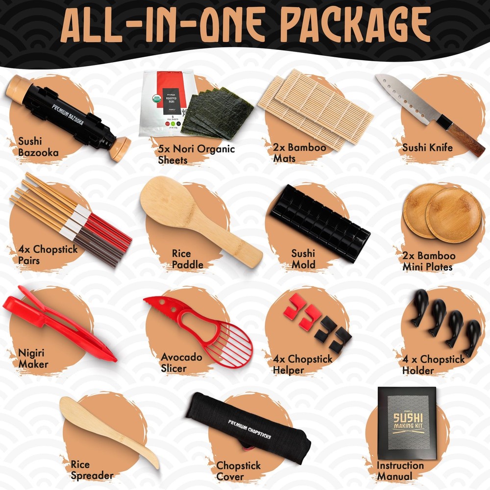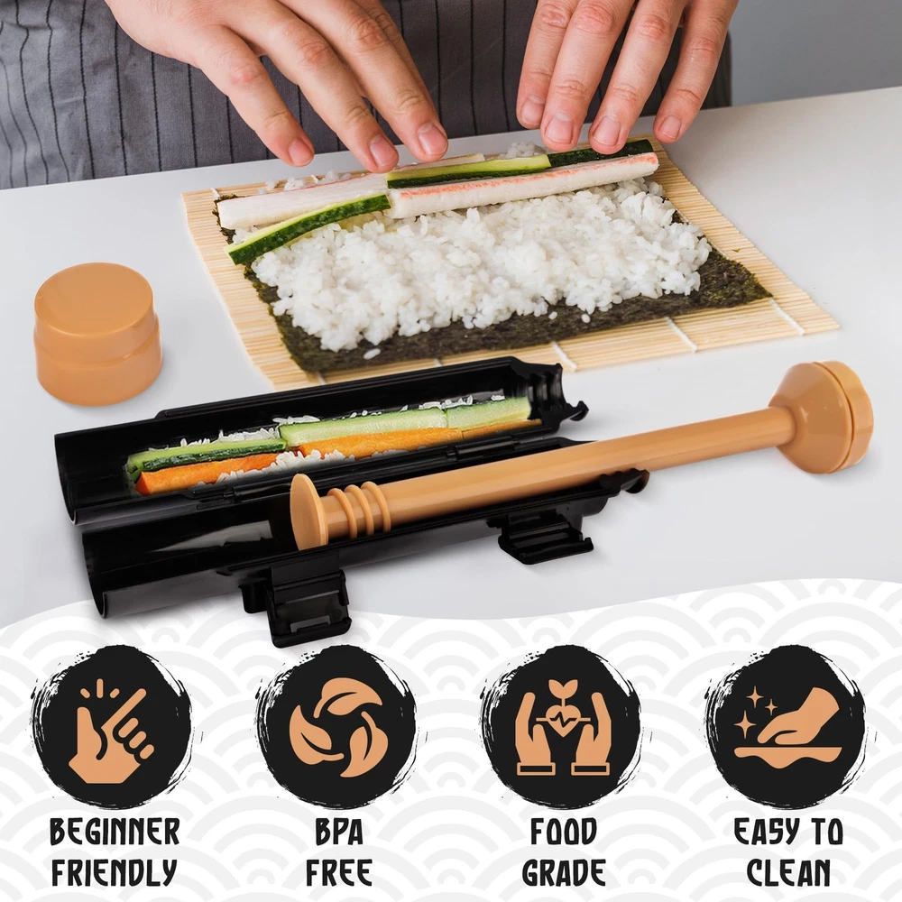 Introducing our Ultimate Sushi Making Kit, the perfect choice for both novice sushi enthusiasts and seasoned pros! Our comprehensive sushi kit includes all the essential tools you need, from the revolutionary bazooka sushi roller kit to the versatile bamboo roller, mat, mold, and sushi making kit for beginners. With this all-in-one package, crafting delicious homemade sushi rolls has never been easier. Crafted with precision and designed for convenience, our sushi maker kit boasts professional-grade tools like the sushi bazooka sushi maker and bamboo sushi rolling mat, ensuring flawless sushi rolling and shaping every time. Ideal for DIY sushi aficionados and beginners alike, our kit offers a seamless experience with user-friendly features like the Sushi Cannon and Sushi Tube. Embarking on your sushi-making journey? Look no further than our sushi kit for beginners, equipped with everything you need to get started. Complete with a comprehensive sushi making set, including a recipe book, sushi mat, and sushi maker roller, this kit sets you up for success from day one. Elevate your sushi-making experience with premium materials and top-notch tools, designed to inspire creativity in the kitchen. Ready to take your sushi game to the next level? Our premium beginner sushi making kit deluxe is tailor-made for discerning sushi enthusiasts. With our professional sushi maker kit, you'll have access to the tools necessary to create restaurant-quality sushi at home. It’s designed to inspire creativity and confidence in the kitchen, making it the perfect choice for sushi gifts for sushi lovers. Whether you're a professional chef or just starting out, this deluxe sushi kit will turn your home into a sushi-making haven. DISCOVER THE ULTIMATE SUSHI-MAKING EXPERIENCE: Dive into sushi creation effortlessly with our comprehensive sushi kit. Perfect sushi maker kit for beginners and sushi lovers, it includes all essentials from sushi bazooka to bamboo rolling mat, ensuring seamless sushi making at home. CRAFT PERFECT SUSHI ROLLS: Say goodbye to uneven rolls with our sushi bazooka kit. Ideal for busy moms, work at home moms, or even food vloggers, this innovative sushi gift for sushi lovers guarantees consistent results, revolutionizing your sushi making game. EMBRACE AUTHENTIC TRADITION WITH BAMBOO MAT: Immerse yourself in sushi-making heritage with our premium Bamboo Sushi Rolling Mat. Crafted from sustainable bamboo, this sushi set offers the perfect surface for precision rolling, ideal for Japanese food lovers and DIY enthusiasts. BEGIN YOUR SUSHI-MAKING JOURNEY: Our sushi making kit for beginners is also perfect for moms seeking culinary adventures. Whether you're experimenting or expanding your repertoire, this kit provides everything you need to create delicious sushi rolls. ELEVATE YOUR SKILLS WITH PRECISION TOOLS: Take your sushi creations to the next level with our bazooka sushi roller kit. Designed for accuracy and convenience, these tools are essential for achieving professional-grade results, catering to beginners and seasoned pros alike.