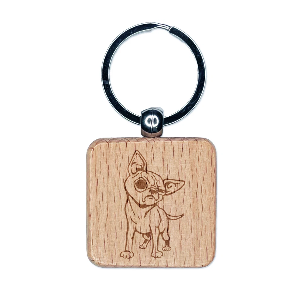 Suspicious Chihuahua Dog Engraved Wood Square Keychain Tag Charm