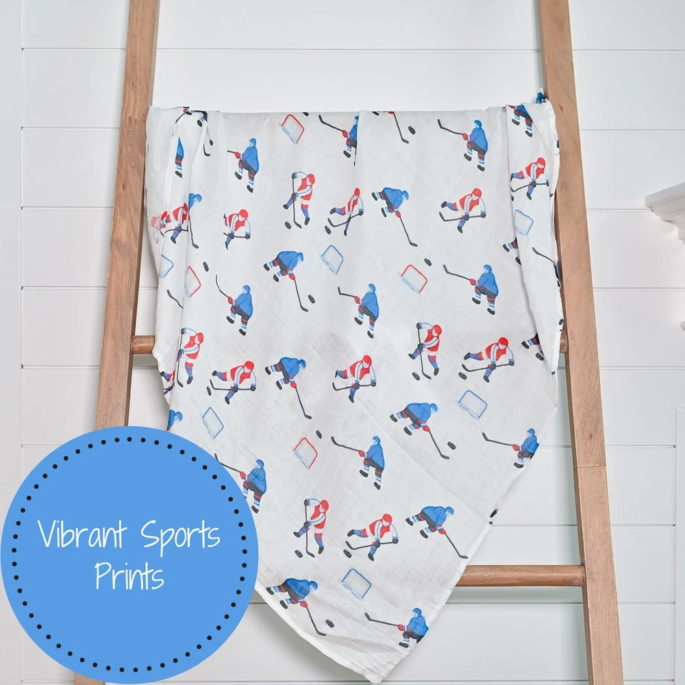 Our Muslin Swaddle Blanket is designed specifically for babies, crafted from 100% premium cotton for softness and breathability. With dimensions of 47x47 inches, it's ideal for wrapping your little one and doubles as a lightweight blanket or crib sheet. Not only that, it enhances nursery decor and serves as a perfect decoration for baby showers. Each blanket features beautifully unique designs meticulously created by our designers. Providing comfort for your baby and adding a touch of warmth and beauty to your baby's space. ICE HOCKEY FAN FAVORITE - Wrap your baby in comfort with our muslin swaddle blanket showcasing the thrilling ice hockey print. It provides a cozy yet breathable environment for your little tumbler. Moms and dads will love receiving these as a baby shower gift or welcome present. SOFT AND COZY BLANKET - Crafted from premium organic cotton, this muslin blanket offers comfort and breathability. Each 47'’ x 47'’ blanket provides enough space to snuggly and securely wrap your newborn. BREATHABLE AND LIGHTWEIGHT - This receiving blanket is made from high quality 100% cotton muslin making it a breathable yet durable blanket that will save as a keepsake from younger months to toddler years PERFECT FOR BURPS, SNUGGLES AND NURSING - This swaddle blanket is perfect to get through your day, use as a burp cloth, for sleep time, to snuggle with, as nursery decor hanging on the crib, or to stuff into your diaper bag for those unavoidable accidents. Toss it in the wash and you're ready to take on a new day. OEKO-TEX CERTIFIED AND EASILY CARE- Our muslin swaddle blankets meet the requirements of Standard 100 by OEKO-TEX. Machine washable, tumble dry at low heat, blankets become softer with each wash.