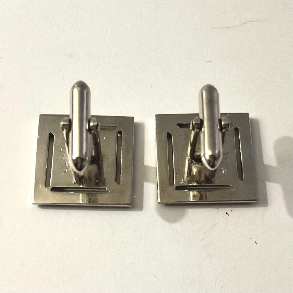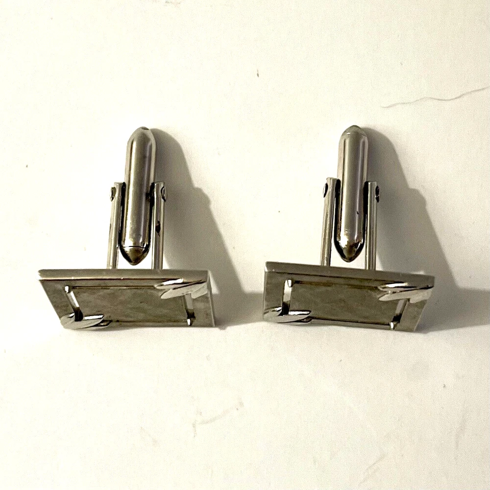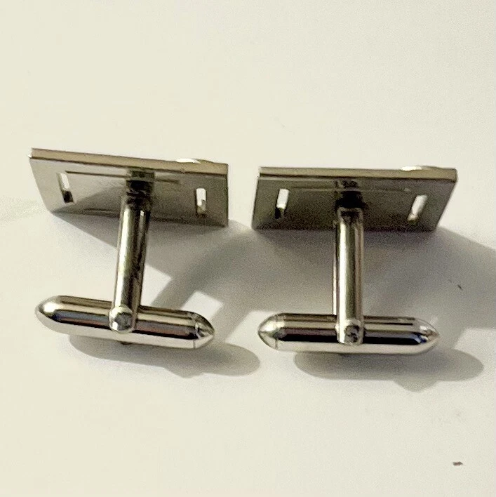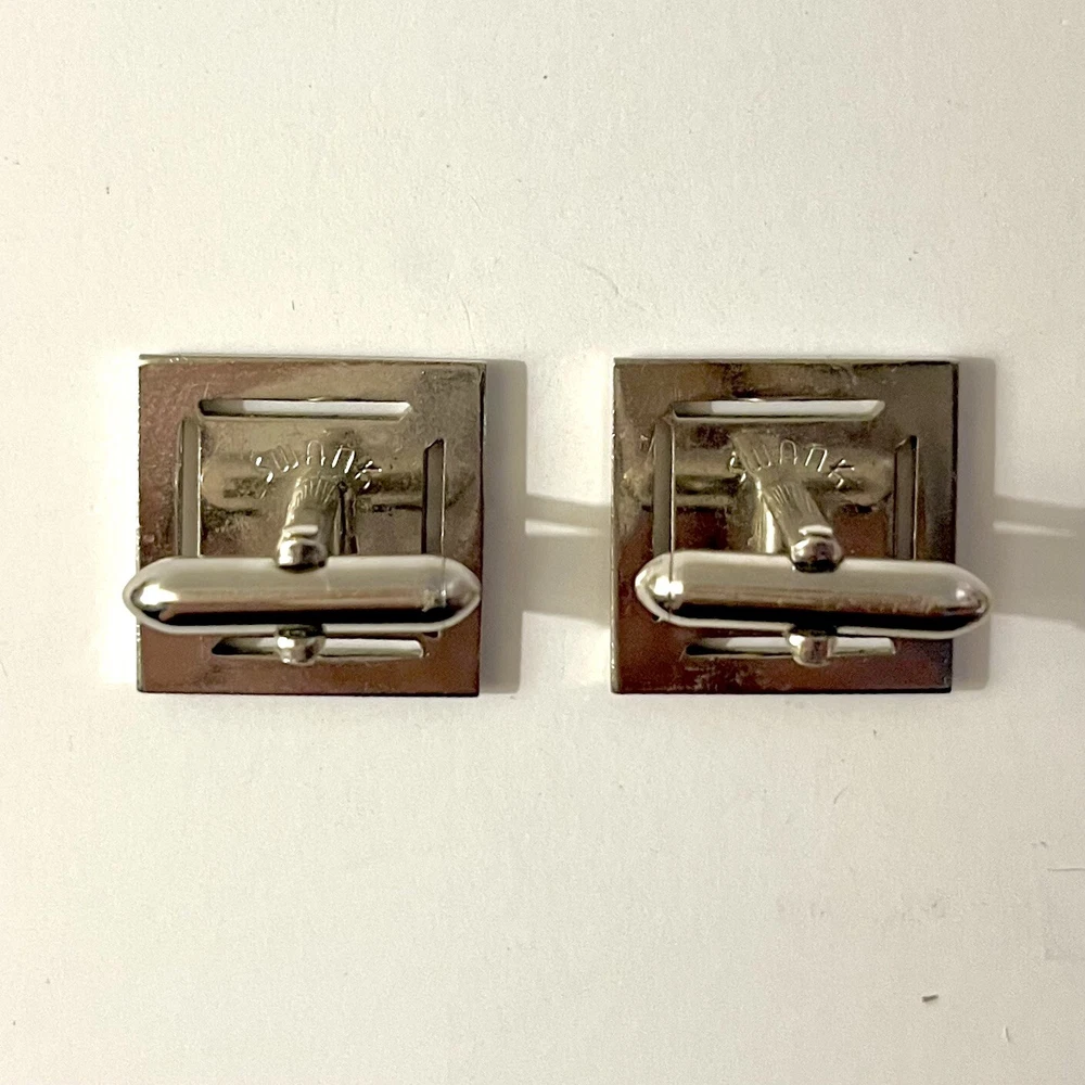 These vintage Swank cufflinks are a classic addition to any man's accessory collection. Made of durable stainless steel with a sleek silver tone, they feature a bullet back style for easy wear and signed for authenticity. These cufflinks are 3/4 inches in length and handcrafted in the United States. Perfect for a personalized touch, they can be a great gift for any man who appreciates timeless elegance. Size: 3/4” Condition: Great pre-owned, vintage condition.