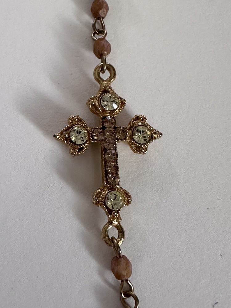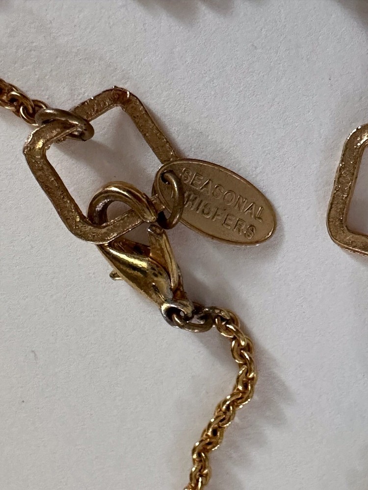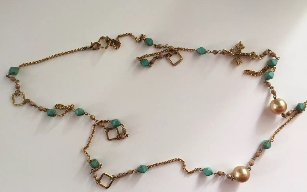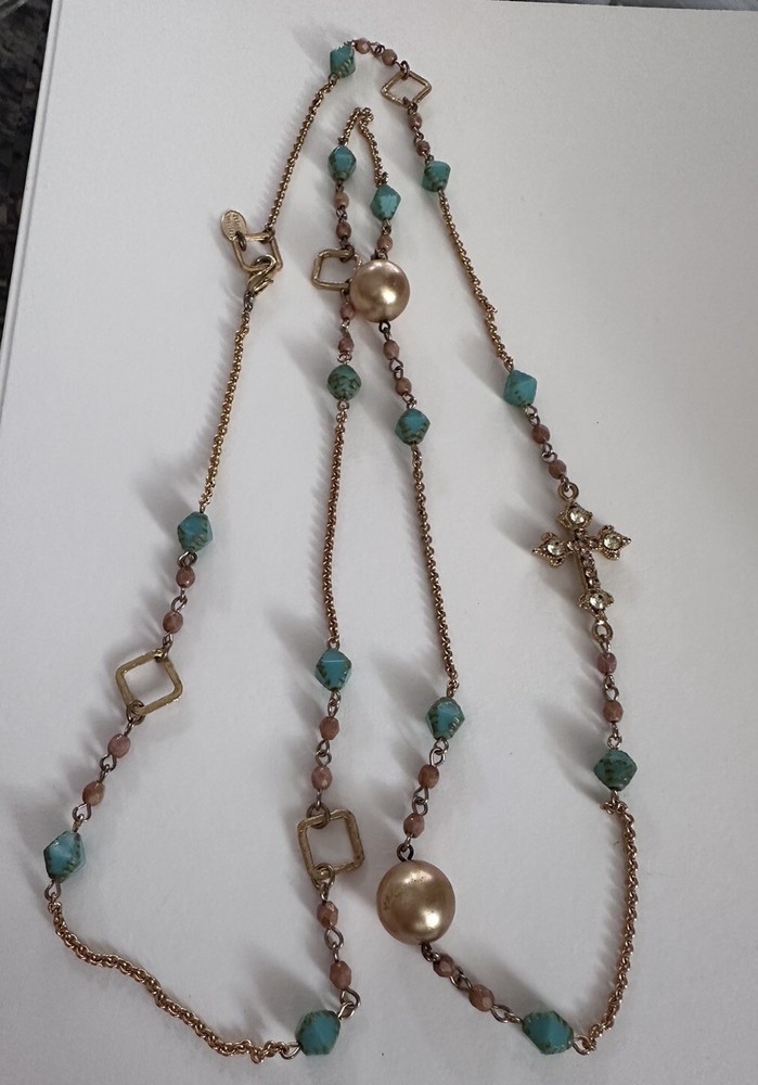This is a lovely 40-inch long gold-tone chain necklace with a cross-shaped pendant made by Seasonal Whispers. The necklace is adorned with faux turquoise , Swarovski crystal embellished cross and 2 gold beads. The necklace has a lobster clasp closure and is signed by the brand. It falls under the category of fashion jewelry and is perfect for adding a touch of elegance to any outfit.