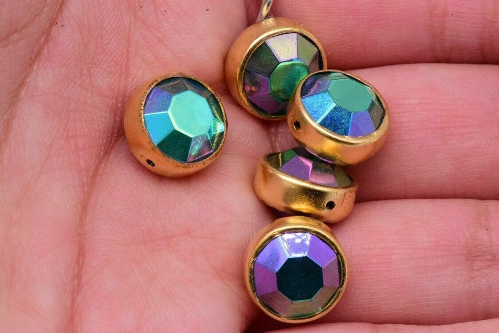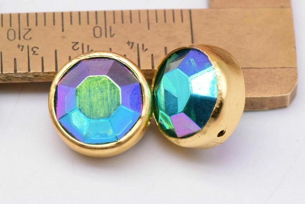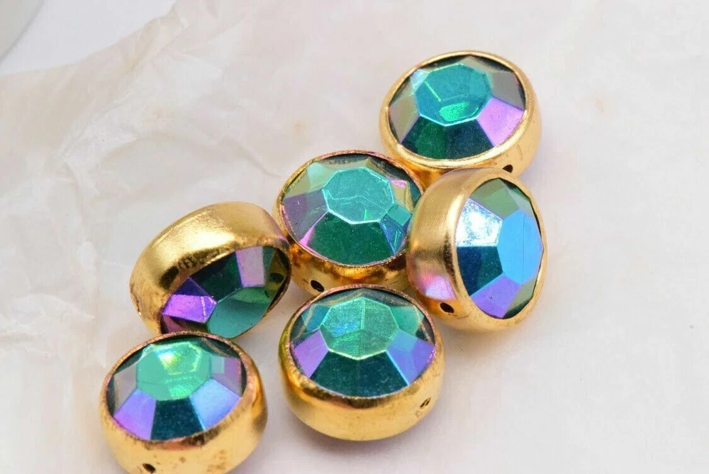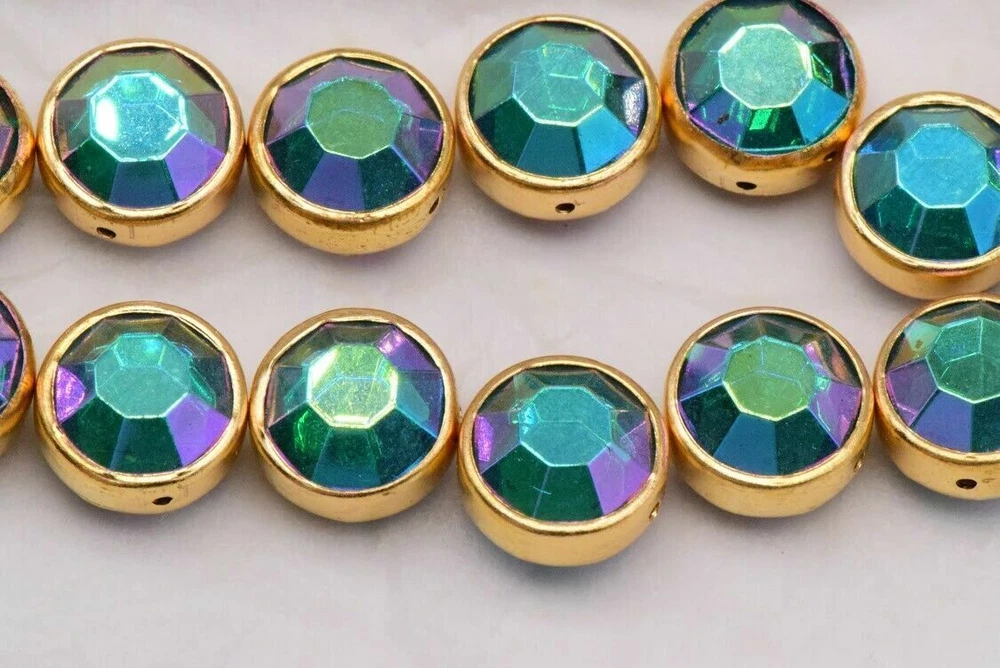 Glass Aurora Borealis Emerald & Gold Rondelle Beads Faceted 12 mm Vintage Please view all photos Since We Offer Free Shipping On Orders $50.00 PLUS, Ebays System Doesn't Combine Shipping On Smaller Orders. (They State That It Is Working The way It Is Suppose Too ;-( ) We ONLY Charge $5.99 For 1st. Item & .99 each Additional Item. Please Pay In Full & We Will REFUND The All The Shipping Overages. Just Send Us A Note To Confirm. Thank You For Your Business!!