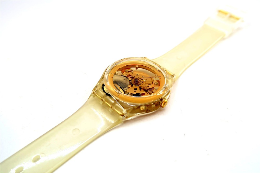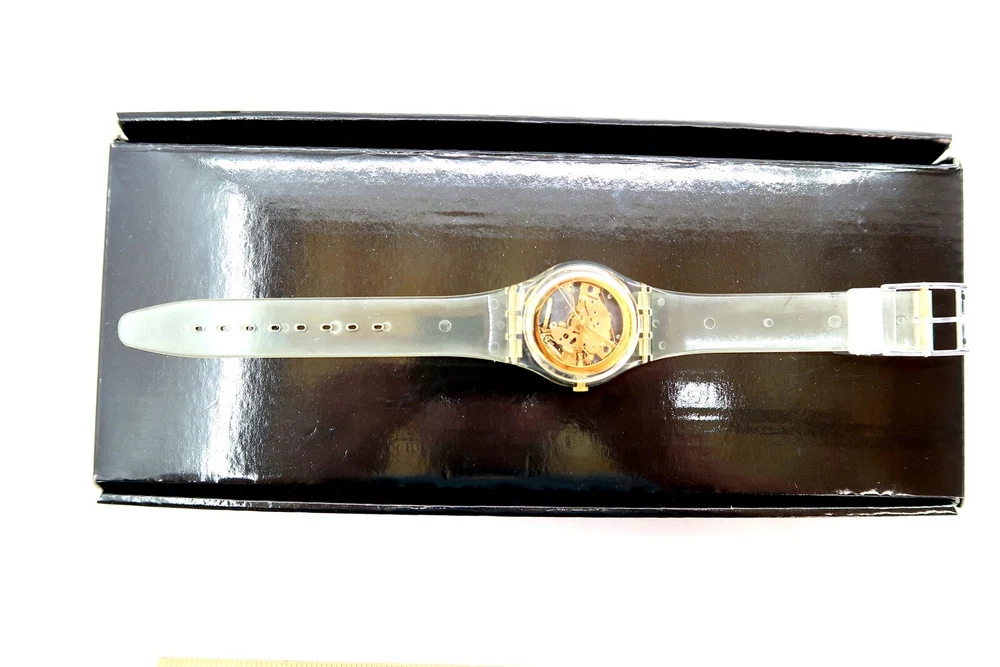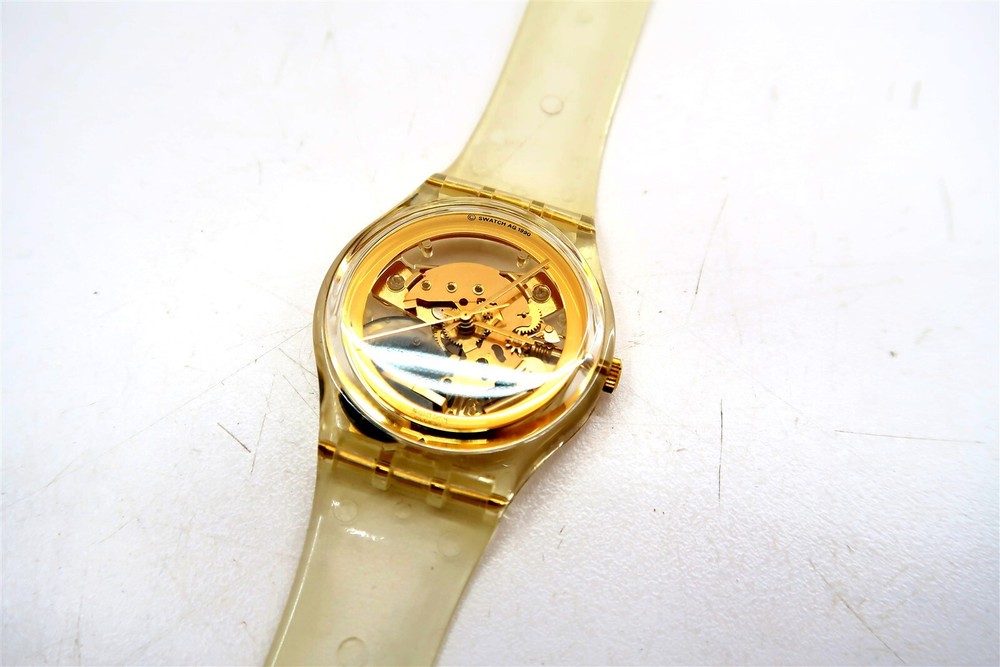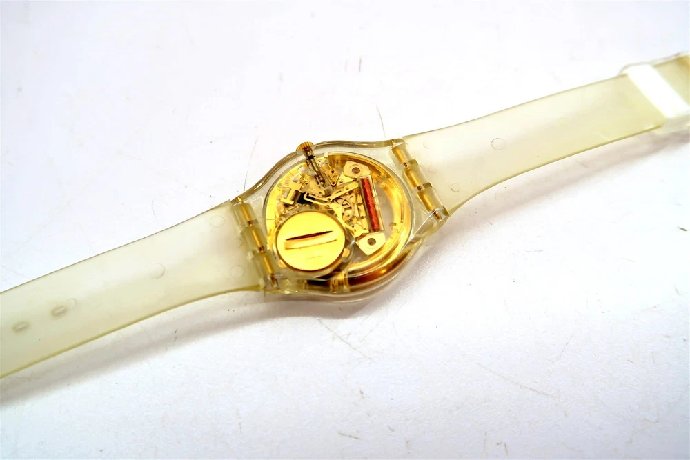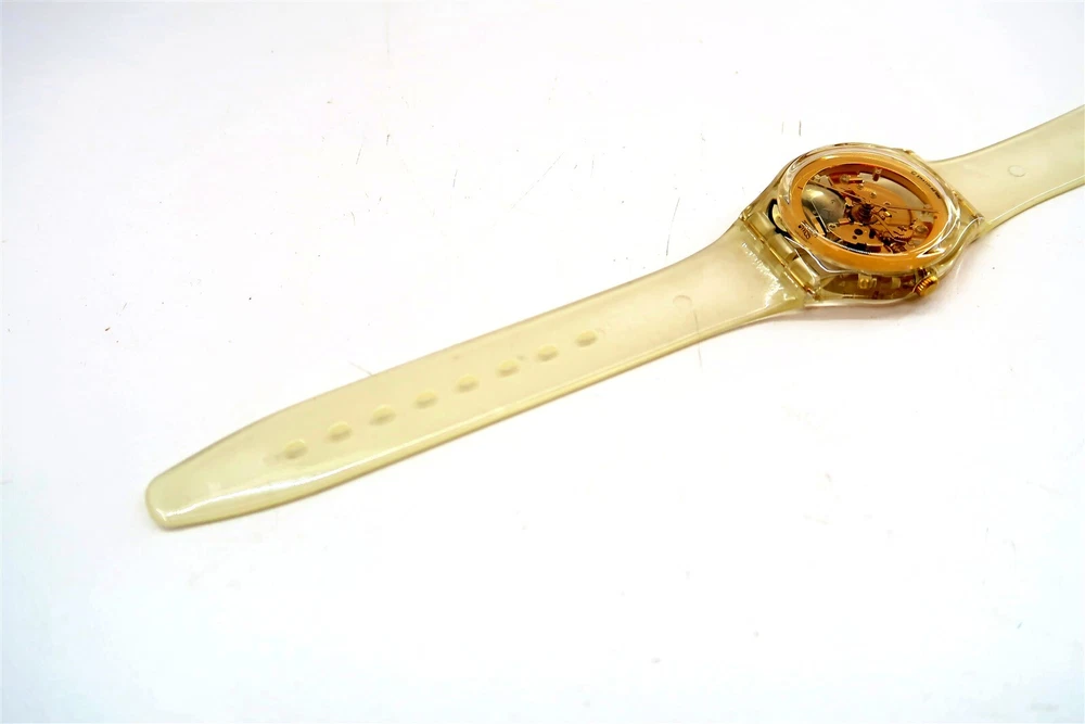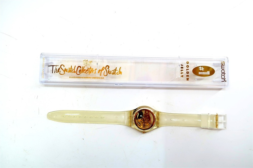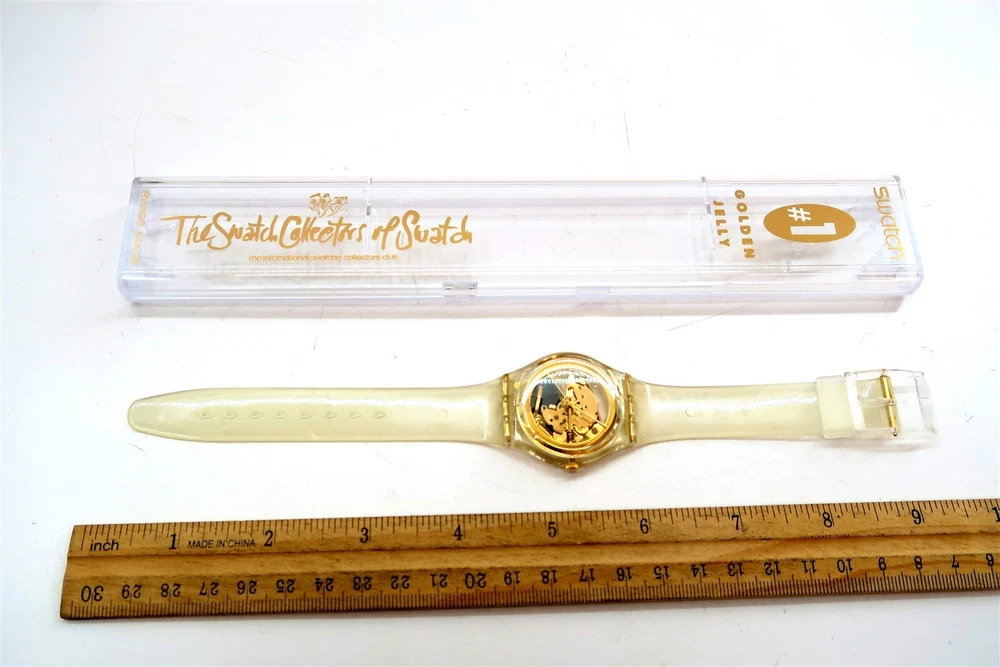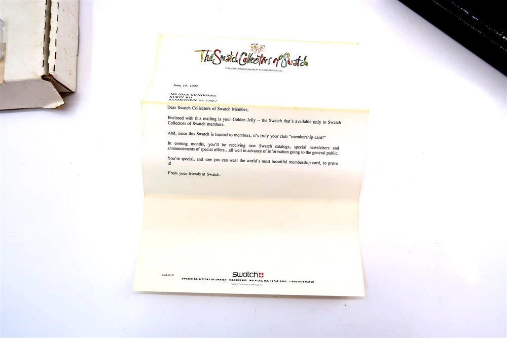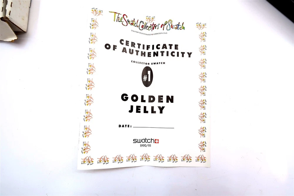 Swatch Watch #1 GOLDEN JELLY New NOS 1991 Limited Edition Club Set + COA (n2) This eBay listing is for a New Old Stock classic SWATCH WATCH that comes as you see pictured in the listing and noted above. This watch is brand new and never used before and comes with the original case and paperwork. If you collect classic Swatch Watches, then please check out my other listings in my ebay store for many more great Swatches!! I just picked up close to 800 NOS Swatches from a local auction where I'm told the consignor had one of the largest Swatch watch collection in the United States. This was their 3rd and final auction of Swatches. In total, I purchased close to 1500+ Swatches!! Many of the watches are Special Editions, Limited Editions, Boxed Sets, Scarce and rare models plus other vintage Swatches as well. I will remove all of the old Swatch batteries and will replaced them with brand new batteries to verify that they are all are all in good working condition unless noted below. Please note that vintage and retro Swatches are on the smaller size compared to modern style watches. Most standard Gents (mens) watches have a 33mm-34mm case. I will try to include a picture with each new listing showing the watch next to a standard ruler so that you can see the true size of this collectible Swatch watch. Swatch name : #1 GOLDEN JELLY The Swatch Collectors of Swatch club edition Model : Golden Jelly New Battery : Yes (due to age, the original battery was removed with a new battery installed) Original golden battery is included but it's no longer holding a charge Features/Notes : Works Great! Circa 1990/1991 as noted on the COA. The letter found inside the shipping box is dated from 1992. Limited Edition set only available to Club Members of Swatch. NOTE: The inner black box shows wear. Seller Location Reference - Box 207 BID IN CONFIDENCE – CHECK MY FEEDBACK! My goal is your satisfaction. I leave positive feedback right after the payment is received for all orders!! If you plan to leave anything less than positive feedback and 5 stars - please let me know so that I can work out any problems that you may have. I aim to please!! SHIPPING & HANDLING FOR US BIDDERS We ship ASAP upon payment as noted above within 1 business day 99% of the time!! We normally pack up your new treasures 2 - 3 times a day and ship using USPS and Fedex Ground so that you get your items in a timely fashion. As always - there is no charge for local pickup on any of my items!! SHIPPING AND HANDLING FOR INTERNATIONAL BIDDERS Import duties, taxes and charges are not included in the item price or shipping charges. These charges are the buyer’s responsibility. Please check with your country’s customs office to determine what these additional costs will be prior to bidding/buying.” THANK YOU AND HAVE A WONDERFUL DAY!! Powered by SixBit's eCommerce Solution