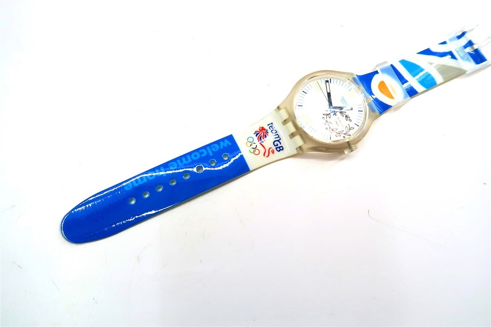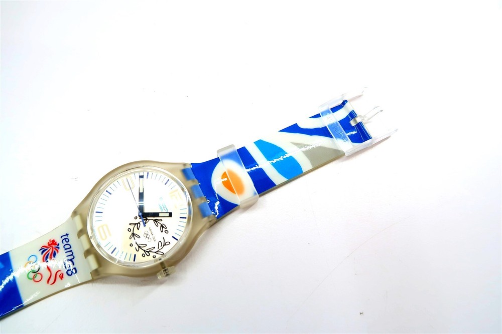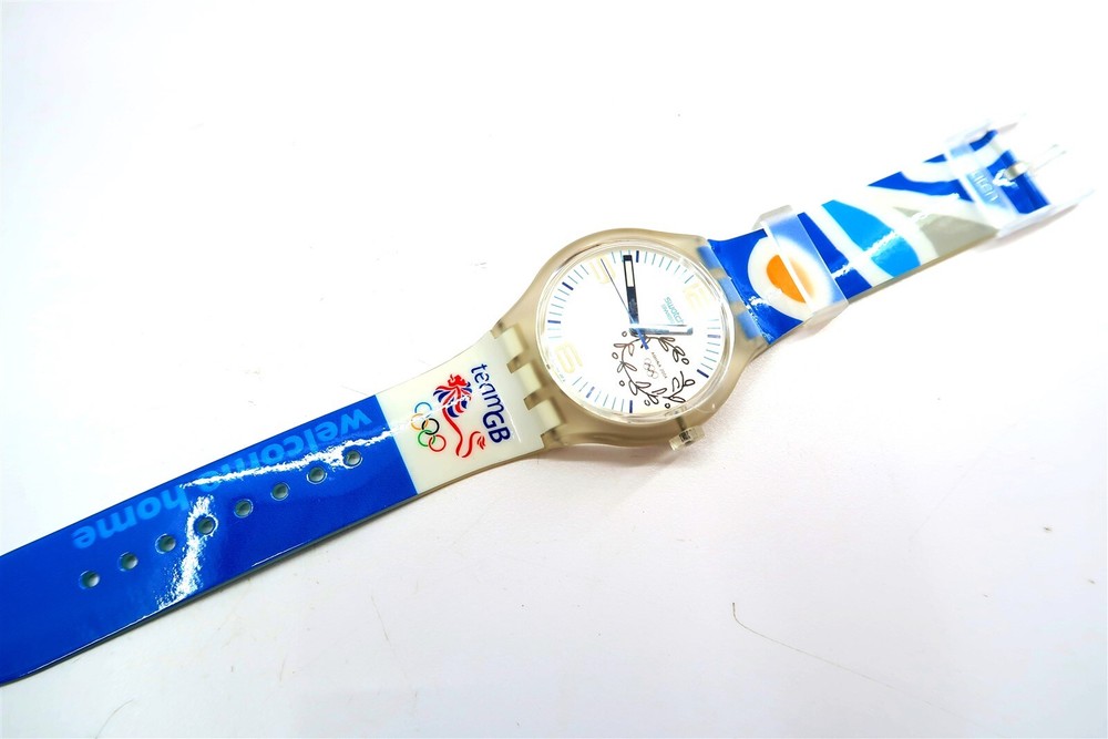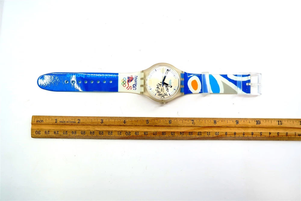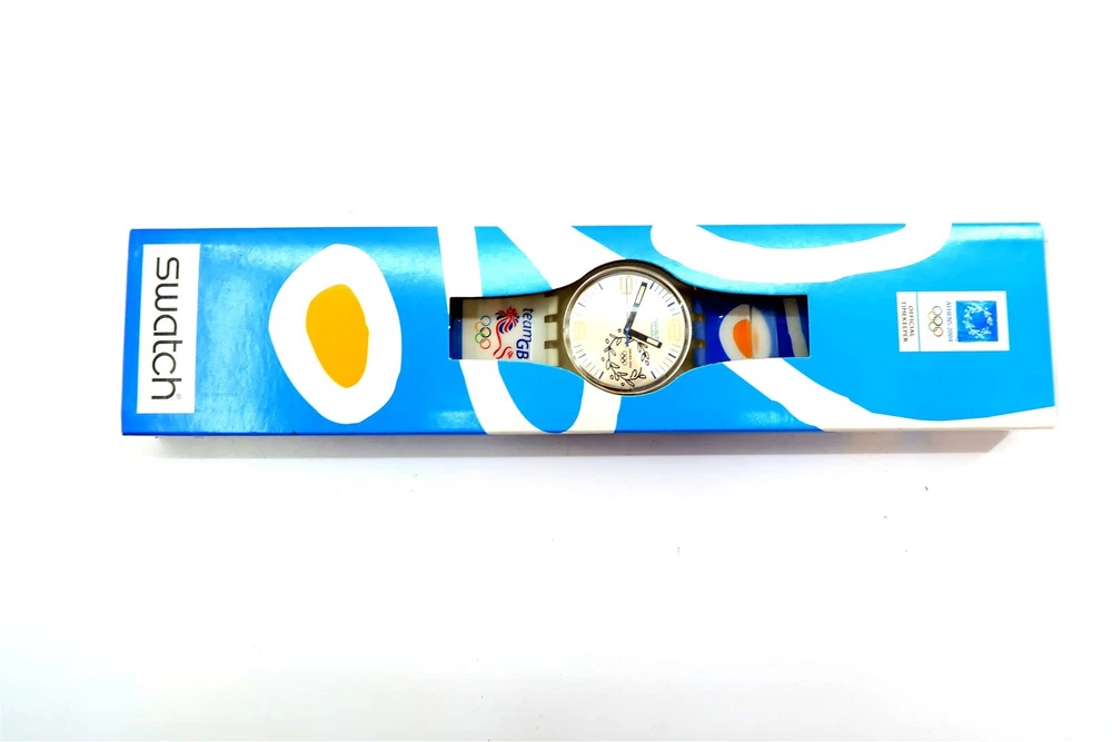 NEW Swatch Watch NOC UNITED KINGDOM SUDK106S 2004 Athens Olympic Games X-Large This eBay listing is for a New Old Stock classic SWATCH WATCH that comes as you see pictured in the listing and noted above. This watch is brand new and never used before and comes with the original case and paperwork. If you collect classic Swatch Watches, then please check out my other listings in my ebay store for many more great Swatches!! I just picked up close to 800 NOS Swatches from a local auction where I'm told the consignor had one of the largest Swatch watch collection in the United States. This was their 3rd and final auction of Swatches. In total, I purchased close to 1500+ Swatches!! Many of the watches are Special Editions, Limited Editions, Boxed Sets, Scarce and rare models plus other vintage Swatches as well. I will remove all of the old Swatch batteries and will replaced them with brand new batteries to verify that they are all are all in good working condition unless noted below. Please note that vintage and retro Swatches are on the smaller size compared to modern style watches. Most standard Gents (mens) watches have a 33mm-34mm case. I will try to include a picture with each new listing showing the watch next to a standard ruler so that you can see the true size of this collectible Swatch watch. Swatch name : NOC UNITED KINGDOM (at least that is what I think this one is since it says Team GB with the British flag) Model : SUDK106S New Battery : Yes (due to age, the original battery was removed with a new battery installed) Features/Notes : Works Great! Circa 2004. Seller Location Reference - Box 94A BID IN CONFIDENCE – CHECK MY FEEDBACK! My goal is your satisfaction. I leave positive feedback right after the payment is received for all orders!! If you plan to leave anything less than positive feedback and 5 stars - please let me know so that I can work out any problems that you may have. I aim to please!! SHIPPING & HANDLING FOR US BIDDERS We ship ASAP upon payment as noted above within 1 business day 99% of the time!! We normally pack up your new treasures 2 - 3 times a day and ship using USPS and Fedex Ground so that you get your items in a timely fashion. As always - there is no charge for local pickup on any of my items!! SHIPPING AND HANDLING FOR INTERNATIONAL BIDDERS Import duties, taxes and charges are not included in the item price or shipping charges. These charges are the buyer’s responsibility. Please check with your country’s customs office to determine what these additional costs will be prior to bidding/buying.” THANK YOU AND HAVE A WONDERFUL DAY!! Powered by SixBit's eCommerce Solution