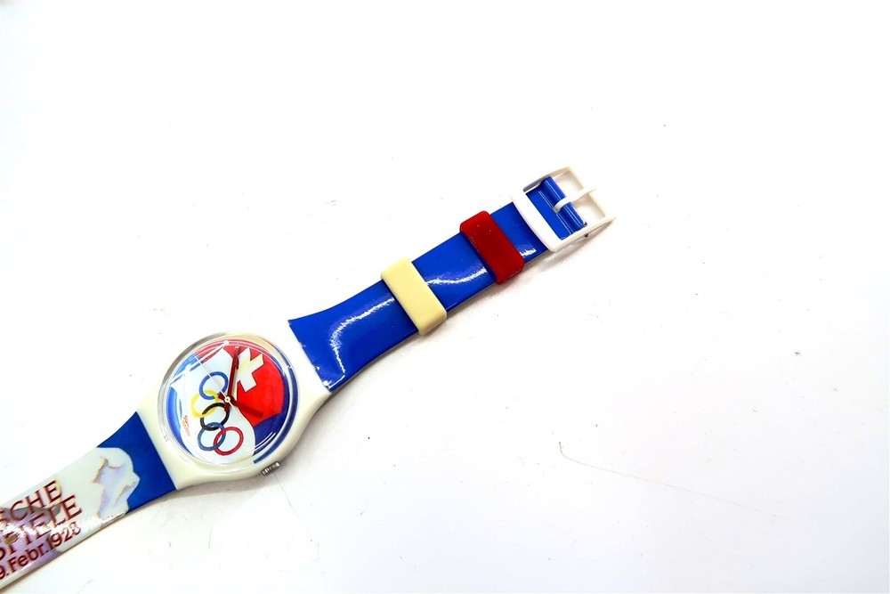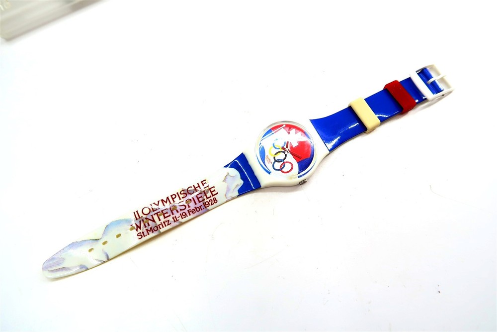 NEW Swatch Watch ST MORITZ 1928 GZ134 Olympic Special Edition Gents 1994 This eBay listing is for a New Old Stock classic SWATCH WATCH that comes as you see pictured in the listing and noted above. This watch is brand new and never used before and comes with the original case and paperwork. If you collect classic Swatch Watches, then please check out my other listings in my ebay store for many more great Swatches!! I just picked up close to 800 NOS Swatches from a local auction where I'm told the consignor had one of the largest Swatch watch collection in the United States. This was their 3rd and final auction of Swatches. In total, I purchased close to 1500+ Swatches!! Many of the watches are Special Editions, Limited Editions, Boxed Sets, Scarce and rare models plus other vintage Swatches as well. I will remove all of the old Swatch batteries and will replaced them with brand new batteries to verify that they are all are all in good working condition unless noted below. Please note that vintage and retro Swatches are on the smaller size compared to modern style watches. Most standard Gents (mens) watches have a 33mm-34mm case. I will try to include a picture with each new listing showing the watch next to a standard ruler so that you can see the true size of this collectible Swatch watch. Swatch name : ST MORITZ 1928 Model : GZ134 New Battery : Yes (due to age, the original battery was removed with a new battery installed) Features/Notes : Works Great! Circa 1994. Seller Location Reference - Box 94A BID IN CONFIDENCE – CHECK MY FEEDBACK! My goal is your satisfaction. I leave positive feedback right after the payment is received for all orders!! If you plan to leave anything less than positive feedback and 5 stars - please let me know so that I can work out any problems that you may have. I aim to please!! SHIPPING & HANDLING FOR US BIDDERS We ship ASAP upon payment as noted above within 1 business day 99% of the time!! We normally pack up your new treasures 2 - 3 times a day and ship using USPS and Fedex Ground so that you get your items in a timely fashion. As always - there is no charge for local pickup on any of my items!! SHIPPING AND HANDLING FOR INTERNATIONAL BIDDERS Import duties, taxes and charges are not included in the item price or shipping charges. These charges are the buyer’s responsibility. Please check with your country’s customs office to determine what these additional costs will be prior to bidding/buying.” THANK YOU AND HAVE A WONDERFUL DAY!! Powered by SixBit's eCommerce Solution