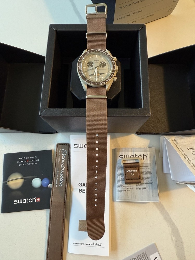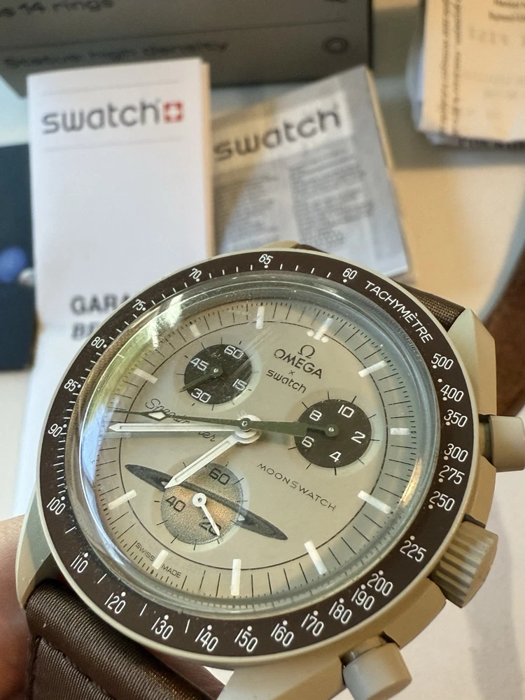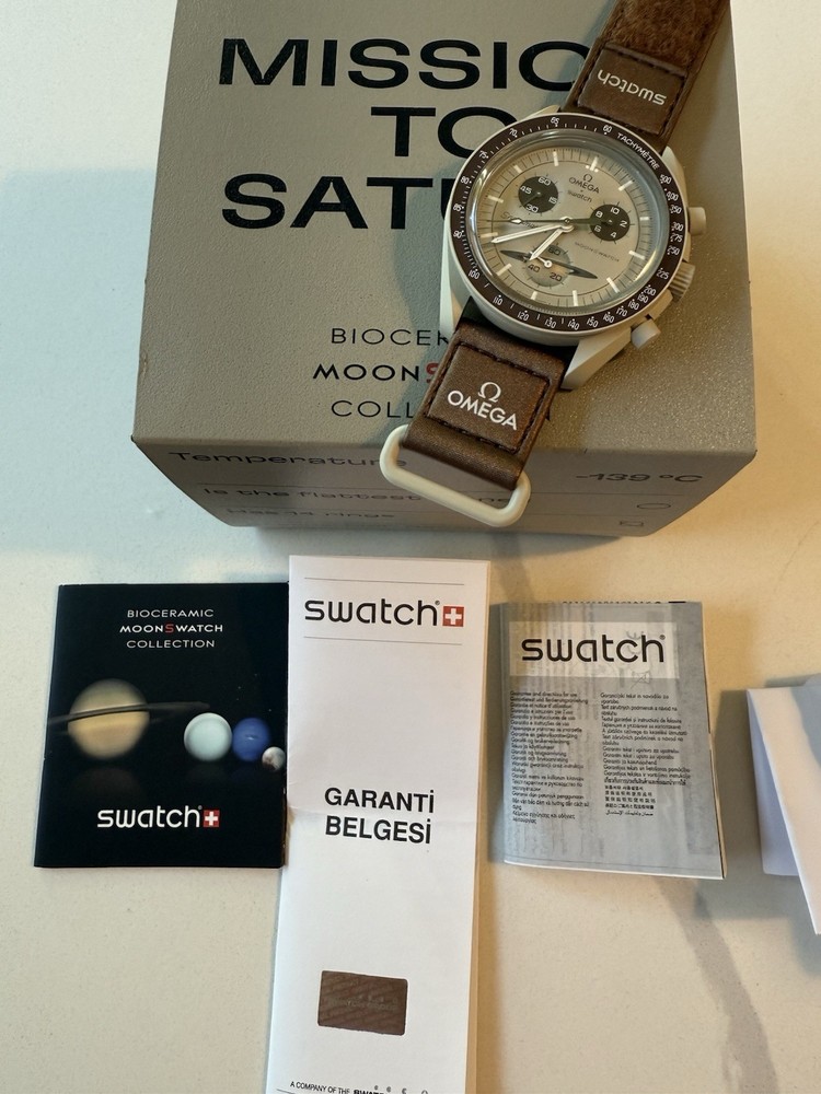 The Swatch x Omega Bioceramic Moonswatch Mission To Saturn 42 mm Beige is a luxurious and sporty wristwatch designed for men or women Featuring a beige case color and brown bezel and band, this timepiece exudes a sophisticated and stylish appeal. With Swiss-made quartz movement, water resistance up to 30 meters, and a chronograph feature, this watch is both practical and reliable for everyday wear. The unique design, including stick and baton indexes, tachymeter bezel, and snap caseback, sets it apart as a timeless and high-quality accessory for any occasion. There is one minor scratch on the dial (see pictures). It is barely noticeable. I will also include the extra brown nato strap as well. This has been worn less than 10 times.