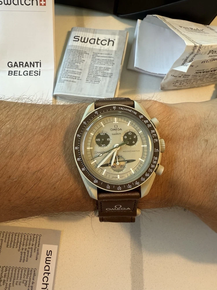 This watch is a total game-changer! The sleek beige and brown combo gives off such a cool, retro-futuristic vibe while feeling super lightweight and comfy on the wrist. I love how it blends Omega's luxury heritage with Swatch's playful spirit - the Saturn-themed details on the dial and tachymeter bezel are such fun touches. The bioceramic material makes it surprisingly durable for daily wear, and the chronograph function works like a dream. It's gotten me so many compliments already - perfect for watch lovers who want something unique without breaking the bank!