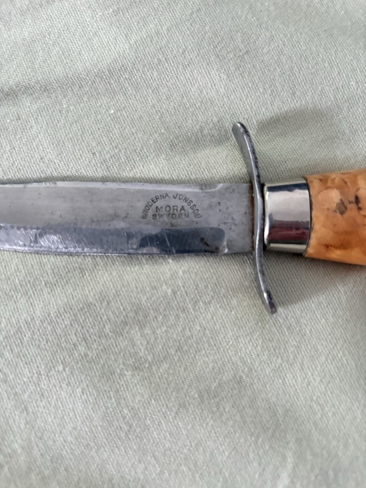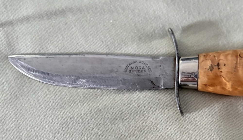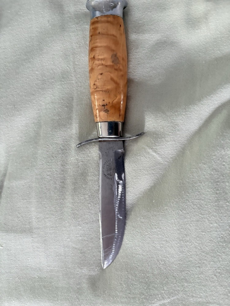Beautiful, authentic Broderna Jonsson Swedish scout knife from their facility in Mora. Blade has a slight left curve, but all is tight on the full tang. Amazing, and actually sharp.