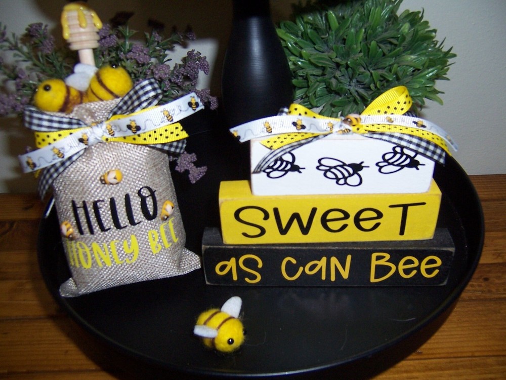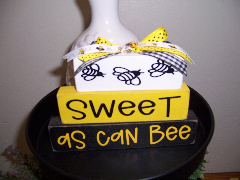 This listing is for sweet as can bee stacked sign. 4 inches tall x 6 inches long. Perfect for trays or to place on a shelf. Small size sign to use in trays. Staging decor not included. Permanent vinyl is used on signs. Sign has bow on it with a little bee on it. The wood is painted yellow , white and black then design is added to it.This is sanded around the edges to give a rustic look. All my items take up to 5 days to make.Everything is made after I receive payment. IF YOU HAVE A PROBLEM WITH YOUR PURCHASE PLEASE MESSAGE ME BEFORE YOU LEAVE FEEDBACK. Thanks so much for looking.Check out the rest of my things.