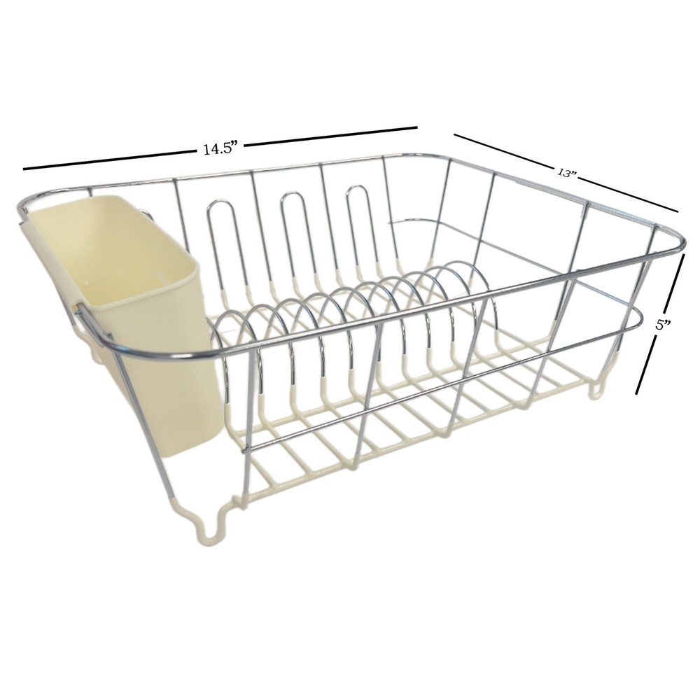 Two Piece Compact Small Dish Drainer set To fit smaller sink areas. Vinyl coated on the bottom portion to help resist rusting and protect dishes. Set includes: Dish Drainer and Cutlery Holder Small size drainer with slots to hold up to 8 DIshes Detachable Cutlery Tray Materials: Metal/plastic Dimensions: 12" x 14.5 x 5" Free Shipping Over $49.99* Details Sweet Home Collection Chrome Plated Steel Small 2 Piece Dish Drainer Product Description: Two Piece Compact Small Dish Drainer set To fit smaller sink areas. Vinyl coated on the bottom portion to help resist rusting and protect dishes. Set includes: Dish Drainer and Cutlery Holder Small size drainer with slots to hold up to 8 DIshes Detachable Cutlery Tray MaterialsMetal/plastic Dimensions12" x 14.5 x 5"