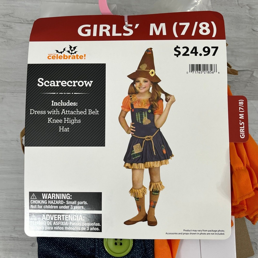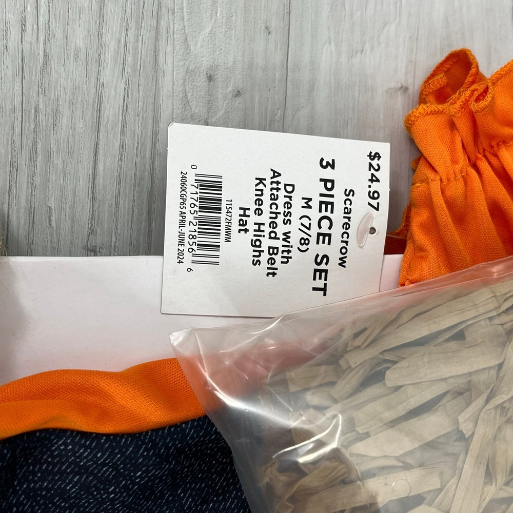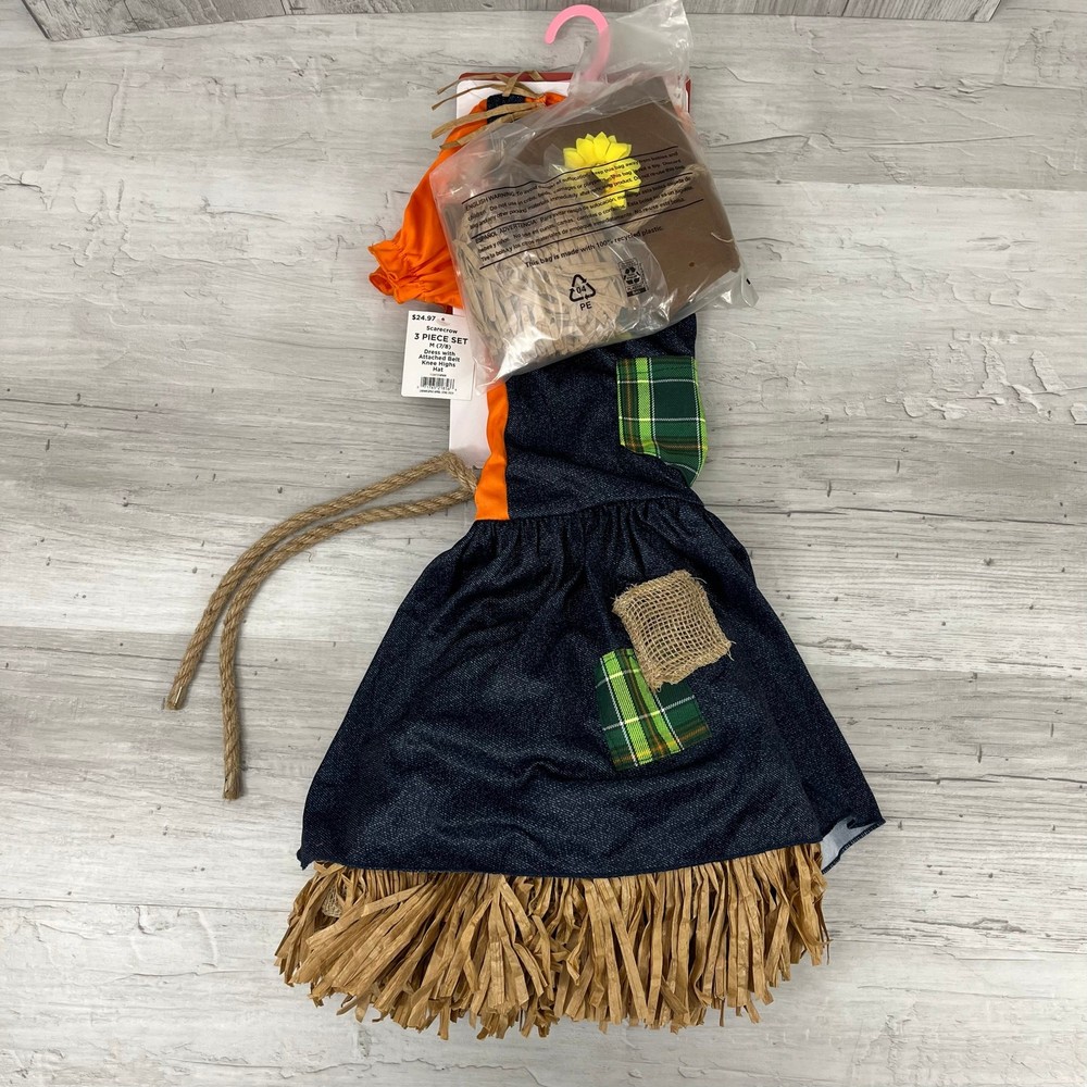 Sweet Scarecrow Girls Halloween Dress Up 3 Piece Costume Size: Medium 7/8 Includes: Dress with attached belt Knee highs Hat Colors may differ based on others computer/phone/etc settings All pre owned items have been washed and steamed All pre owned items have been looked over for flaws and will be noted in listing