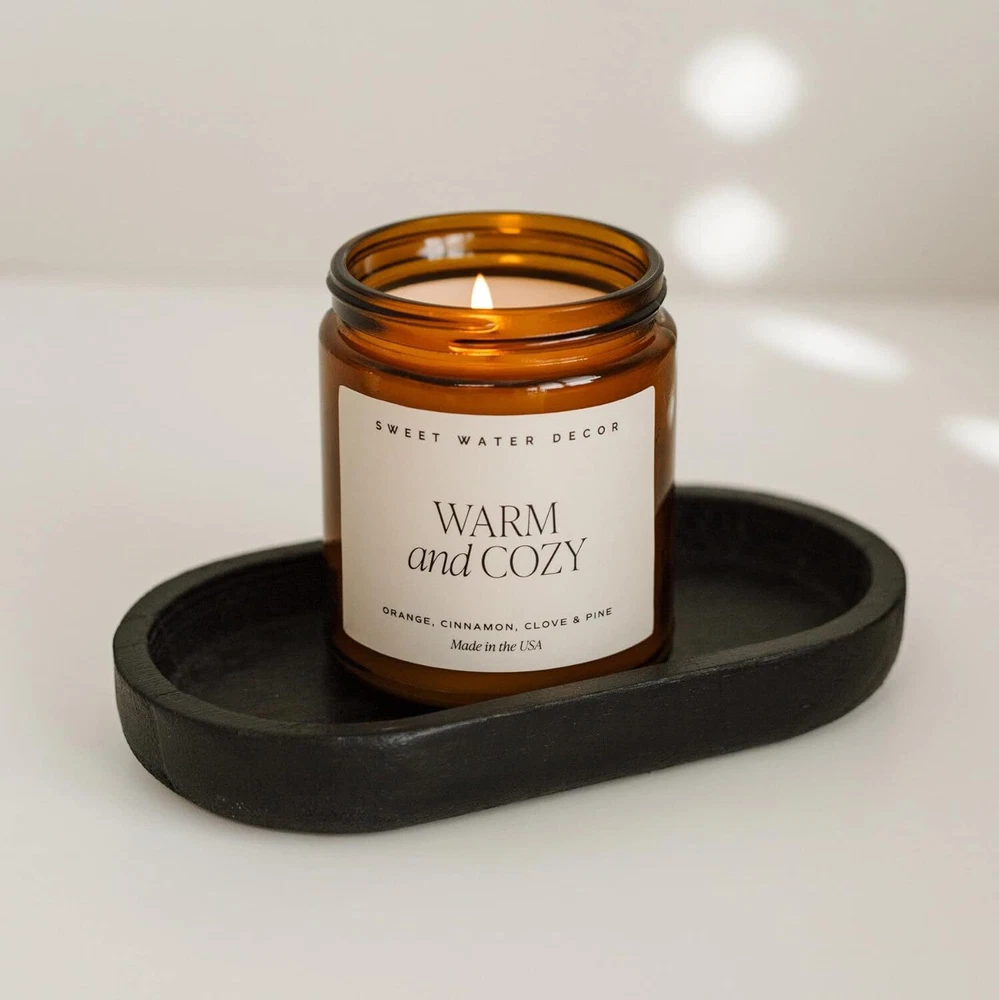 Sweet Water Decor Warm and Cozy Soy Candle - Orange Tan Label, Cream Label Product Details Production Method: Our candles are made to be gluten, lead, and phthalate free with American grown soy wax blend. They are all poured in Pittsburgh, PA, USA. Size: Tan Label Width: 2.75 inches Height: 2.75 inches Length: 3.5 inches Color: Cream Label Material: Soy Wax Blend Scent: Warm + Cozy Package Dimensions : 4.53 x 4.17 x 4.17 inches; 14.89 ounces SMELLS LIKE - Let warm and inviting scent notes of orange peel, cinnamon, ginger, clove, cypress, vetiver, pine, and fir balsam fill your home this holiday season. This cozy winter candle will transform your space into a festive wonderland. It's the perfect fall to winter candle that can be enjoyed throughout the end of the year. CANDLE INFO - 9oz Amber Candle Jar with Black Lid | Jar Size: 2.75 x 2.75 x 3.5" | 208g Net Weight | 40+ Hour Burn Time CANDLE CARE - Trim your wick to 1/4" before candle is lit each time to prevent soot. Burn candle so wax pool reaches the jar edge each time to prevent wax tunneling. Burn candle no more than 4 hours at a time. Do not burn candle with less than a 1/2" of wax remaining. Keep candle away from fans, open windows, hot surfaces, children, pets. Never leave a burning candle unattended PERFECT CHRISTMAS GIFT - Share the warmth of the season with our soy Christmas candle, the perfect Christmas gift for moms, sisters, friends, and co-workers. Whether you’re looking for a thoughtful stocking stuffer, a unique hostess gift, a fun secret Santa gift, or a memorable white elephant gift, this candle is an ideal choice. STYLISH HOLIDAY CANDLE - Our holiday soy candles combine functionality with style, seamlessly blending into any holiday decor, whether your space is rustic, modern, or farmhouse chic. Perfect for any room, these candles add a warm, inviting glow while complementing your festive decor.