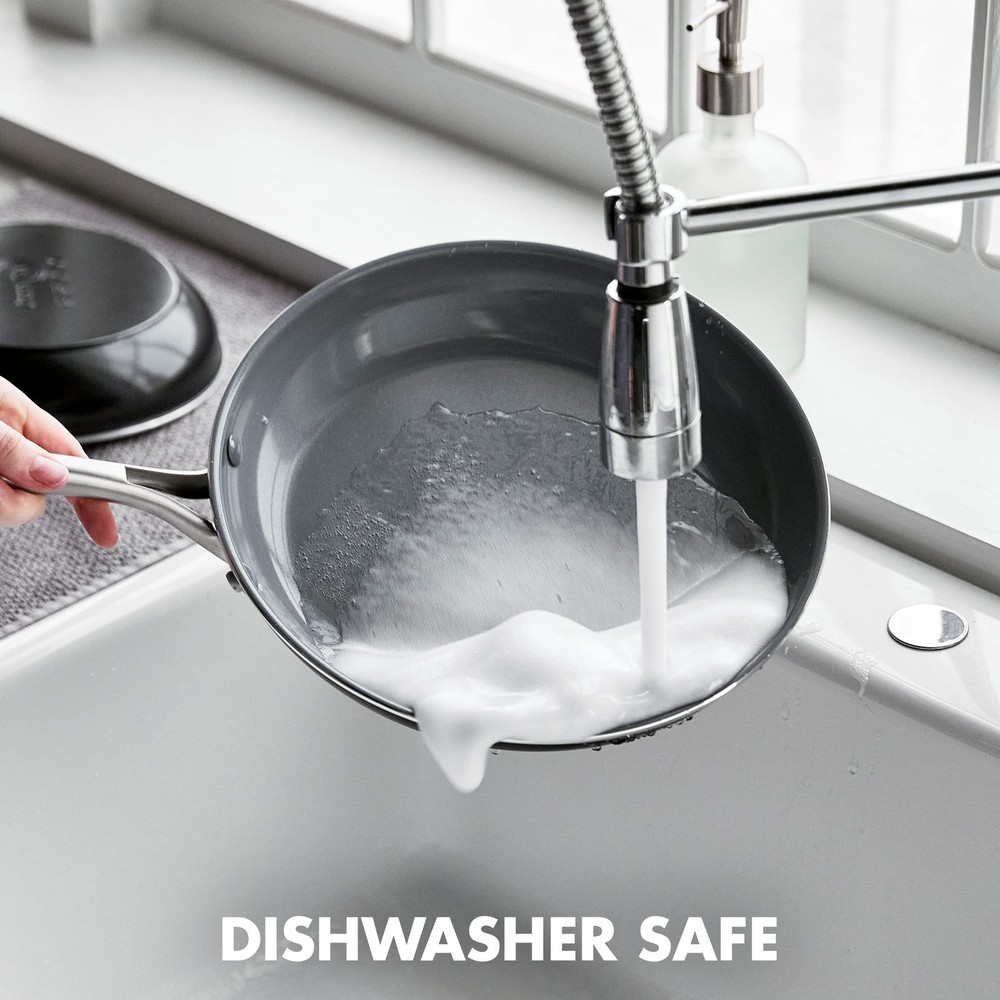 REINFORCED WITH DIAMONDS: Metal utensil safe, 's original diamond-infused nonstick coating offers remarkable durability, balanced heating, and effortless cleanup. TOXIN-: 's Thermolon healthy ceramic nonstick coating is of PFAS, PFOA, lead, and cadmium TOUGH ALUMINUM BODIES: The heavy-duty aluminum construction offers extreme strength with quick and even heating every single time. BUILT FOR OVEN COOKING: Oven and broiler safe up to 600°F and suitable for all stovetops, except induction. ERGONOMIC HANDLES: This set’s riveted stainless steel handles offer a sturdy; comfortable grip EASY TO CLEAN: These pans are dishwasher safe for easy cleanup, but most messes will wipe clean.