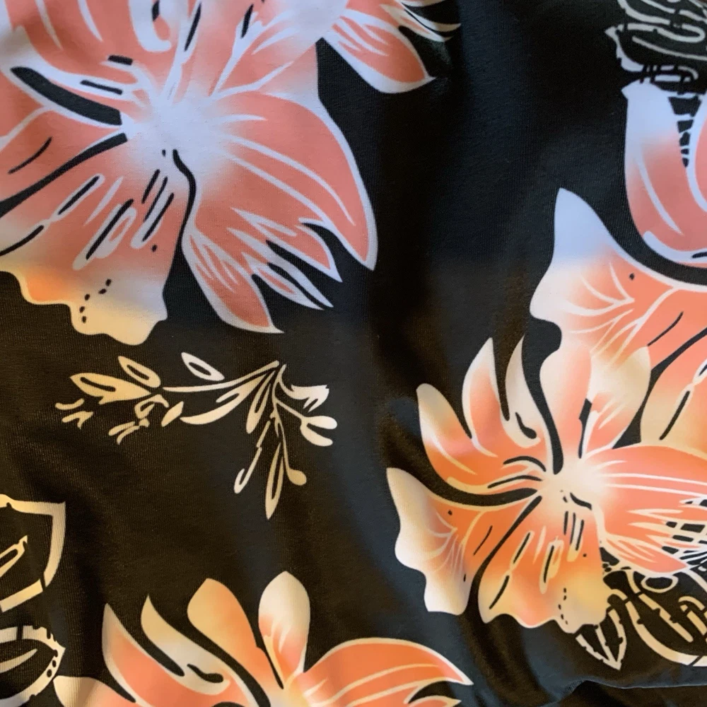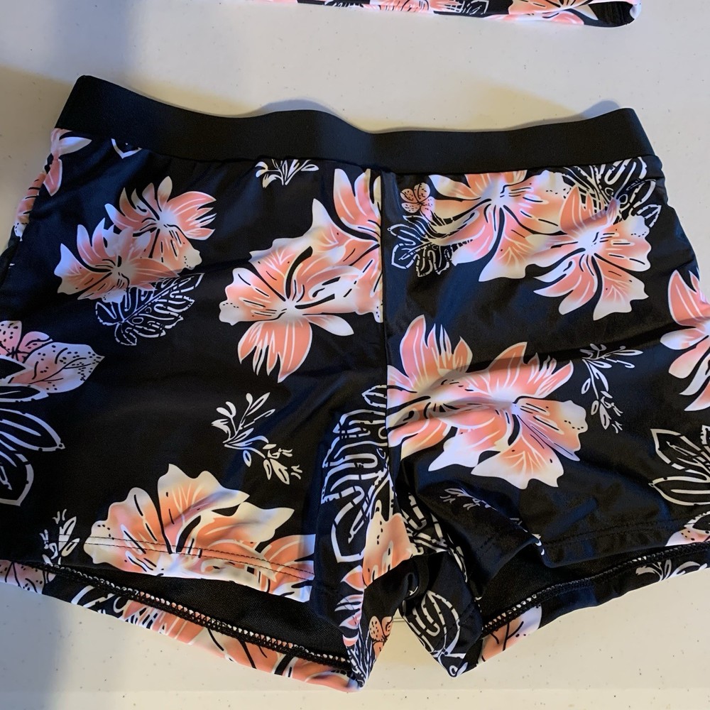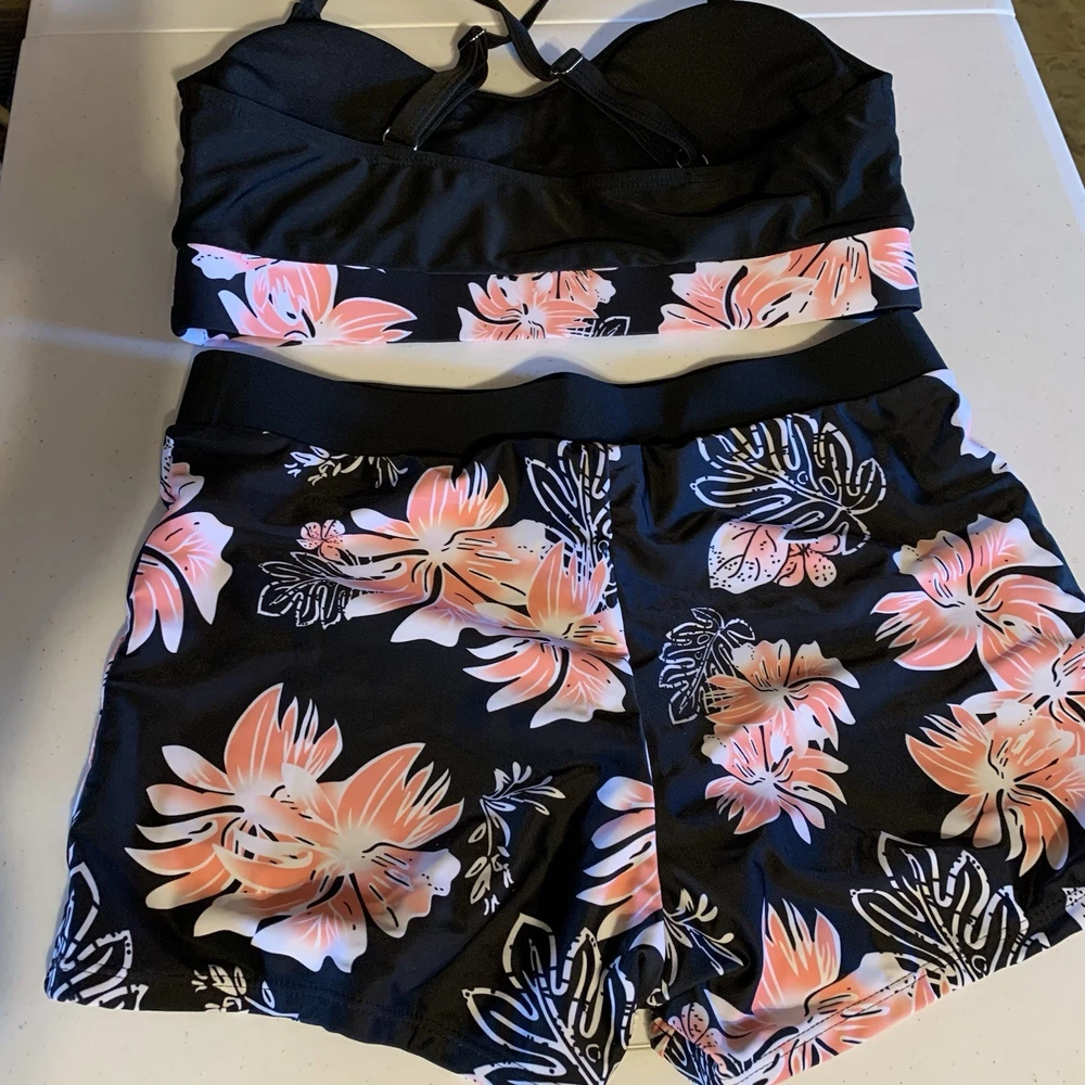 This Hawaiian print swim suit set in women's size XL features a sporty style with a two-piece design, including a bikini top and swim shorts. Made from polyester material, the multicolor pattern adds a fun and vibrant touch to your beach or poolside look. The machine washable fabric and regular fit make this swimsuit set convenient and comfortable for any water activities.