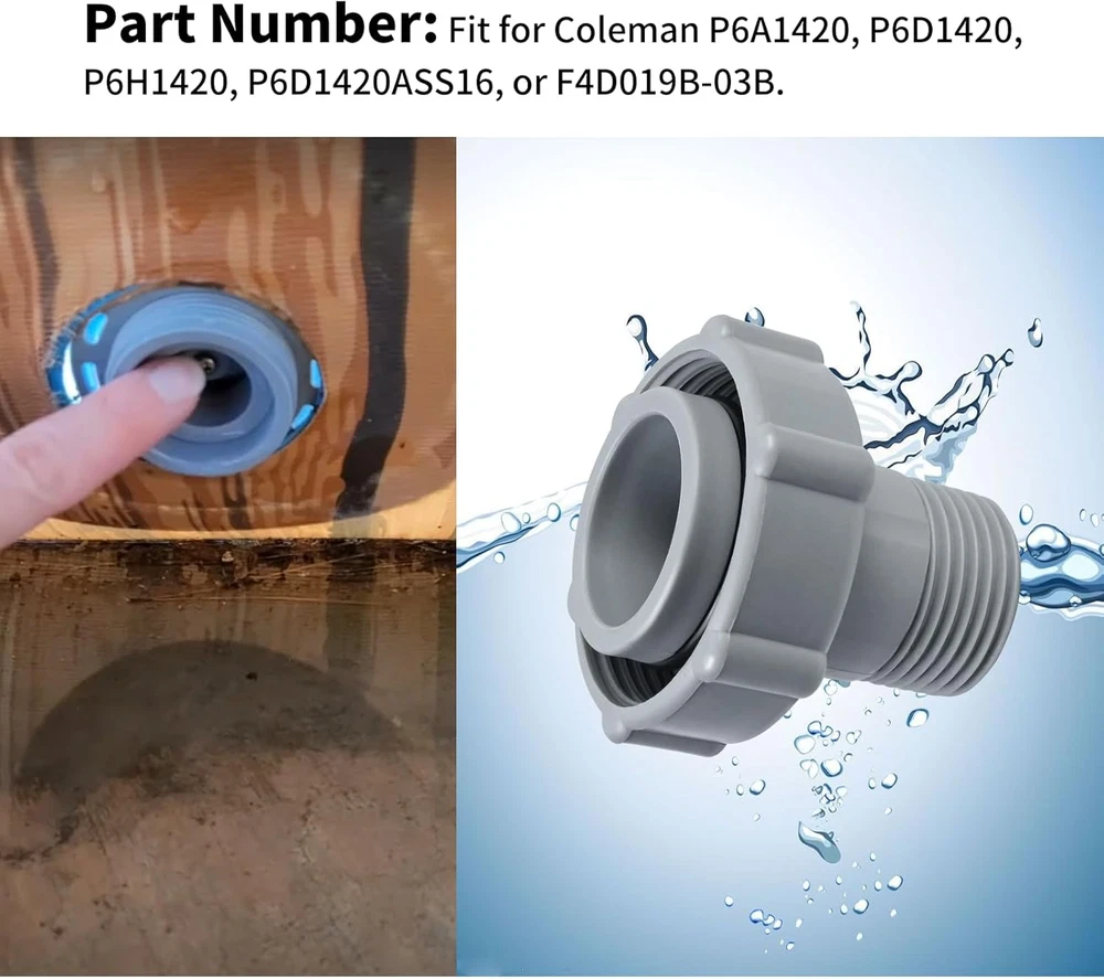 Item: Pool Drain Fitting Connects Compatible With all above ground Coleman with a frame or Fast-Set pools. Part Number:Fitfor Coleman P6A1420,P6D1420 P6H1420P6D1420ASS16,or F4D019B-03B. Dimension:ID1.5-inch connection to the bottom of the swimming pool and OD1.0-inch connection to the garden pipe. Installation: First, attach the garden hose to the drain fitting and then attach it to the bottom of the Coleman pool NOTE: If you do not have a suitable threaded joint to match our product, so had to buy additional fittings to attach to hose. Please tighten the hoop so the hose doesn't leak. Product Description