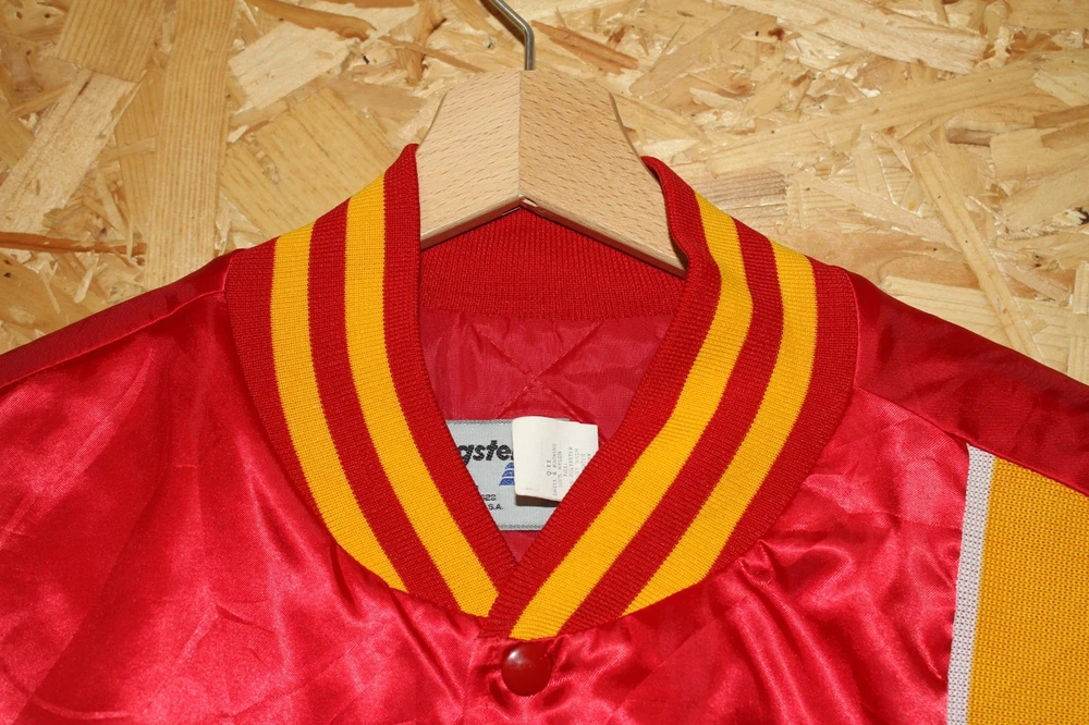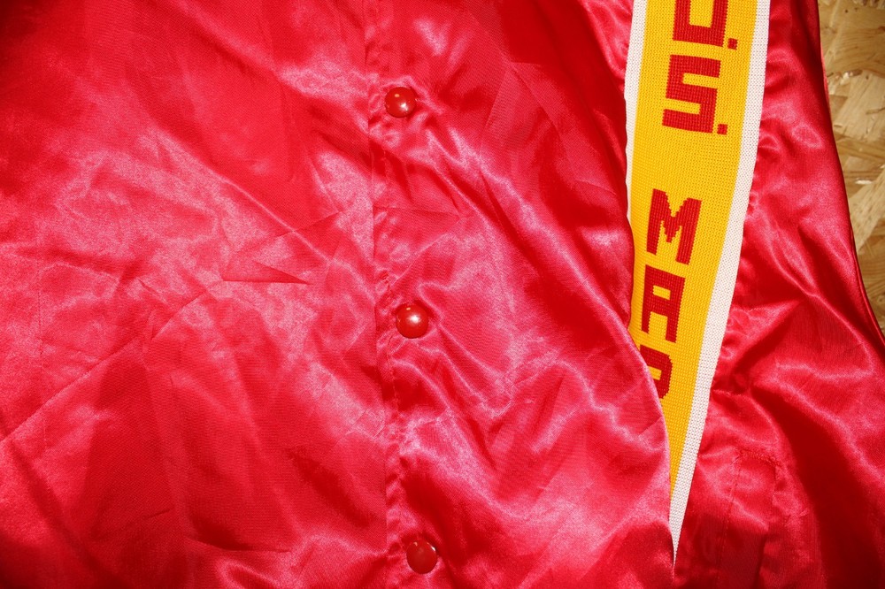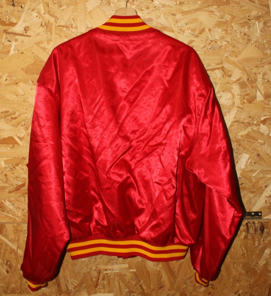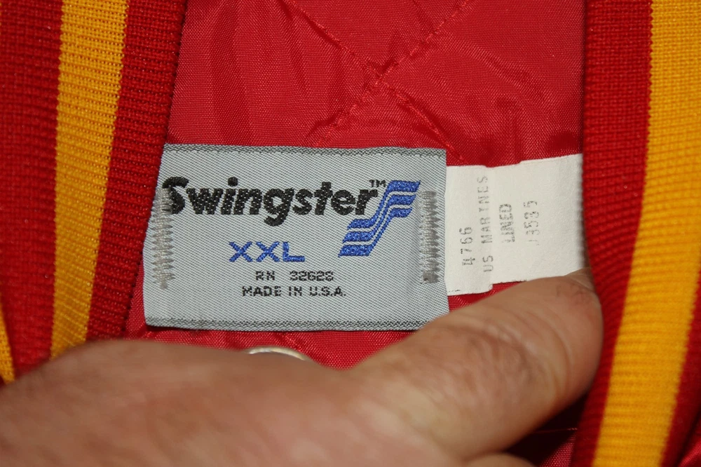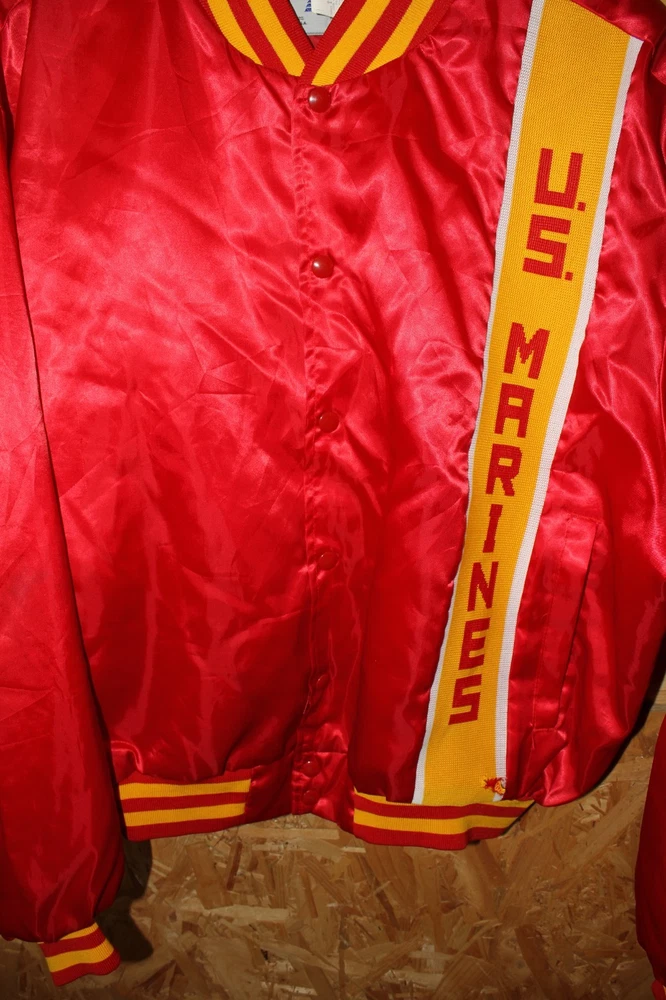 Vintage 1980s U.S. Marines Red Satin Bomber Jacket – Swingster – XXL – Made in USA This authentic vintage Swingster U.S. Marines bomber jacket is a rare Made in USA piece from the 1980s. Made from a bold red satin nylon with yellow and white striped ribbed collar, cuffs, and hem, it features a large vertical “U.S. MARINES” logo down the front. The jacket has a quilted lining for warmth and a snap-button front closure, offering classic varsity styling with a military edge. Key Features Brand: Swingster Era: 1980s Made in USA Size: Men’s XXL (vintage fit – slightly oversized) Colour: Red with yellow and white detailing Material: Nylon satin shell, quilted polyester lining Style: Varsity / Bomber Front snap-button closure Two front pockets Classic U.S. Marines logo design Condition Good vintage condition overall. There is a small fray and a minor area that needs repair near the bottom hem by the logo patch (shown in the photos). All snaps fasten securely, lining is intact, and the colour remains vibrant. Clean and wearable, with expected light signs of age for an authentic 1980s jacket. Styling & Appeal A standout retro varsity bomber with bold military styling — ideal for collectors, streetwear fans, or anyone looking for a genuine piece of American vintage. Works perfectly as a statement layer over casual outfits and fits the current oversized trend. 📦 Fast UK dispatch 🌍 Worldwide shipping available
