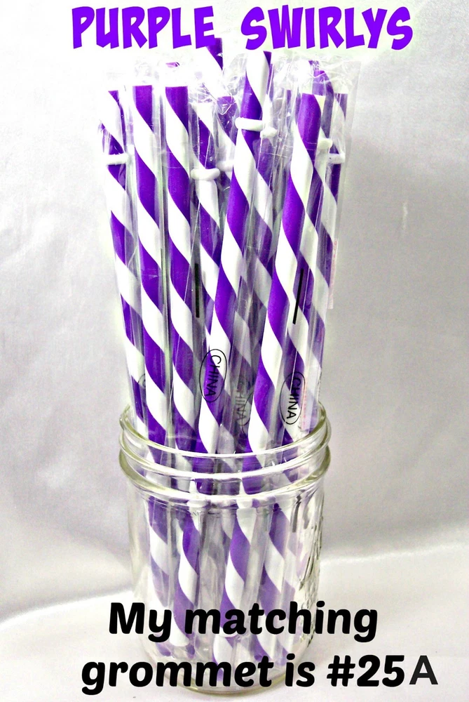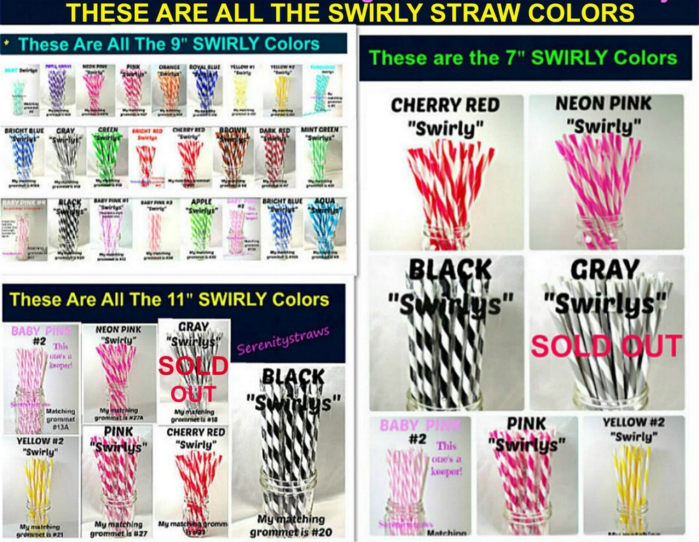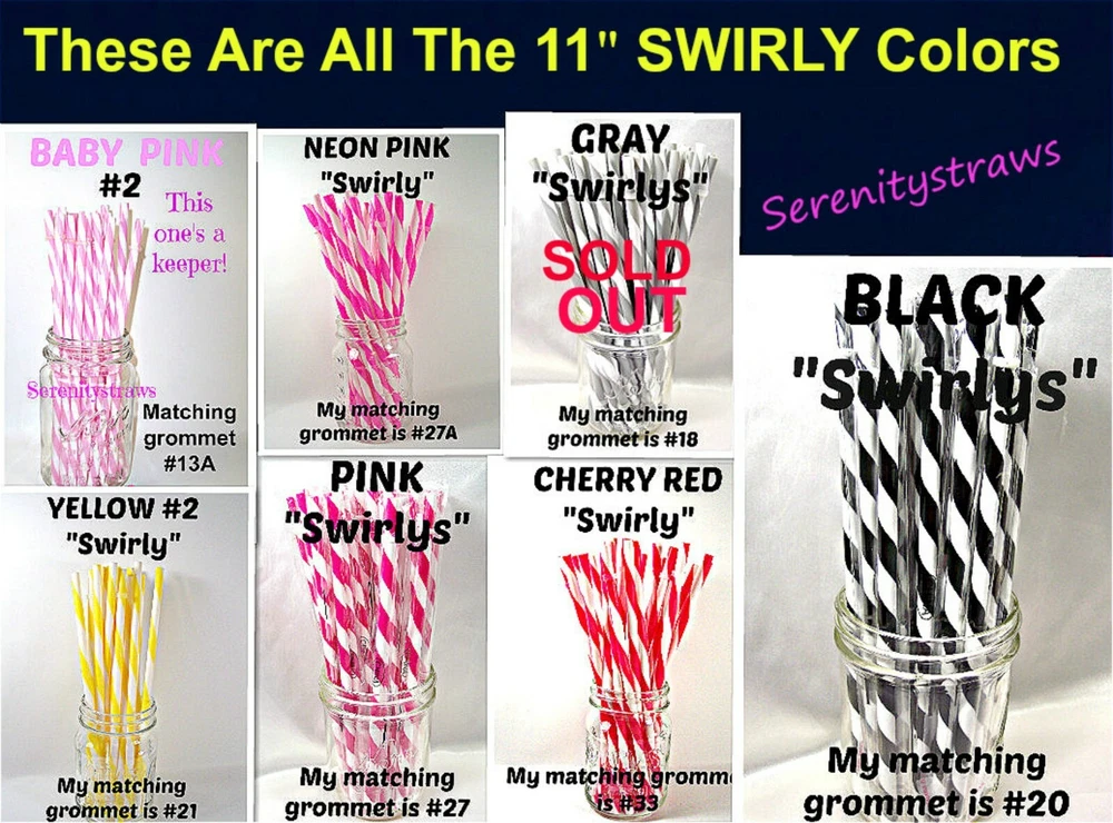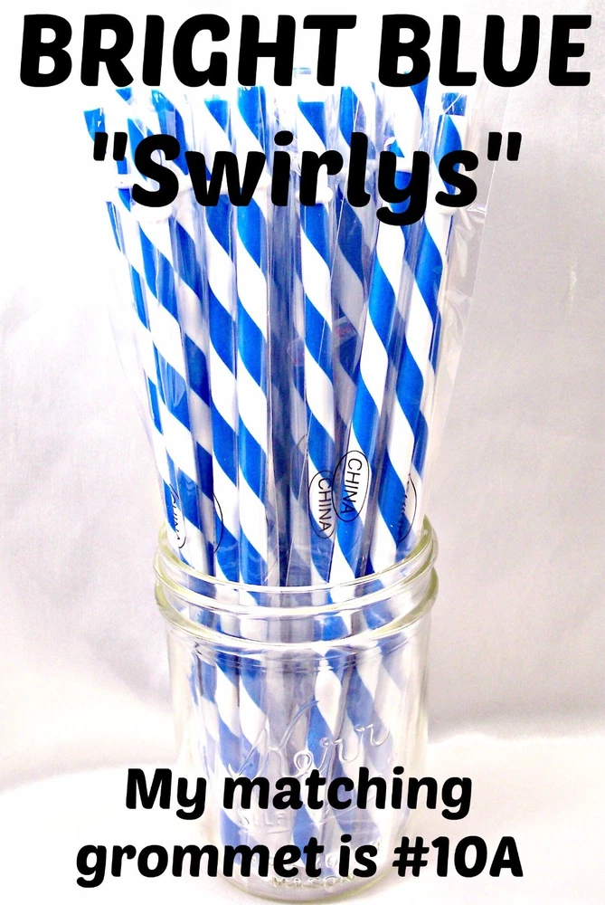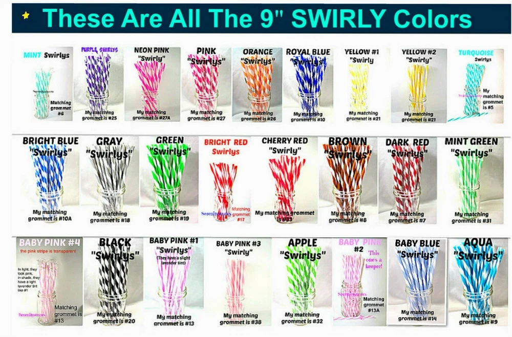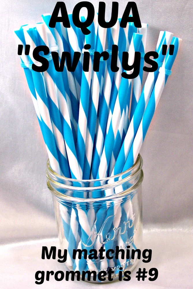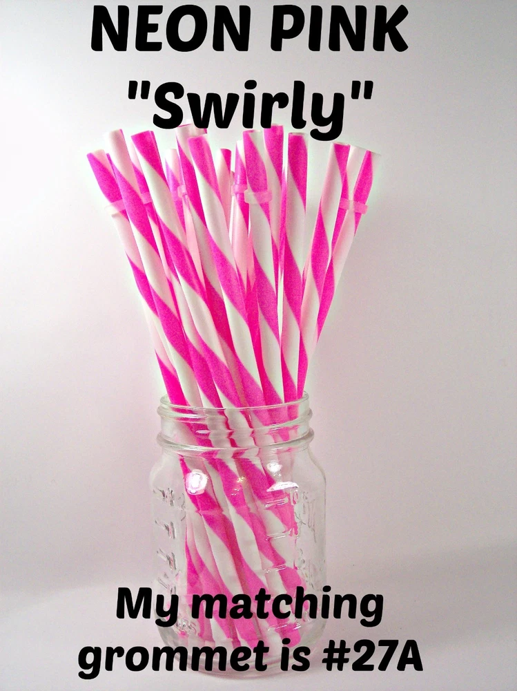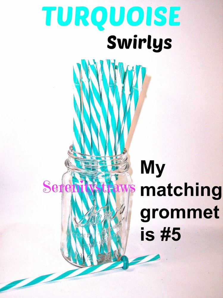 "SWIRLY" STRAWS, 1/4" X 7", 9", or 11", Reusable, BPA Free HELLO! Welcome to SerenityStraws ! DO I COMBINE SHIPPING IF YOU BUY MORE THAN 1 ITEM? You bet I do!! I only charge the actual shipping cost, or a few cents more. After I pack & weigh your package, if the shipping calculated too high, I will refund the excess after I print your label (or as soon as I get time). YOU MUST ADD ALL ITEMS TO YOUR CART BEFORE YOU CHECK OUT, IN ORDER FOR THEM TO BE COMBINED INTO 1 ORDER & SHIPPING COMBINED. I have changed suppliers for all my straws, so I do have a few different shades in a couple colors. PLEASE be sure to look at the pictures so you will order the correct shade. IF YOU WANT TO MIX COLORS, JUST ADD A MESSAGE WITH THE COLORS/QTY. YOU WANT! These straws are 1/4" wide (9/32" is the actual width, just a hair over 1/4") and the lengths are 7", 9" & 11". they are polypropylene, BPA FREE some are wrapped, some are not they are reusable, they have that little non-removable ring on them. Just put the ring end into your tumbler, pop on the lid, and it prevents the straw from falling out! In this listing, I do offer an option to buy 1 of each color straws in each length, and another option for 1 of each color grommets in both grommet sizes. All other grommet choices are in my grommet listing . If you want to choose your own mix of straw colors, Just buy the total in 1 color and send me a message RIGHT AWAY with the colors/qty. you want. NEED GROMMETS??? I have a separate listing for just grommets. I have 5/16", which are a close fit to the straw, and 3/8", which is a looser fit. Either size will work with these straws, it is just personal preference. In the grommet listing, I have a picture of how the grommets fit on 1/4" (9/32") straws. If you want matching grommets for the straws you are buying, in the drop-down menu of this listing, select the color of straws you want to match. You will see a picture of the straws you selected. It will also show the matching grommet # you will need to order, so jot it down, then go to the grommet listing. OR>>>when you order the grommets, just ask me to match them to the straws you are also ordering. You will not automatically get grommets with this straw order. I do occasionally put items on sale, and add new items, so be sure to add me to your "favorite sellers" & subscribe to my monthly newsletter so you don't miss out! Visit My eBay Store Add me to your Favorite Sellers PLEASE BID ONLY IF YOU WILL PAY WITHIN 3 DAYS OF AUCTION END!!! Have fun bidding, but if you bid on (and win) my auctions but choose not to pay me for them, I will hunt you down like a mad dog, so please don't put us through that, cause it won't be pretty...trust me!! I WILL EXPECT YOUR PAYMENT WITHIN 3 DAYS OF AUCTION END or the dogs will be released!!! But it's best to go by the rule.. don't buy if you can't pay . ALL MY ITEMS COME FROM A SMOKE-FREE, CHILD-FREE HOME!!! I do have a cat (Oliver), but he's more well-behaved than most people I know. PLEASE MAKE SURE YOU HAVE YOUR CORRECT ADDRESS IN YOUR PAYPAL ACCOUNT. If your pkg. is returned to me due to wrong address, I will cancel your order, & refund your money for the cost of the items. The Post Office will not re-ship for the original shipping cost. You will need to place a new order. I will ship your pkg. the next working day after I receive your payment. As soon as I print your label, you will see a tracking number in your "MY EBAY". If you don't receive it in a reasonable amount of time, CONTACT ME!! I am not a big company, I sell these items from my home. If I occasionally make a mistake, please give me a chance to correct it! I stand behind my sales and work hard to deserve your positive feedback! YOUR SATISFACTION IS OF UTMOST IMPORTANCE TO ME!!! If you have any questions, PLEASE ask me before you begin bidding. I am more than willing to help you out, so please don't be afraid to ask me anything! If you read my listing and see an error in detail, I'd really appreciate you making me aware of it, and if you make a mistake and order the wrong thing, just tell me and I'll fix it (before it is shipped).