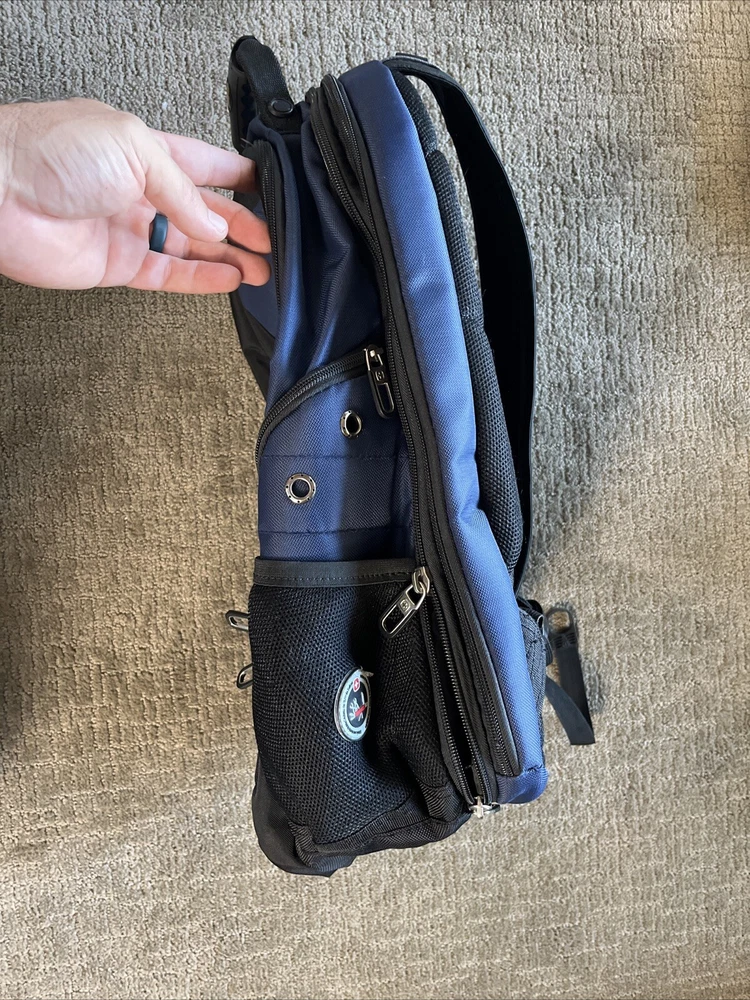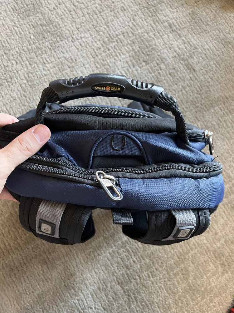 Item Width: 15” Model: Airflow Laptop Bag Material: Nylon Brand: Swiss Gear Color: Black Blue Sport/Activity: Backpacking Item Length: 20” Type: Shoulder Bag
