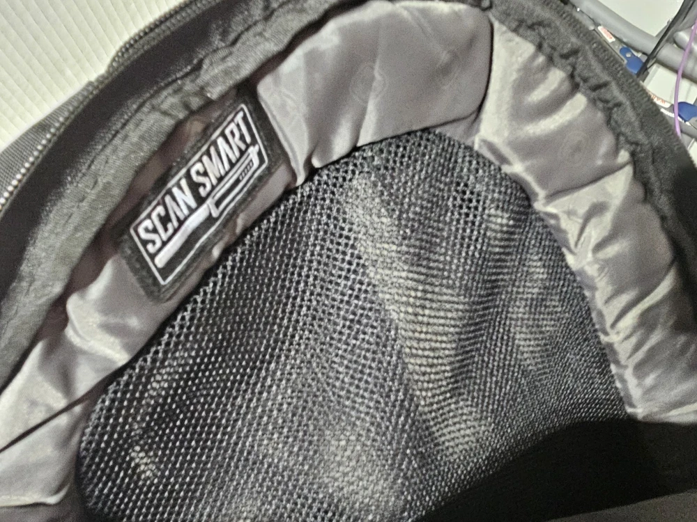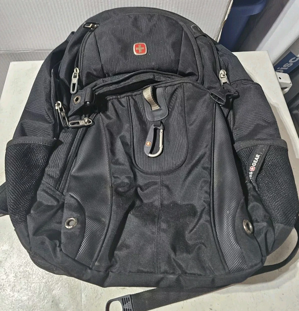 20 inches by 16 inches wide In very good condition. Slight wear under shoulder strap. See pictures please. Has a lot of pockets and a laptop section. All zippers work great. Very nice feeling backpack. Has a pocket for headphones and a space for sunglasses