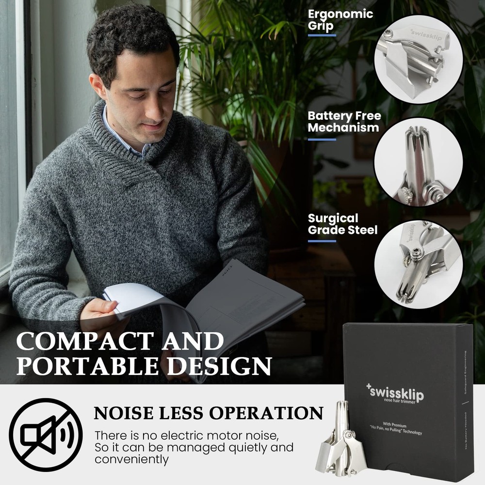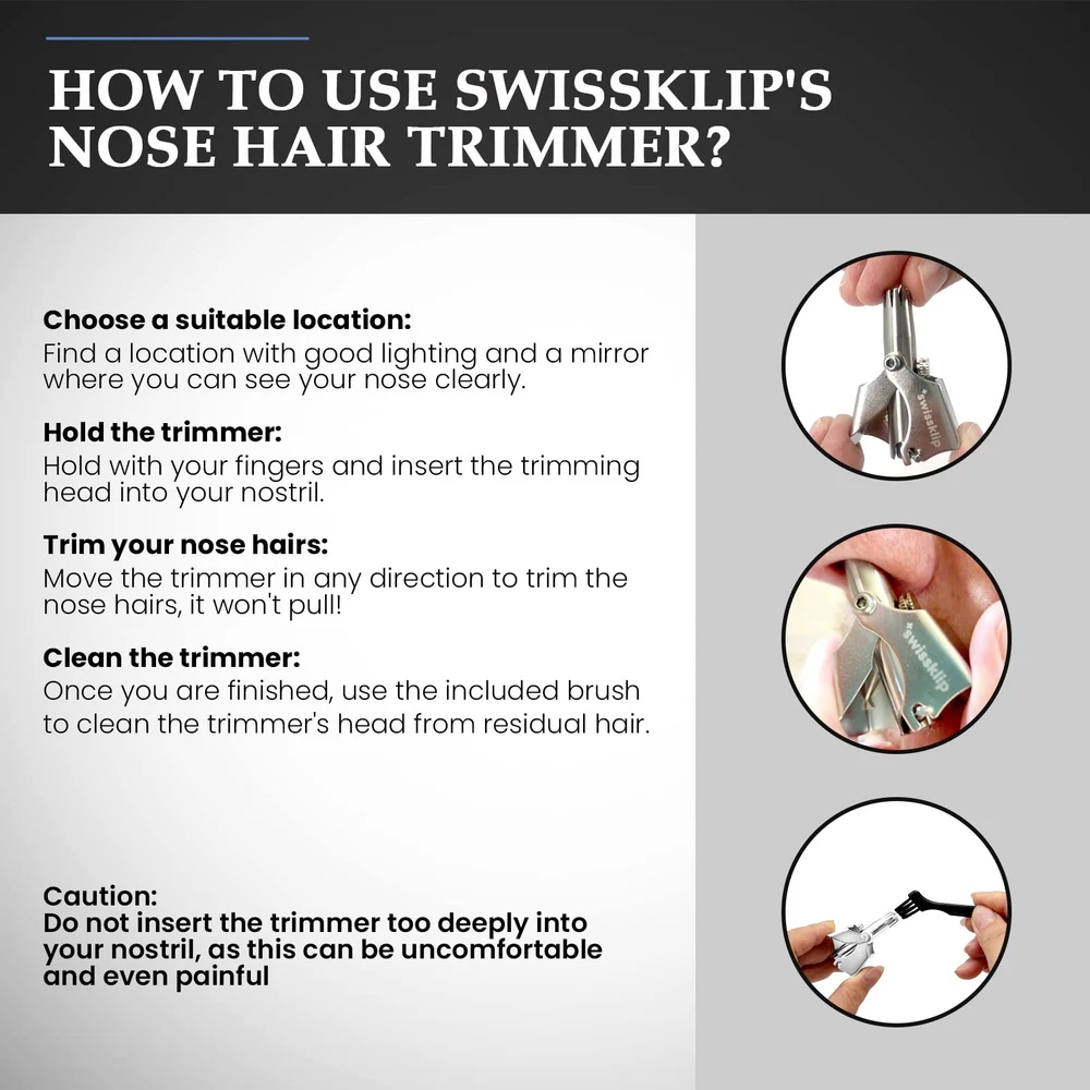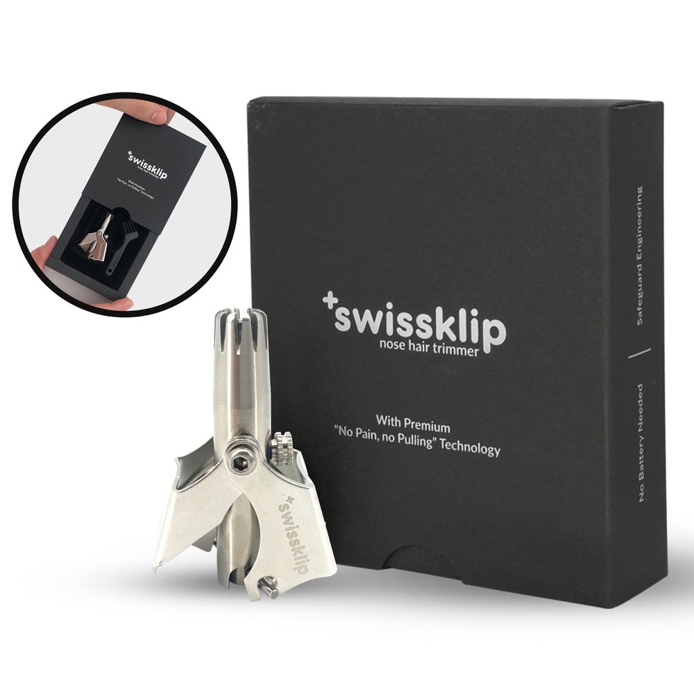 Say Goodbye to Pesky Nose Hair with Swissklip’s Precision Nose Hair Trimmer! 12 Dual-Edge 360° Rotating Blades The sharp cutting blade technology never comes in contact with skin. 6 times thicker blades than electrical trimmers, and don’t pull the hairs. It cuts every unwanted hair perfectly with its durable rotating blades. Designed to be efficient and easy to use, this trimmer is your go-to tool for keeping your nose neat and clean. Surgical-Grade Stainless Steel The whole product is built with the finest surgical-grade stainless steel which makes it incredibly durable and long-lasting, not getting dull. Also, it makes it waterproof and easy to keep it clean. Provides a smooth and precise cut, our trimmer is safe and gentle to use with its rounded tip, preventing accidental cuts or nicks. Battery-Free Mechanism Swissklip 360 Nose hair trimmer is made to work anywhere. It does not require charging or any kind of battery. It is made to operate quietly from wherever it is the most convenient for you. Pressing your finger to the edge makes the machine rotate the blades to trap the hair. No more painful hair removal experience. The ergonomic design of our trimmer makes it easy to hold and maneuver, allowing you to reach every hair with ease. It's also easy to clean with its removable blade head, ensuring hassle-free maintenance and hygiene. Made from high-quality materials, our trimmer is built to last and is reliable for long-term performance. Boost your confidence with a clean and tidy appearance. Try our Precision Nose Hair Trimmer Today! Effortless Nose Hair Trimming: Our precision nose hair trimmer is designed to make trimming your nose hair quick and easy, without any discomfort. The sharp stainless-steel blades of our trimmer are engineered to provide a smooth and precise cut, ensuring a neat and clean result. Safe and Gentle: Our trimmer features a rounded tip to prevent accidental cuts or nicks, making it safe and gentle to use on sensitive areas like your nose. With its ergonomic handle and compact size, our trimmer is easy to hold and maneuver, allowing you to reach every hair with ease. Easy to Clean: Our trimmer is easy to clean with its removable blade head, allowing for hassle-free maintenance and hygiene. Featuring a sleek and modern design, our nose hair trimmer is not only functional but also looks great in your grooming arsenal. Versatile Grooming Tool: Our trimmer is not only perfect for trimming nose hair, but also for grooming ear hair, eyebrows, and other facial hair. Keep your nose hair well-groomed with our precision nose hair trimmer and boost your confidence with a clean and tidy appearance! Designed in Germany & manufactured using strict quality control standards. Swissklip are experts in the personal care space, delivering precision products and superior craftsmanship with thousands of satisfied customers worldwide.