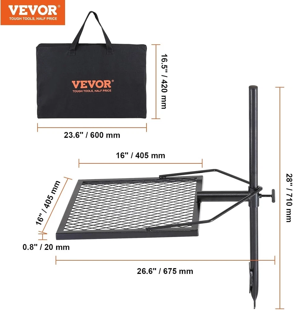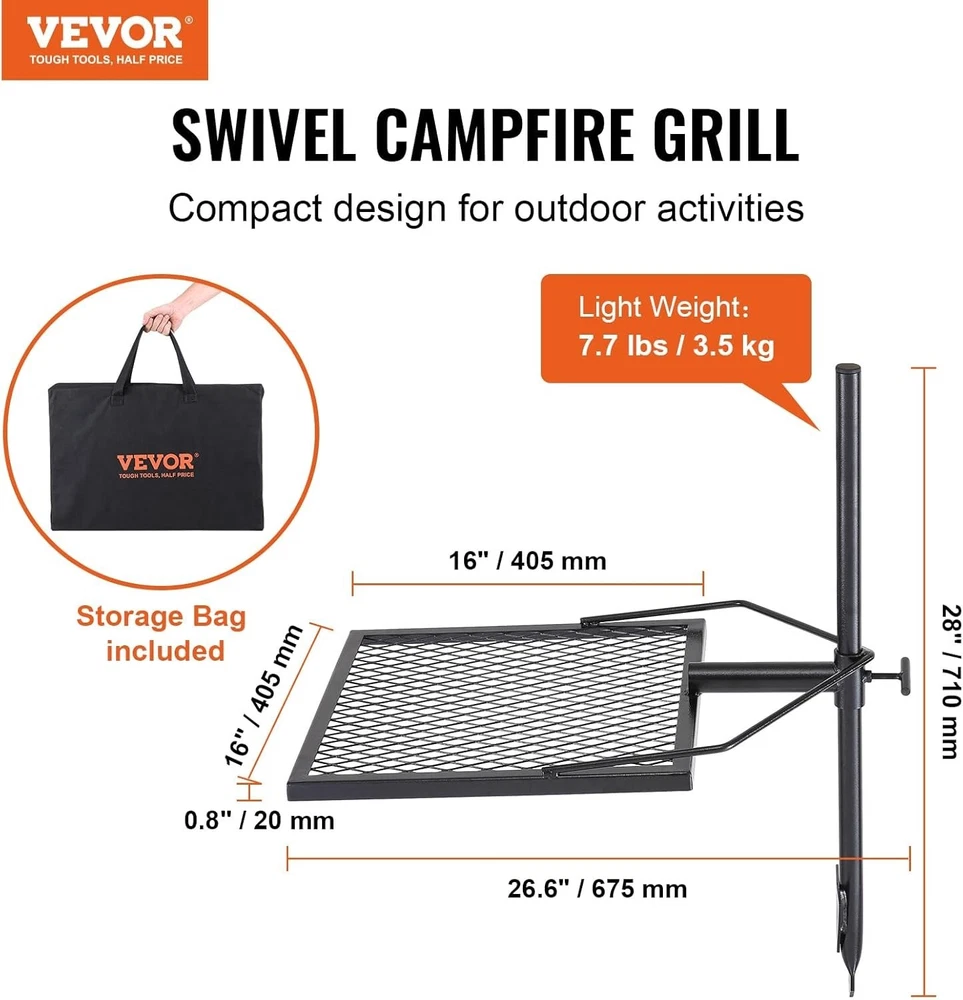 Swivel Campfire Grill, Grill Grate over Fire Pits, Heavy Duty Steel Grill Grates Size: 16*16 inch Product Dimensions 16"D x 16"W x 28"H Special Feature Durable,Portable Fuel Type Charcoal Recommended Uses For Product Outdoor Detachable & Portable: This swivel campfire grill boasts a detachable design and comes with a storage bag that is both wearable and beautiful to carry and protect the grill, making it easy to transport anywhere. Net Weight: 7.7 lbs / 3.5 kg. High-Quality Steel: The campfire grill fire pit is made of heavy-duty steel with a coat of paint on the surface, which is durable, food-grade, rust-proof, and high-temperature heat resistant. It can stand temperatures up to 572℉ / 300℃ without deformation and cracking. Return Policy: We offer a 30 day return policy from the receiving date. Please contact us for a Return Label. Please use our return label provided by us because it will go back to our supplier. Feedback: Your satisfaction is very important to us! If you have any problem with your order, please contact us and we will do our very best to make you satisfied. As long as you are happy with your purchase, please leave a positive feedback for us. We will always leave you a positive feedback in return. If you have any problem with your purchase, please do not leave a negative feedback. Please Contact us ... and your issue will be solved quickly and positively We are a small family-owned business trying to make it, not a huge company that doesn't care ... We will ALWAYS do our best for you!