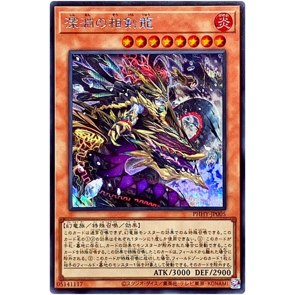 Character: Swordsoul Dragon of the Abyss Vintage: No Game: Yu-Gi-Oh! TCG Set: Photon Hypernova Card Size: Standard Material: Paper Custom Bundle: No California Prop 65 Warning: No Problem Finish: Foil Card Type: Effect Monster Card Number: PHHY-JP005 Card Name: Swordsoul Dragon of the Abyss Rarity: Secret Rare Age Level: 6+ Language: Japanese Country/Region of Manufacture: Japan Manufacturer: Konami