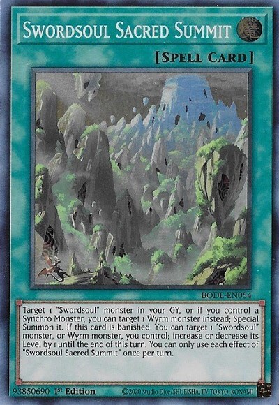 Set:Burst of Destinybrand:KonamiManufacturer:KonamiGame:Yu-Gi-Oh! TCGAttribute/MTG:Color:SpellRarity:Super RareCard Text:Target 1 "Swordsoul" monster in your GY, or if you control a Synchro Monster, you can target 1 Wyrm monster instead; Special Summon it. If this card is banished: You can target 1 "Swordsoul" monster, or Wyrm monster, you control; increase or decrease its Level by 1 until the end of this turn. You can only use each effect of "Swordsoul Sacred Summit" once per turn.Card Name:Swordsoul Sacred SummitCard Type:Spell-NormalFeatures:1st EditionAdditional Description:Swordsoul Sacred SummitCard Number:BODE-EN054Language:English