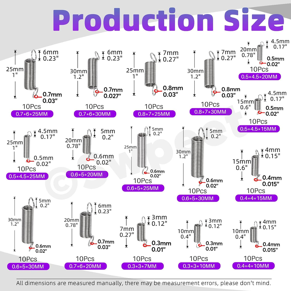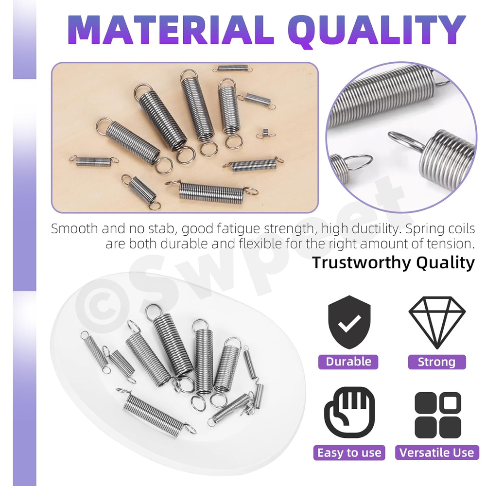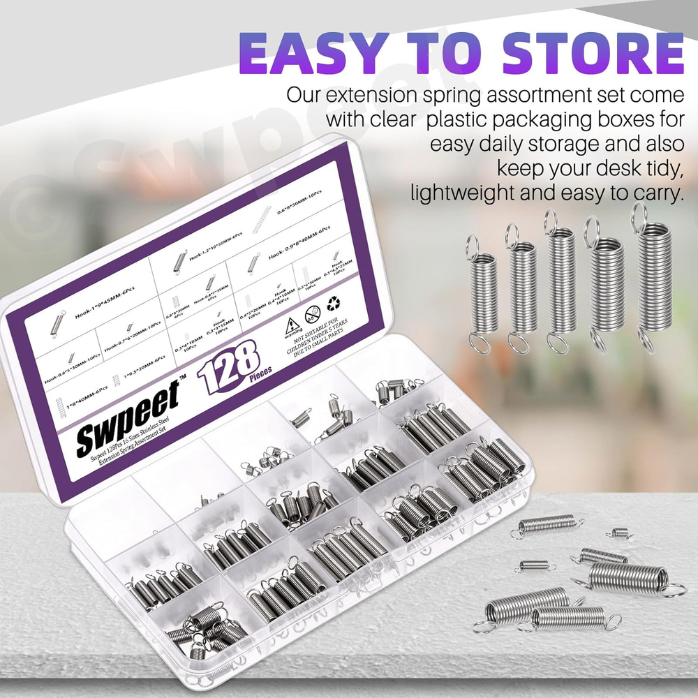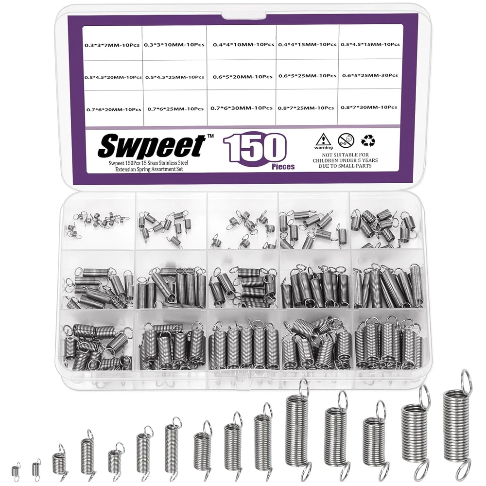 Store New Arrivals Add to Favorite View Feedback Contact Swpeet 150Pcs 15 Different Sizes Stainless Steel Extension Spring with a Dual Hook Assortment Kit, Mechanical Extension Springs Small Spring for Home Repairs Description Item model number S4481 Manufacturer Swpeet Country of Origin China Number of Items 150 Package Dimensions 6.85 x 3.9 x 0.67 inches; 5.64 ounces π― What You Get: In this kit, you will get 150Pcs 15 Different Sizes Stainless Steel Extension Spring with a Dual Hook. This set includes popular sizes commonly used for daily life. Multiple sizes of precise springs to meet your diverse repair needs. π― 15 Different Sizes : The diverse sizes allow for precision. You can select the exact spring with the ideal tension and dimensions to meet needs. This not only ensures optimal performance but also saves you time and effort in searching for the perfect fit. π― Premium Material: Made of high-quality stainless steel,the tension springs have strong wear resistance and corrosion resistance. The springs are smooth and without stabbing edges and can withstand significant tension and bounce back without losing shape. They have good performance and service life both indoors and outdoors. π― Easy To Storage: 15 different sizes of springs are neatly categorized in storage boxes with size labels, which can help you get the item quickly and correctly, and put back them in place when you don't need. π― Wide Applications: The extension springs are ideal for a variety of uses, including home improvement, automotive repairs, industrial applications and more. Suitable for most repair projects, such as doors, curtains, umbrellas, scissors, pliers, bikes, automobiles, electrical equipment etc π Swpeet 150Pcs 15 Different Sizes Stainless Steel Extension Spring with a Dual Hook Assortment Kit, Mechanical Extension Springs Small Spring for Home Repairs π Why Choose Us? π Fit most use β¨ We have prepared 15 common sizes to meet your repair and maintenance needs, saving time and improving efficiency. π High-quality Material β¨ Made of high-quality stainless steel,the tension springs have strong wear resistance and corrosion resistance. And springs are smooth and without stabbing edges. π Wide Applications β¨ Ideal for a variety of uses, including home improvement, automotive repairs, industrial applications. π Specifications β¨ Product Name: Extension Spring β¨ Size: As Shown in the picture β¨ Material: Stainless Steel β¨ Color: Silver οΌThe first one is wire diameter, second is outer diameter, third is overall length) π Package Includes: β¨ 10Pcs ------- 0.01"Γ0.12"Γ0.27" β¨ 10Pcs ------- 0.01"Γ0.12"Γ0.4" β¨ 10Pcs ------- 0.015"Γ0.15"Γ0.4" β¨ 10Pcs ------- 0.03"Γ0.23"Γ0.78" β¨ 10Pcs ------- 0.02"Γ0.2"Γ1.2" β¨ 10Pcs ------- 0.015"Γ0.15"Γ0.6" β¨ 10Pcs ------- 0.02"Γ0.2"Γ1" β¨ 10Pcs ------- 0.02"Γ0.2"Γ0.78" β¨ 10Pcs ------- 0.02"Γ0.17"Γ1" β¨ 10Pcs ------- 0.02"Γ0.17"Γ0.6" β¨ 10Pcs ------- 0.02"Γ0.17"Γ0.78" β¨ 10Pcs ------- 0.03"Γ0.27"Γ1.2" β¨ 10Pcs ------- 0.03"Γ0.27"Γ1" β¨ 10Pcs ------- 0.027"Γ0.23"Γ1.2" β¨ 10Pcs ------- 0.03"Γ0.23"Γ1" β¨ Intotal 150Pcs ABOUT US We offer the best prices around on high quality products. Our E-store includes media such as books, movies, music and games while offering electronics, toys, sporting apparel, clothing, tools, general home, garden items and more. SHIPPING We are always working hard to ensure your package arrives as soon as possible. Please understand that some factors like weather, high postal traffic, and the performance of shipping companies are outside of our control. We offer free shipping to the lower 48 states and ship within 2 business days of payment, usually sooner. We do not accept P.O. Boxes. Please provide a physical address. RETURNS We offer a 30-Day Return Policy on items which you are not completely satisfied with. You have the option for a full-refund or an exchange of the item. No returns are available on items shipped outside of the USA. PAYMENT We accept PayPal. CONTACT US This page content is yet to come Please ad us to your favorite seller and visit again later Thank You CUSTOMER SATISFACTION We try our very best to make sure every customer is completely satisfied. If there's a problem, message us! We're happy to help.