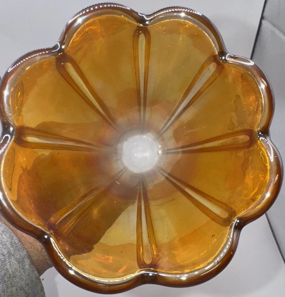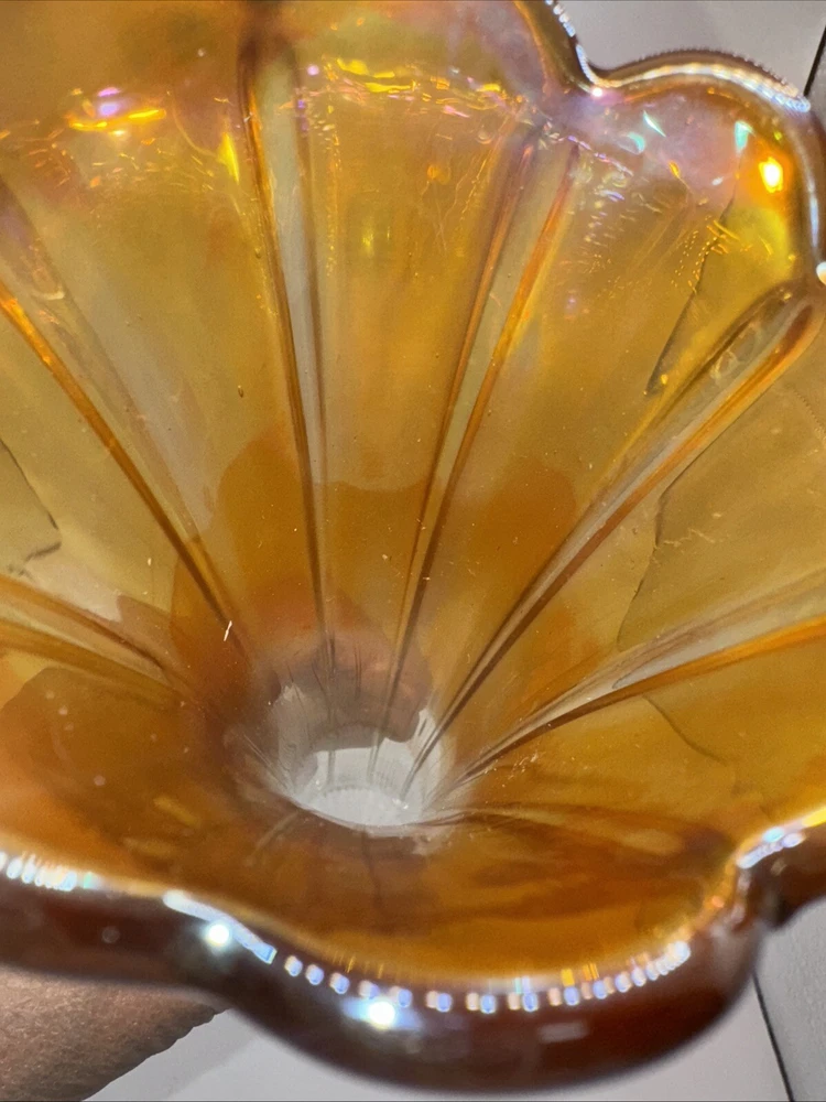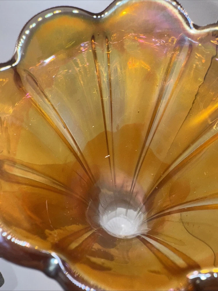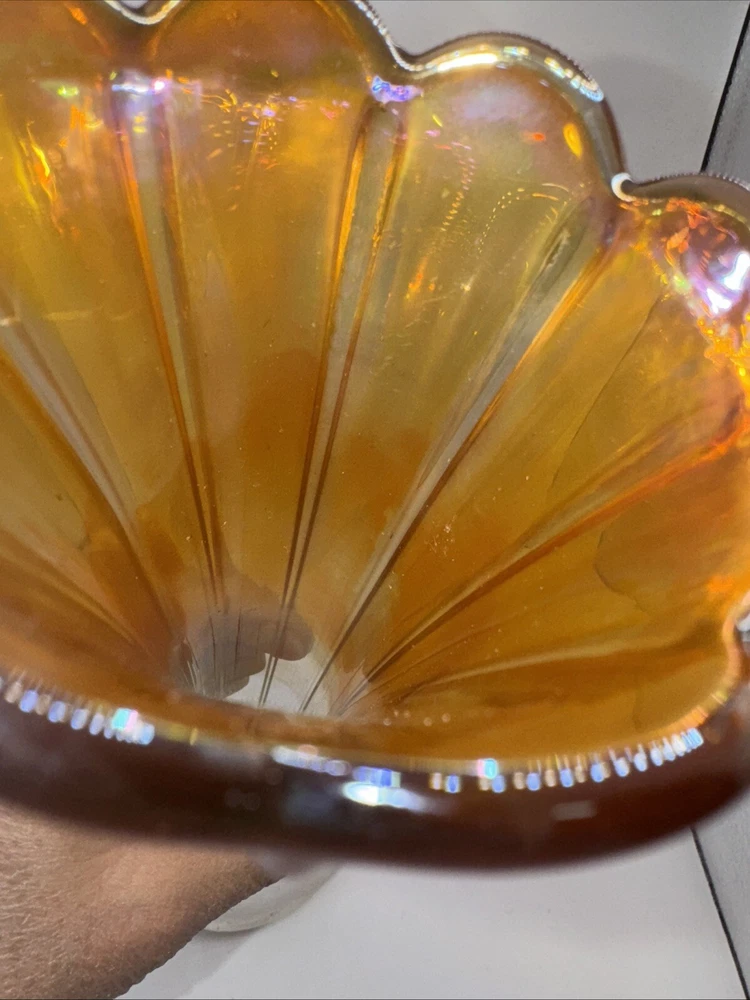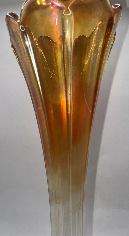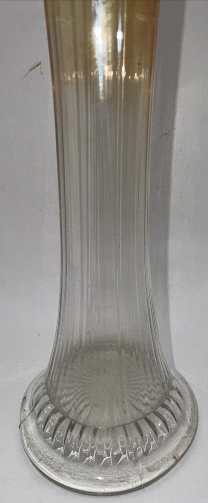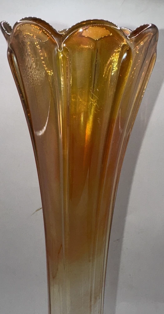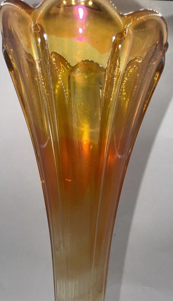Swung Carnival Glass Imperial Marigold Iridescent Ribbed Vase MCM Vintage 13”