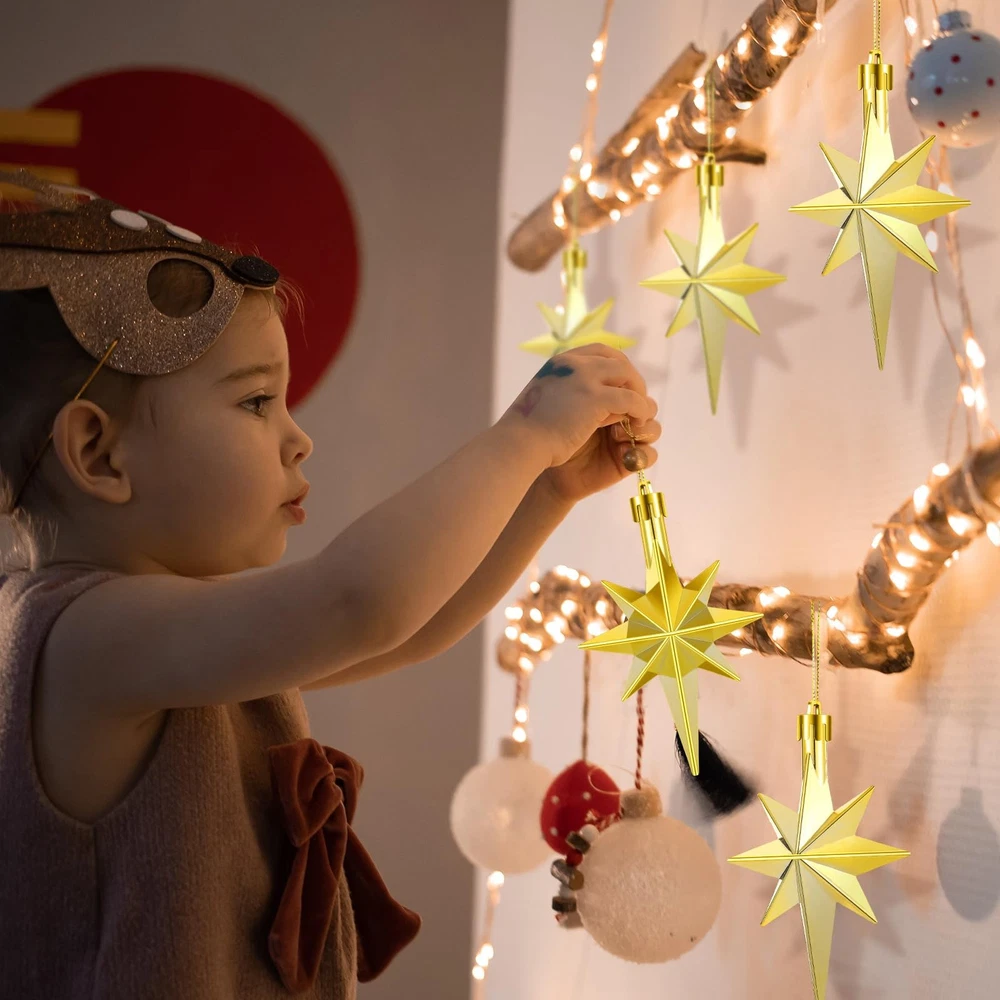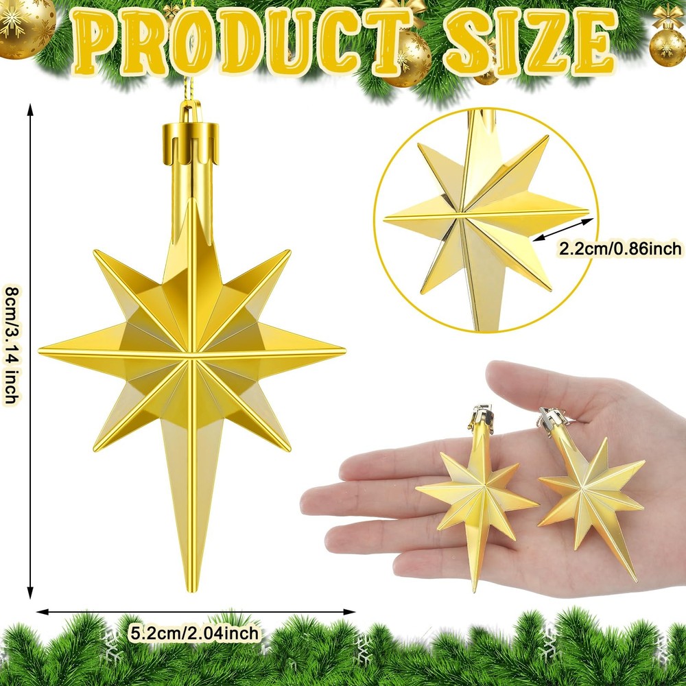 Package Includes: package includes 12 bethlehem star Christmas ornaments, each individually and securely packaged; Whether you're planning to cover a large tree or need several accents for wreaths and garlands, we've got you covered Suitable Size: bethlehem star ornament size is about 3.14 x 2.04 inches, the bethlehem star Christmas ornaments strike the balance between subtlety and significance on your Christmas tree; They are an ideal size on your Christmas tree without overpowering other ornaments Durability Material: our star Christmas ornament is crafted using plastic that undergoes an electroplating process; This accentuates its durability and gives it a polished, shiny appearance; Amidst the frenzy of festivities, this ornament is made to last, bringing joy to countless holiday Convenient Hanging Design: each star ornament for Christmas tree is designed with convenience in mind; A practical loop is placed at its top with an attached rope, ensuring easy hanging and rearrangement; These charming ornaments will hang securely, contributing to your beautiful Christmas decoration Holiday Parties Gift Dcoration: the star of bethlehem decor are not only for personal use but also suitable for holiday party decorations; They add an dose of festive cheer and style to any holiday gathering, be it a small family get together or a grand Christmas party