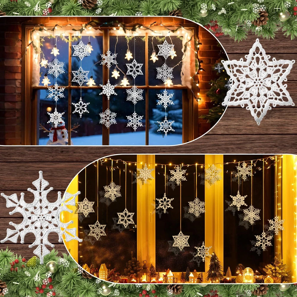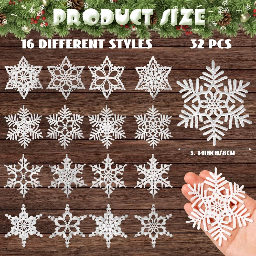 Features: These ornaments are perfect for dressing up Christmas trees, but they can also be applied for other indoor and outdoor decorations. They can be applied to decorate walls, ceilings or windows, adding a touch of winter charm to any area. With the traditional snowflakes design, these ornaments bring in the winter and holiday spirit to your home or business. The beautiful crocheted details make them aesthetically pleasing. Specifications: Main material: cotton Main color: white Size: about 3.15 inches/ 8 cm Package includes: 32 x Crochet snowflake ornaments Notes: Manual measurement, please allow slight errors on size. The color may exist a slight difference due to different screen displays. Sufficient Quantity: the package includes 32 pcs crochet snowflake ornaments in 16 styles, 2 pieces for each style; Rich quantities and style, you can generously sprinkle snowflakes across your decoration, creating a snowy Christmas environment Suitable Size: Christmas snowflake ornament measure approximately 3.14 inches/ 8 cm, lightweight and can be hung in places easily with ropes, portability, suitable for hanging on Christmas trees, doors, stairs, windows, walls, wreaths and many other place Comfortable and Sturdy: the Christmas tree decorations are designed using cotton thread, comfortable and solid, carefully woven and not easy to break, tear and deform, washable and reusable; Our crocheted snowflakes are designed to last for many upcoming years Elegant Design: our white snowflakes ornaments come in a beautiful and elegant white color, these Christmas ornaments mimic the actual snowflakes adding to the authenticity of your Christmas decor, and with any winter or Christmas color scheme Applicable Occasions: these Christmas tree crocheted ornaments can not only be applied at Christmas, but ideal for winter themed parties, holidays, festivals, etc., You can send them to your mates, family members, and other people as thoughtful presents