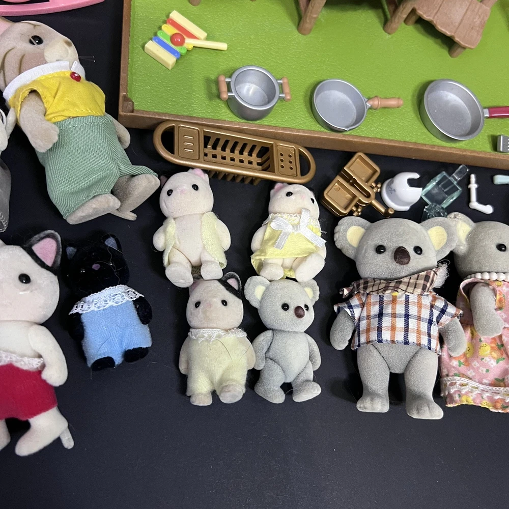 •Sylvanian Families/ Calico Critters Lakeside Lodge Play House. •Epoch Co, Ltd Calico Critters Cherry Cruiser Red Coupe Roadster Holds 5 Critters. Car needs a deeper cleaning. •Baby castle playground. (Some Stickers are peeling off. ) •22 Animal dolls. -9 cats -3 Koalas ( mom has damage on the ear.) -4 Bunnies (one bunny in missing a tail) -2 Chipmunks -2 Baby Hedgehogs -1 baby yellow lab -1 baby white mouse /gerbil?? Mixed assortment of furniture and accessories. Tables, chairs, refrigerators, tub, fireplace, shower and bathing accessories, campfire accessories, purses. Please refer to ALL photos. You will receive every item as photographed. Most Items are in played with condition. Some were only displayed on a shelf, some have some light wear.
