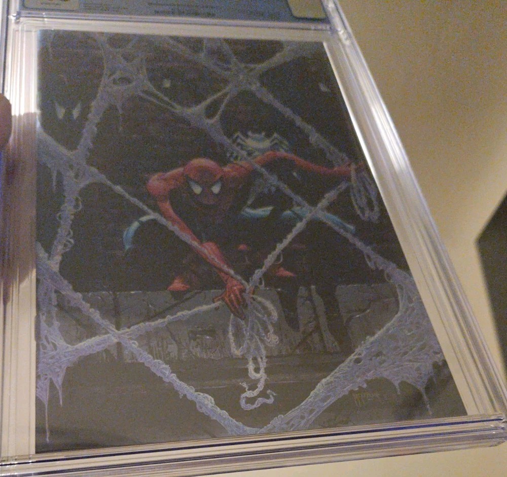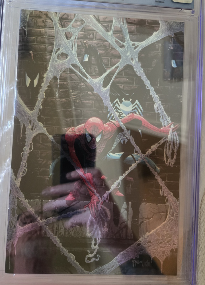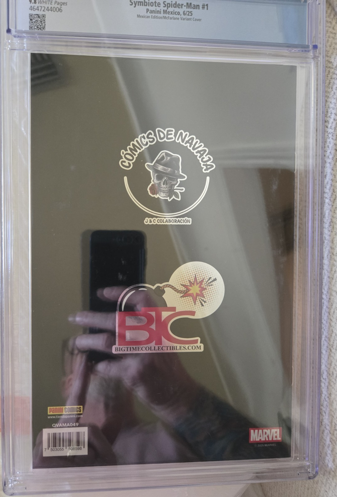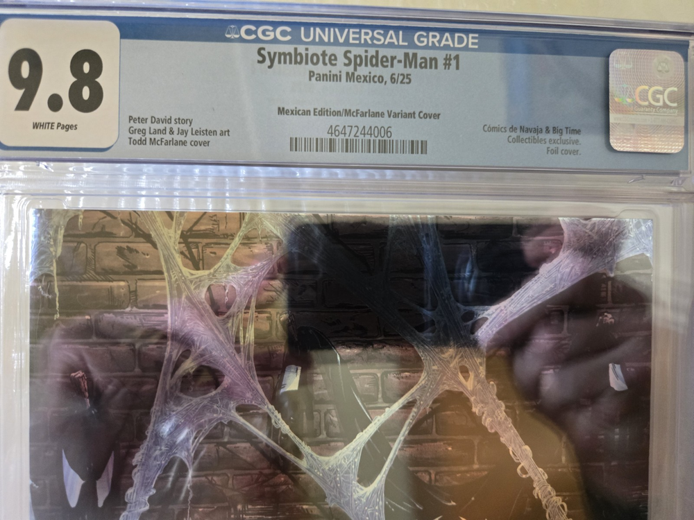 The product is a variant cover of the Symbiote Spider-Man #1 comic book, featuring artwork by McFarlane and published by Marvel Comics. This Mexican/Spanish edition has been graded 9.8 by CGC. The comic is part of the Marvel Universe (MCU) and is aimed at a general audience, making it a valuable collectible item for fans of US Comics and superhero genres. Plot: The story is set during the period when Peter Parker first wore the black symbiote suit, before he knew its sinister secret. The all-new tale pits Spider-Man against Mysterio. Creators: It is written by Peter David and features art by Greg Land.Publication: The series launched in April 2019 and ran for five issues. *****************The last picture is just a stock photo, not the actual book.*******************