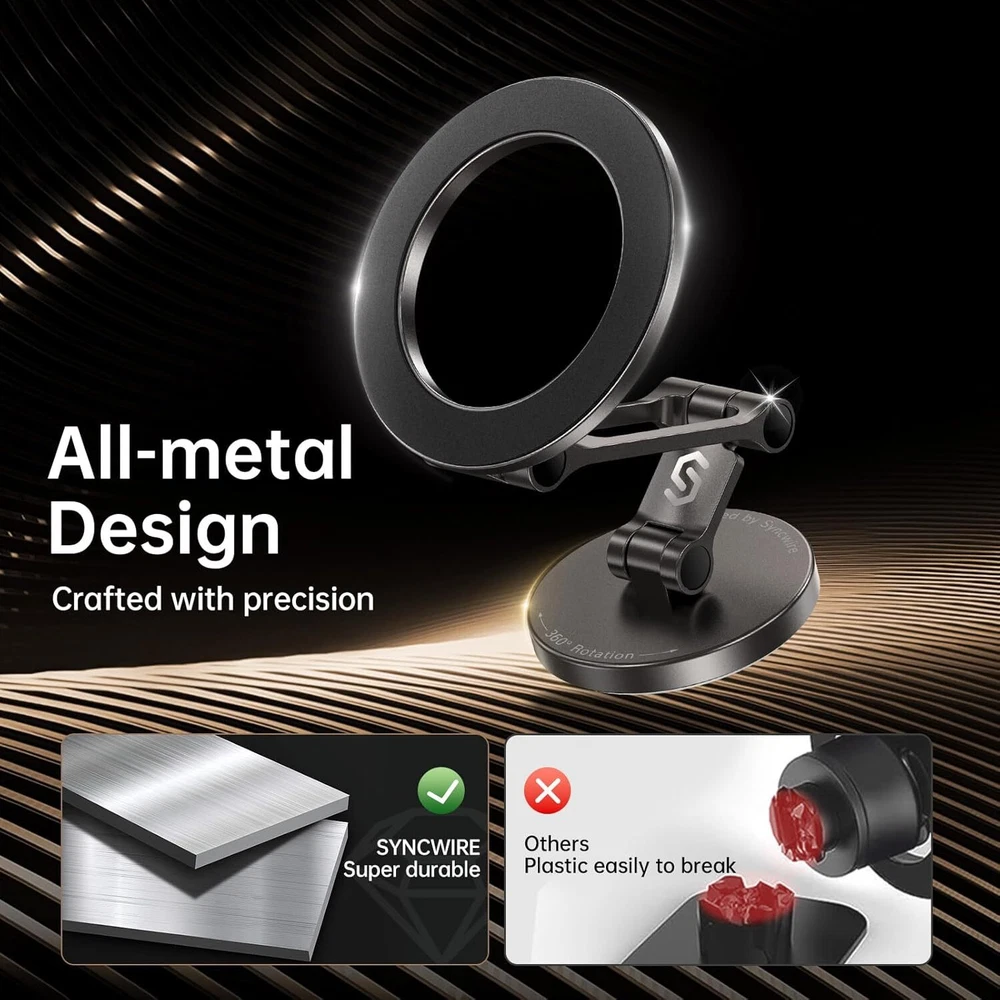 Syncwire Fits MagSafe Car Mount for Dash&Tesla Titanium Black Product Details Package Dimensions: 7.09 x 2.91 x 0.67 inches Item Weight: 4.6 ounces Item model number: SW1064 Special features: One-Hand Operation, Strong Magnetic, 360 Rotatable, Foldable, Heat Resistant 3M Adhesive Other display features: Wireless Color: Titanium Black Whats in the box: User Guide, Foldable MagSafe Car Mount x 1, Metal Ring x 2 (White&Black), Positioner for Metal Ring x 1 Manufacturer: SYNCWIRE Country of Origin: China Brand: SYNCWIRE Compatible Devices: Smartphones Compatible Phone Models: iPhone 16, 16 Plus, 16 Pro, 16 Pro Max, iPhone 15, 15 Pro, 15 Plus, 15 Pro Max, 14, 14 Pro, 14 Pro Max, 14 Plus, iPhone 13, 13 Pro, 13 Pro Max, 13 Mini, iPhone 12, 12 Pro, 12 Pro Max, 12 Mini and Official MagSafe Cases/Magnetic Cases;Require Metal Ring(2 rings included): iPhone Series: iPhone 11/11 Pro/11 Pro Max/XS/XS Max/XR/X/8/8 Plus/7/7 Plus/6s/6s Plus/6/6 Plus/SE; Samsung: Samsung Galaxy S23/ S23 Ultra/ S23 Plus/Galaxy S22/ S22 Ultra/ S22+/ S21 Ultra/ S21+/ S21/ S20 Ultra/ S20 plus/ S20/ S10 plus/ S10/ S9/ S8/ S7/ S6; Note 20 Plus/ 20/ 10 plus/ 10/ 9/ 8; A71/ A51/ A50/ A10...Goodle: Google Pixel 6Pro 6 5a 5 4 4XL 4a 3 3XL 2 2XL 1, Nexus 5 5X 6P 6...Oneplus: Oneplus 10Pro 9RT 9R 9Pro 9 8T 8 8Pro 8Lite 7TPro 7T 7Pro 7 6T 6 5T 5 3T 3 X 2 One for 4-7 Inch... s / iPhone 16, 16 Plus, 16 Pro, 16 Pro Max, iPhone 15, 15 Pro, 15 Plus, 15 Pro Max, 14, 14 Pro, 14 Pro Max, 14 Plus, iPhone 13, 13 Pro, 13 Pro Max, 13 Mini, iPhone 12, 12 Pro, 12 Pro Max, 12 Mini and Official MagSafe Cases/Magnetic Cases;Require Metal Ring(2 rings included): iPhone Series: iPhone 11/11 Pro/11 Pro Max/XS/XS Max/XR/X/8/8 Plus/7/7 Plus/6s/6s Plus/6/6 Plus/SE; Samsung: Samsung Galaxy S23/ S23 Ultra/ S23 Plus/Galaxy S22/ S22 Ultra/ S22+/ S21 Ultra/ S21+/ S21/ S20 Ultra/ S20 plus/ S20/ S10 plus/ S10/ S9/ S8/ S7/ S6; Note 20 Plus/ 20/ 10 plus/ 10/ 9/ 8; A71/ A51/ A50/ A10...Goodle: Google Pixel 6Pro 6 5a 5 4 4XL 4a 3 3XL 2 2XL 1, Nexus 5 5X 6P 6...Oneplus: Oneplus 10Pro 9RT 9R 9Pro 9 8T 8 8Pro 8Lite 7TPro 7T 7Pro 7 6T 6 5T 5 3T 3 X 2 One for 4-7 Inch... s / iPhone 16, 16 Plus, 16 Pro, 16 Pro Max, iPhone 15, 15 Pro, 15 Plus, 15 Pro Max, 14, 14 Pro, 14 Pro Max, 14 Plus, iPhone 13, 13 Pro, 13 Pro Max, 13 Mini, iPhone 12, 12 Pro, 12 Pro Max, 12 Mini and Official MagSafe Cases/Magnetic Cases;Require Metal Ring(2 rings included): iPhone Series: iPhone 11/11 Pro/11 Pro Max/XS/XS Max/XR/X/8/8 Plus/7/7 Plus/6s/6s Plus/6/6 Plus/SE; Samsung: Samsung Galaxy S23/ S23 Ultra/ S23 Plus/Galaxy S22/ S22 Ultra/ S22+/ S21 Ultra/ S21+/ S21/ S20 Ultra/ S20 plus/ S20/ S10 plus/ S10/ S9/ S8/ S7/ S6; Note 20 Plus/ 20/ 10 plus/ 10/ 9/ 8; A71/ A51/ A50/ A10...Goodle: Google Pixel 6Pro 6 5a 5 4 4XL 4a 3 3XL 2 2XL 1, Nexus 5 5X 6P 6...Oneplus: Oneplus 10Pro 9RT 9R 9Pro 9 8T 8 8Pro 8Lite 7TPro 7T 7Pro 7 6T 6 5T 5 3T 3 X 2 One for 4-7 Inch... s / See more Mounting Type: Dashboard Mount and Windshield, Desk 【360° Rotatable & Three-Axis Foldable Design for Ultimate Flexibility】 Enjoy complete flexibility with 360° rotation and a three-axis adjustable arm, allowing you to position your phone exactly how you want it, whether on your car dashboard, windshield, or desk. 【Effortless Magnetic Attachment with MagSafe Technology】 MagSafe magnetic attachment makes mounting and unmounting your phone a breeze with one-hand operation in just one second—no more fumbling with traditional mounts. 【Super Stable Design】The Syncwire MagSafe Car Phone Holder features 3 tightly fastened metal damping axles, which have undergone 12000 durability tests to prevent shaking and displacement during travel, providing optimal stability for your phone. 【Ring Vent Design】The magnetic mount features a ring vent design, directing cool air from the vent to help dissipate heat from the phone. It is also compatible with Pop Grips featuring MagSafe functionality, allowing direct use without removing the magnetic ring. 【Genuine 3M Adhesive】- It uses authentic 3M GPH-160 adhesive for enhanced stability. Even in extreme temperatures ranging from -40°F to +300°F, the magnetic car mount maintains adhesion, offering long-lasting stability, and includes spare adhesive pads for replacement. Press for 10 seconds and wait for 5 hours to strengthen adhesion. (IMPORTANT NOTICE: 3M adhesive tape is not suitable for application on interior surfaces like genuine leather, suede, and oil-coated fabrics. Avoid using it on these surfaces to prevent damage or poor adhesion.) 【Works for All Phones】- The car phone holder mount is compatible with iPhone 16, 16 Plus, 16 Pro, 16 Pro Max, iPhone 15, 15 Pro, 15 Plus, 15 Pro Max, 14, 14 Pro, 14 Pro Max, 14 Plus, iPhone 13, 13 Pro, 13 Pro Max, 13 Mini, iPhone 12, 12 Pro, 12 Pro Max, 12 Mini, or with any MagSafe-supported phone cases. It can also be used with the included magnetic sheet, affixed to the back of a regular phone case, making it suitable for use with all phones, including Apple, Samsung, HTC, Google, and more. ***Very Important***1. Rub vigorously and repeatedly at least 10 times. 2. Wait for about 15 seconds after wiping. Allow it to completely evaporate. 3.Press it firmly for 10 seconds when pasting, and let the adhesive set for a minimum of 5 hours before use.