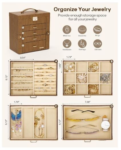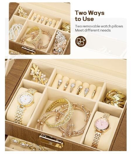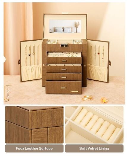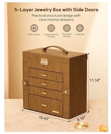 The Homde Synthetic Leather Huge Jewelry Box is a spacious organizer designed for storing a variety of jewelry items. It features a mirror for convenience when trying on jewelry pieces. This jewelry box is suitable for storing necklaces, bracelets, rings, and earrings, making it a versatile option for organizing your jewelry collection. With its mirrored watch organizer and ample storage space, this jewelry box is a practical and stylish solution for keeping your accessories safe and organized.
