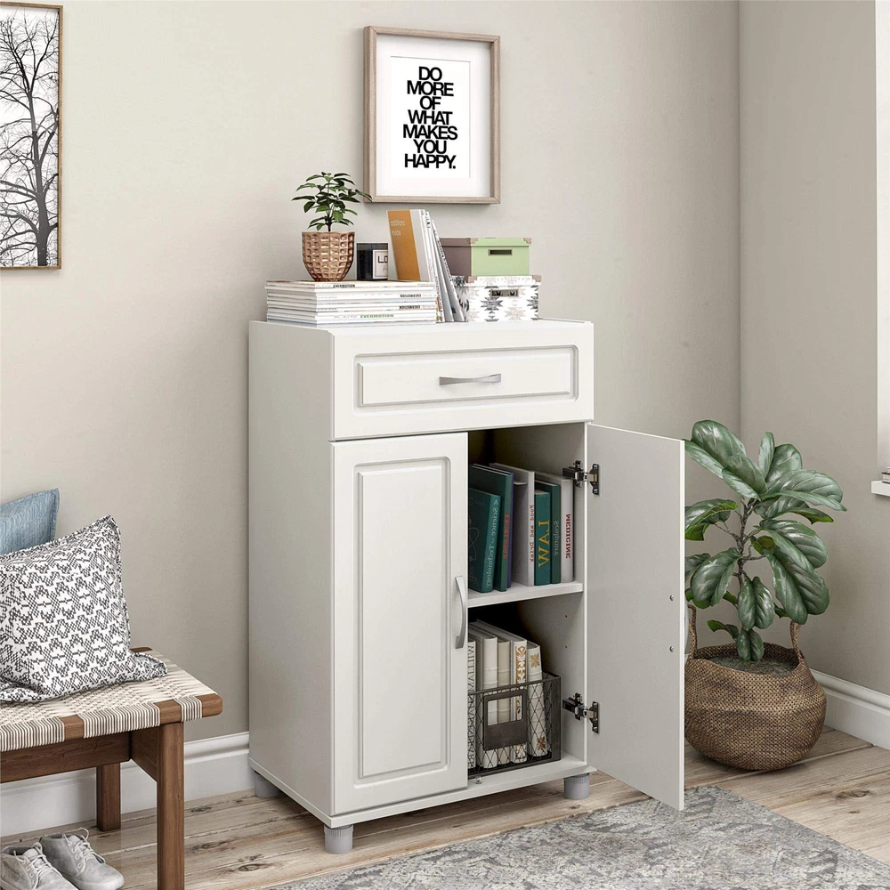 SystemBuild Evolution Kendall 24" 1 Drawer/2 Door Base Storage Cabinet - White SystemBuild 24” 1 Drawer/2 Door Base Storage Cabinet can be used in almost any room This item is perfect to store bed sheets and linens or overflow items from your kitchen Assembled dimensions: 38.25"H x 23.44"W x 15.38"D Drawer features full-extension drawer slides for easy access to contents Cabinet features 1 adjustable and 1 fixed shelf to customize your storage white 2 door doors 1 drawer drawer Add convenient storage space to your home with the Systembuild Evolution Kendall 24" 1 Drawer/2 Door Base Storage Cabinet. This Base Cabinet features a top drawer for easy access to contents. Behind the 2 doors, you'll find 1 adjustable and 1 fixed shelf. The 24" 2 Drawer/2 Door Storage Cabinet features a crisp neutral finish that creates a refined, clean look in your home. Use this piece as a stand-alone item, or combine it with additional Systembuild Evolution Kendall storage items to create the perfect storage solution for your home. Systembuild Evolution 24" 1 Drawer/2 Door Base Storage Cabinet requires assembly upon delivery. Countertops not included. Shipping We offer FREE shipping on all orders! We use a selection of shipping services such as UPS, FedEx, USPS etc. We only ship to the lower 48 states, no APO/FPO addresses or PO Boxes allowed. Local pickups and combined shipping options are not provided at this time. Return You can return a product for up to 30 days from the date you purchased it. Any product you return must be in the same condition you received it and in the original packaging. Please keep the receipt. Payment We accept payment by any of the following methods: PayPal Please pay as soon as possible after winning an auction, as that will allow us to post your item to you sooner! Feedback Customer satisfaction is very important to us. If you have any problem with your order, please contact us and we will do our best to make you satisfied. Contact Us If you have any queries, please contact us via ebay. We usually respond within 24 hours on weekdays. Please visit our eBay store to check out other items for sale! Thank you for shopping at our store.