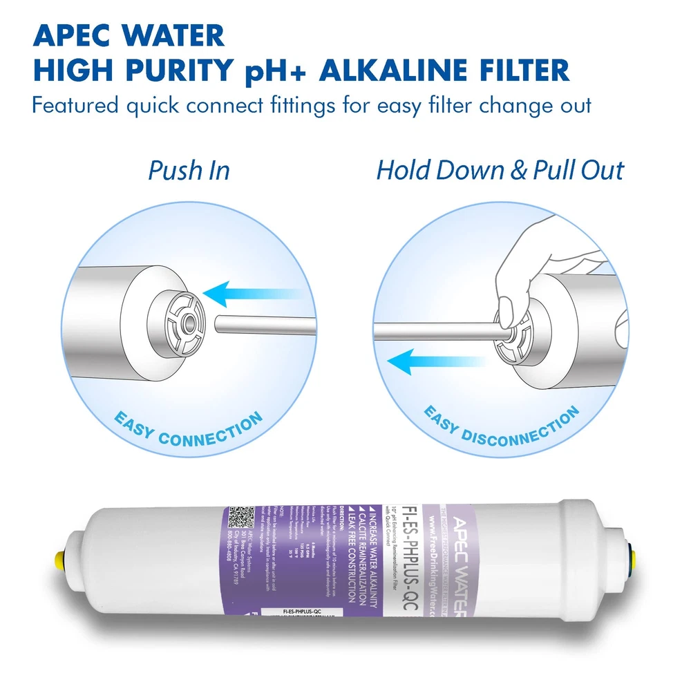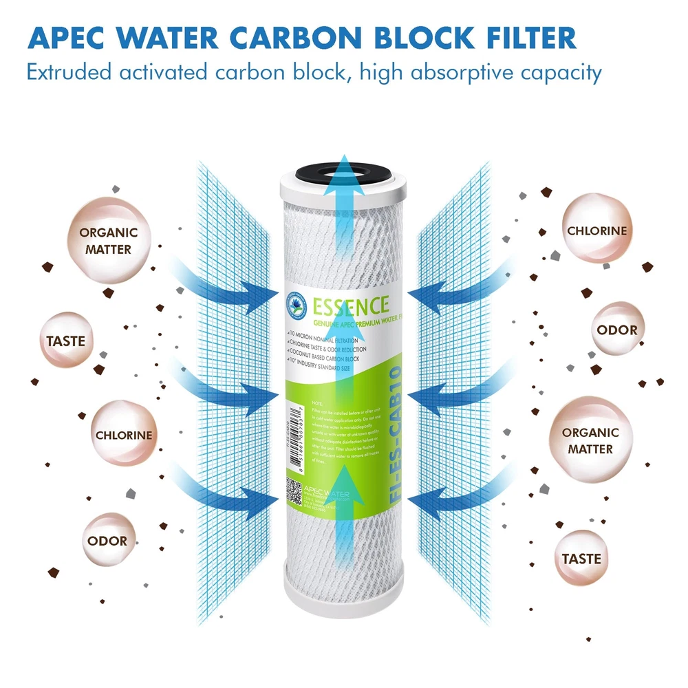 APEC ESSENCE series standard capacity pre-filter set for ROES-PH75 is made with high quality filtration components to protect and prolong the lifespan of your reverse osmosis system. Premium quality filter set lasts over 6 to 12 months for high performance impurity removal. These standard size filters are 10 inch and compatible with all standard size under counter RO systems. 1st stage: 5 micron polypropylene filter to remove sediment, particles, and rust. Prevent sediment from building up and clogging the filters and the system. 2nd and 3rd stage: 10 micron extruded carbon block filter to remove chlorine, taste & odor at a fast flow rate. Improve water taste, protect the life of the RO membrane and enjoy chlorine free water. 6th stage: 10 inch high purity pH+ calcium carbonate alkaline inline filters W/quick connect. Compatible with APEC ROES-PH75 and all other standard size under counter reverse osmosis systems. For over 20 years, APEC has been an industry leading manufacturer who specializes in high performance RO systems. As the original manufacturer, we have dedicated a knowledgeable and sincere team that is committed to providing customer SATISFACTION in hopes to bring many years of enjoyment and good health for you and your family. ESSENCE Series FILTER-SET-ESPH is for ROES-PH75. 1st stage 5 micron Polypropylene sediment filter to remove dust, particles, and rust 2nd & 3rd stage 10 micron extruded carbon block filters to remove chlorine, taste & odor 6th stage 10" High Purity US Made pH+ Calcium Carbonate Alkaline Inline Filters w/ Quick Connect APEC's extruded solid carbon block filters far surpass GAC filters in performance and absorptive capacity; in addition they do not leak carbon fines.