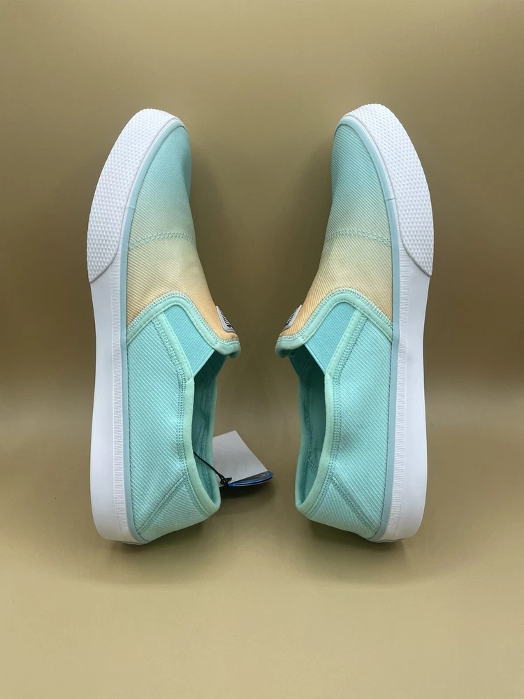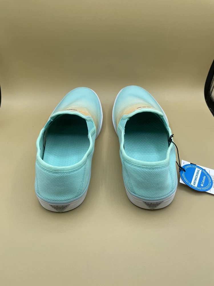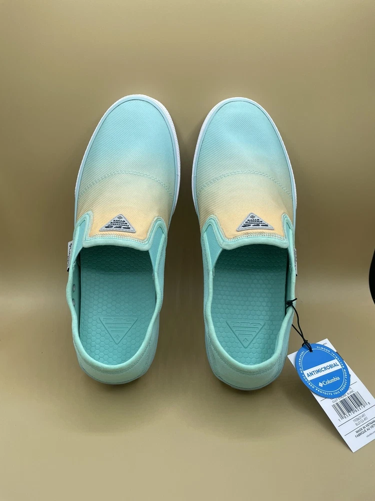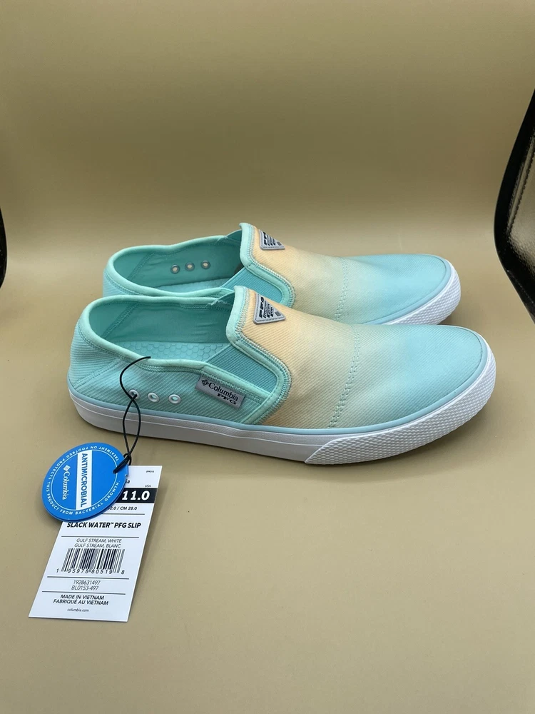 These Columbia Slack Water PFG Slip On Sneakers are women's shoes in size 11 (UK 9, EU 42). They feature a low top style with a multicolor solid pattern and slip-on closure. The shoes are designed for comfort and performance, suitable for casual wear, work, or travel. Made with breathable fabric and a rubber outsole, they are ideal for walking, the beach, and fishing in summer, fall, or spring seasons. The shoes have Columbia branding accents and come without the Original box