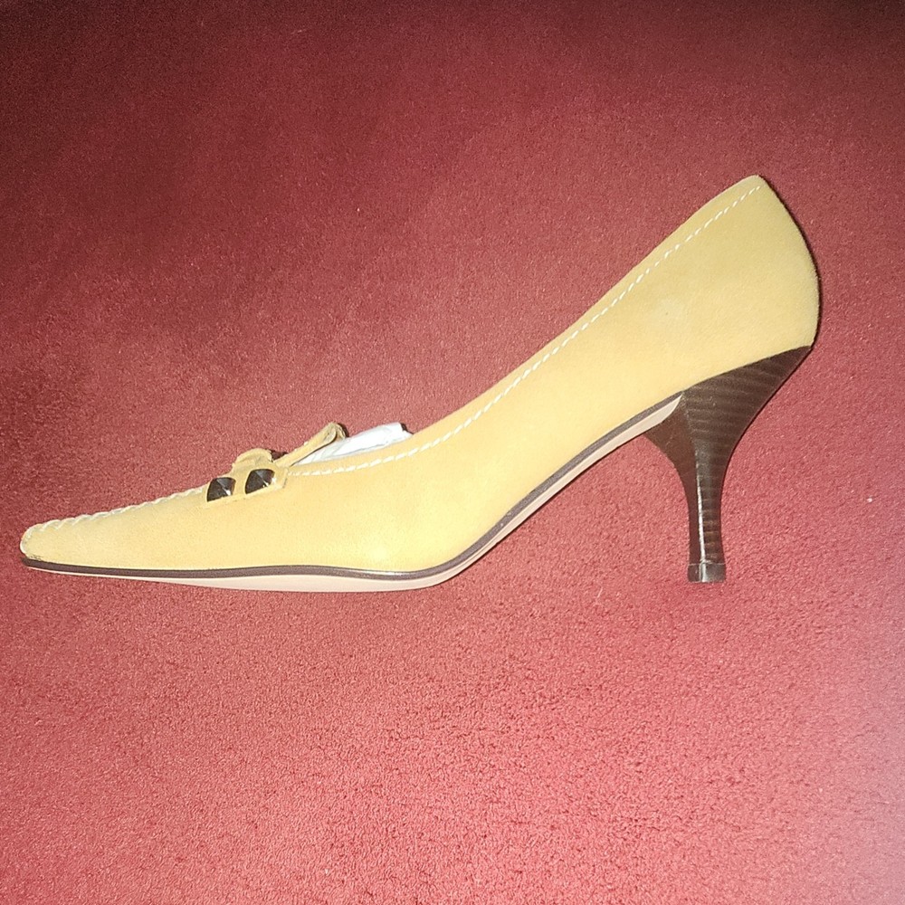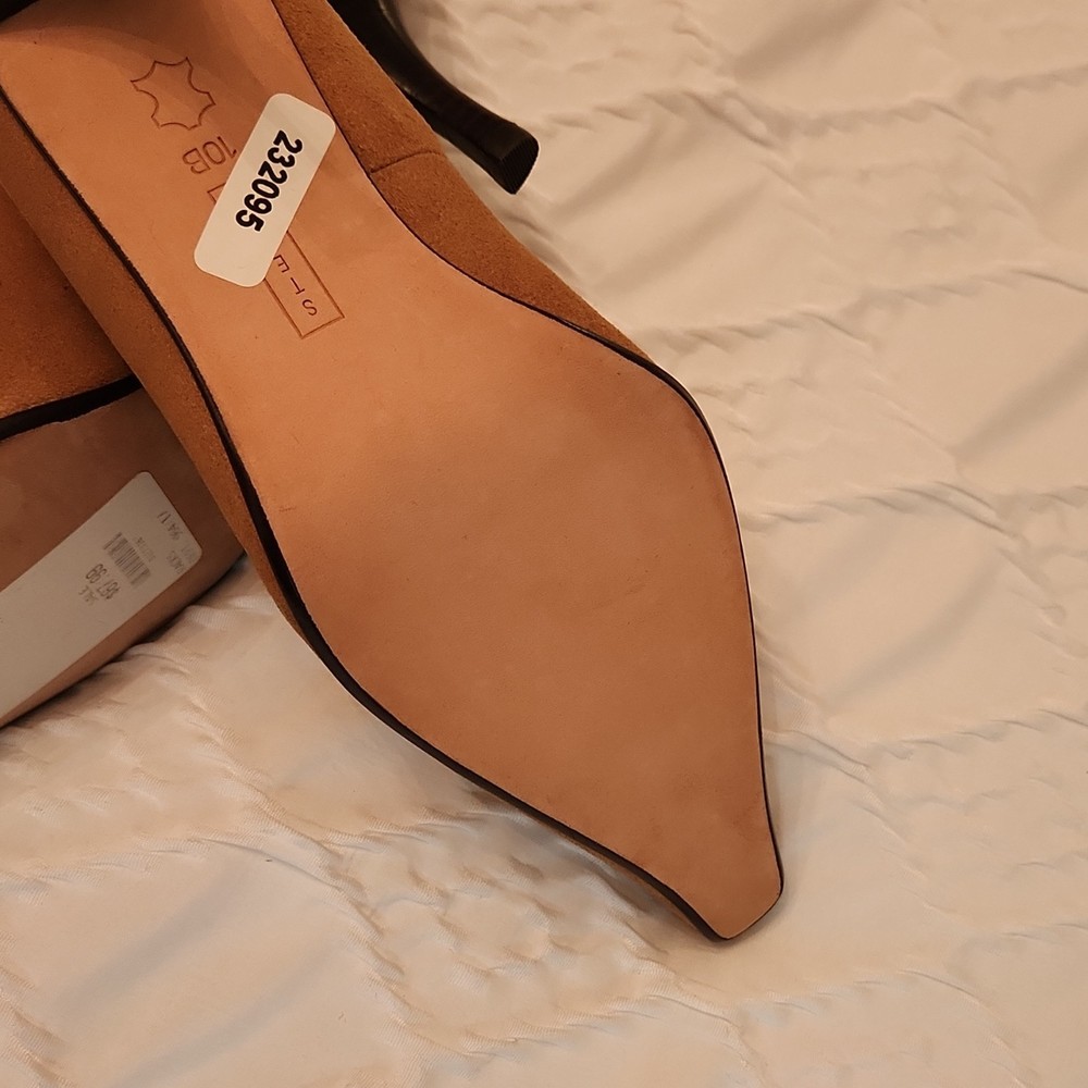 The product is a pair of Steve Madden tan suede slides with a pointed toe and studded bow detail. These stylish shoes feature contrast stitching and are part of the Steven by Steve Madden brand. The outsole is made of leather, and the design is perfect for women looking to add a touch of edgy sophistication to their outfit. The size is US 10, making them a comfortable and fashionable choice for everyday or formal wear.