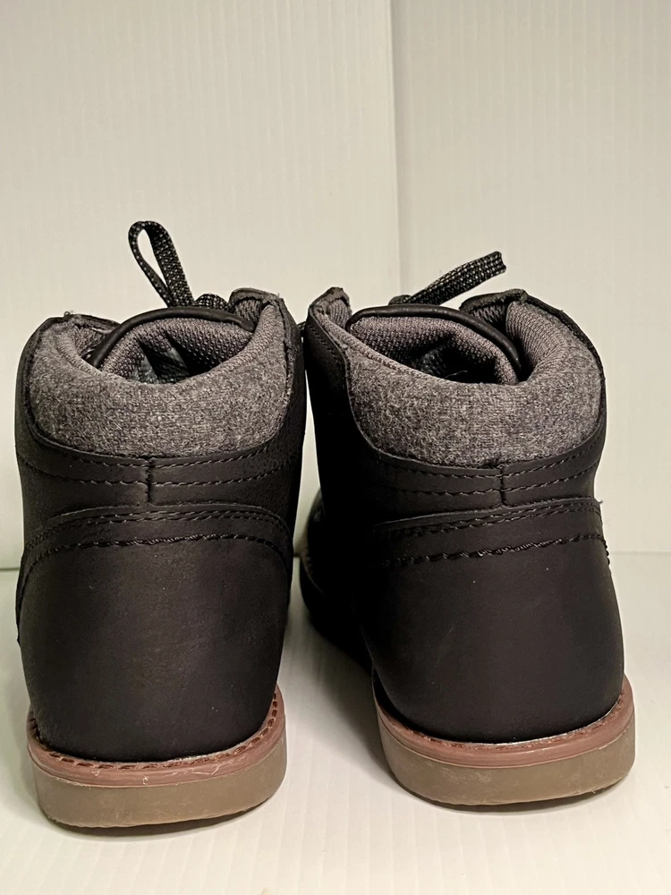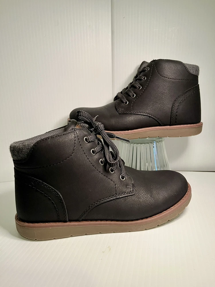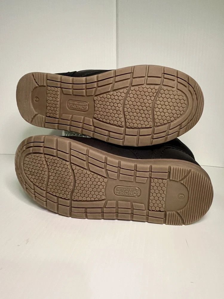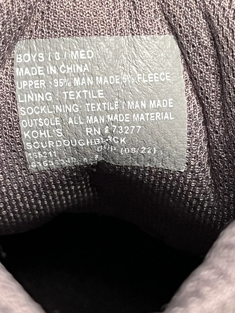 This is a pair of size 3 youth boys' ankle boots by Sonoma, model Sourdough, 99H * NOTE-inside tongue tag says “black” but the outer shell really appears more of a dark chocolate brown color. They feature a lace-up closure, cushioned memory foam insole, and breathable mesh lining. The boots are designed for comfort with moderate cushioning level, suitable for activities like walking, school, and hiking. The upper material is a combination of polyurethane and fleece, and the outsole is made of synthetic material. Perfect for travel, activewear, or casual wear in all seasons. Never worn New without tags, without box