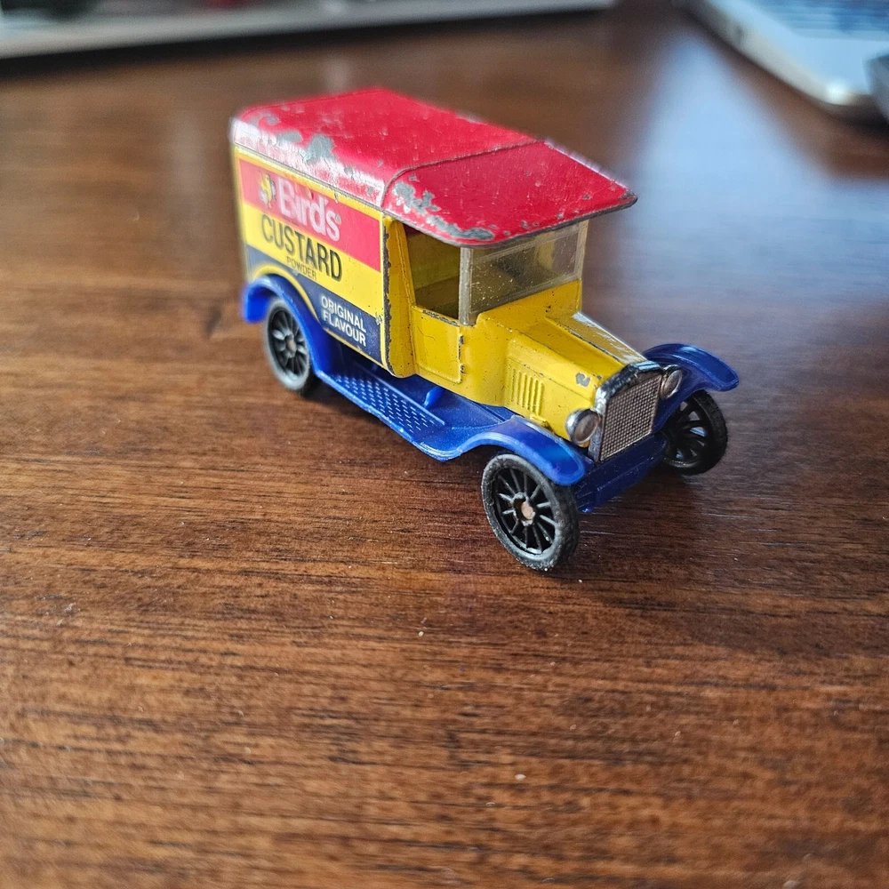 The vintage Matchbox diecast model car is a 1921 Model T Ford featuring Birds Custard Powder branding from 1989. This metal car is in yellow and blue colors, with no customization or autographs. It is part of the Matchbox series and is a representation of a classic Ford vehicle from the 1920s, suitable for collectors aged 8 years and above. No returns. Please review all pictures prior to purchase.
