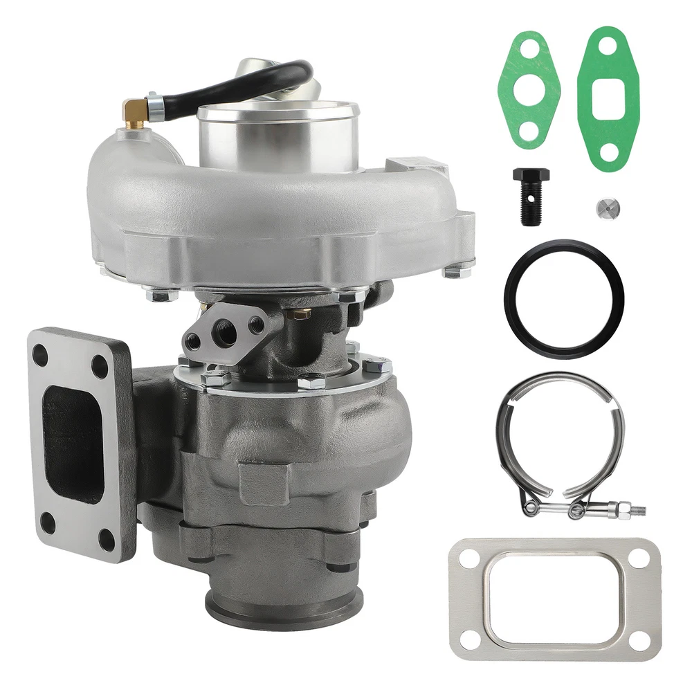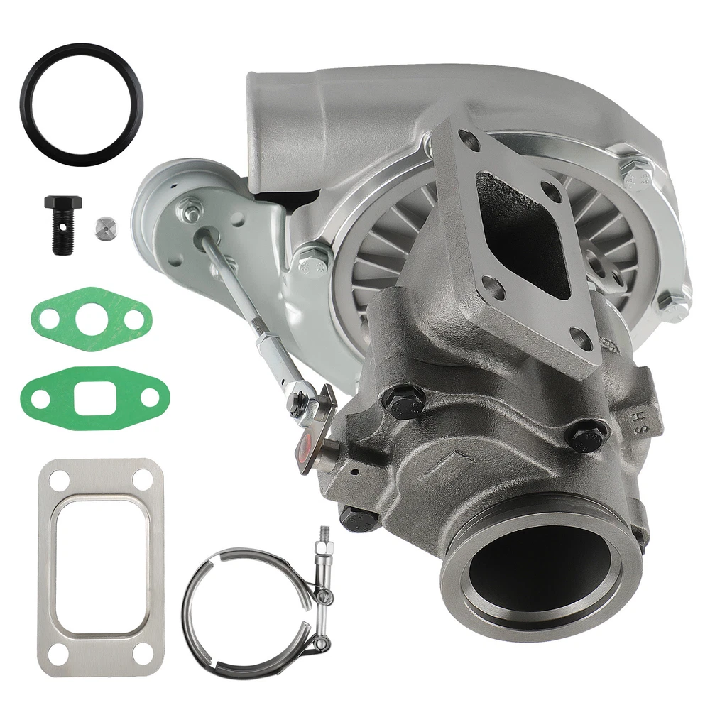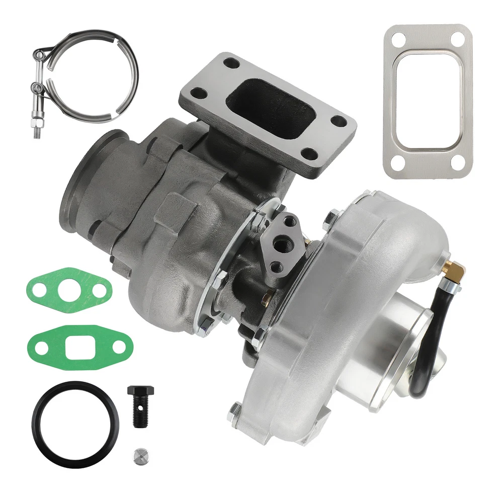 Universal T3 T04E V-band Turbocharger .63 A/R W/ Wastegate Application: Perfect for all 4 or 6 CYL, 1.5L-2.5L Engines *Notice:Please confirm that there is enough space in your car to install this turbo before purchasing. Product Specific: Exhaust Inlet (Turbo Manifold) Flange: T3 4 bolt Flange Patterns Exhaust Outlet Flange: V-Band Flange (ID/OD: 2.5"/3.1") Turbine Side: Turbine Trim: 74.2 Turbine A/R: 0.63 Turbine Inducer: 64.8mm Turbine Exducer: 55.8mm Turbine exhaust outlet : 79mm Turbine exhaust inlet: 44.7mm (length) / 85.8mm (width) Compressor Side: Compressor Trim: 48.1 Compressor A/R: 0.5 Compressor Inducer: 52.7mm Compressor Exducer: 76mm Compressor outlet:78 mm Compressor inlet:51.5 mm Oil Inlet: M12*1.25 & 2*M8*1.25 Oil Outlet: 2*M8*1.25 Bearing: Journal Bearing Cooling Type: Oil Cooled Wastegate: w/ Wastegate Thrust Bearings: 270 Degrees Hosepower: Up to 420 HP Turbo Type: Individual Condition: 100% Brand New Accessories: You will get exactly as shown as picture above Package Size: 30x 28x 24 cm Package Weight: 9180g Features: *Product Material 1. Turbine housing: Ductile iron QT450-10 - temperature resistant up to 700℃ 2. Steel turbine wheel: K418 alloy - high oxidation stability and resistance up to 900℃ 3. Compressor housing: ZL104 aluminum with lightweight 4. Compressor wheel: Cast aluminium blades – superior air tightness & corrosion resistance *Product Features 1. Rich experience in turbo production and own factory 2. High-Speed oil seal ring and Precision clearance 3. Built for durability and strength * Technology Advantage: 1. 100% balancing Test by TURBOTECHNICS VSR3 2. G3-min-Flow VNT Turbo testing 3. Advanced Actuator Tester/Programmer Note: * Replace, repair or reconnect air cleaner element per manufacturer's manual to avoid compressor wheel damage. * Make sure the oil drain line is lower than the turbo itself. * Ensure exhaust outlet are well sealed by welding * The degree of modification of the universal turbo depends on your individual vehicle.Professional installation is highly recommended. * This Turbo is not vehicle specific. Please check the specifications and verify compatibility prior to placing your order. * Before installing the new turbocharger, the cause that led to the failure of the turbo must be analyzed and eliminated (e.g. insufficient oil supply, foreign bodies in the intake area, crankcase ventilation without function, etc.)! MXR04FXJT