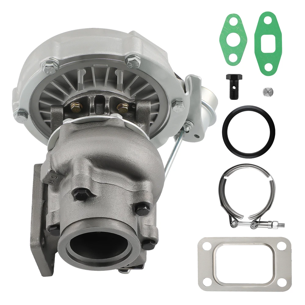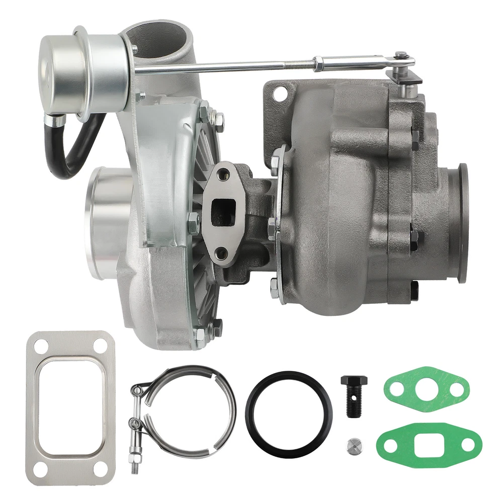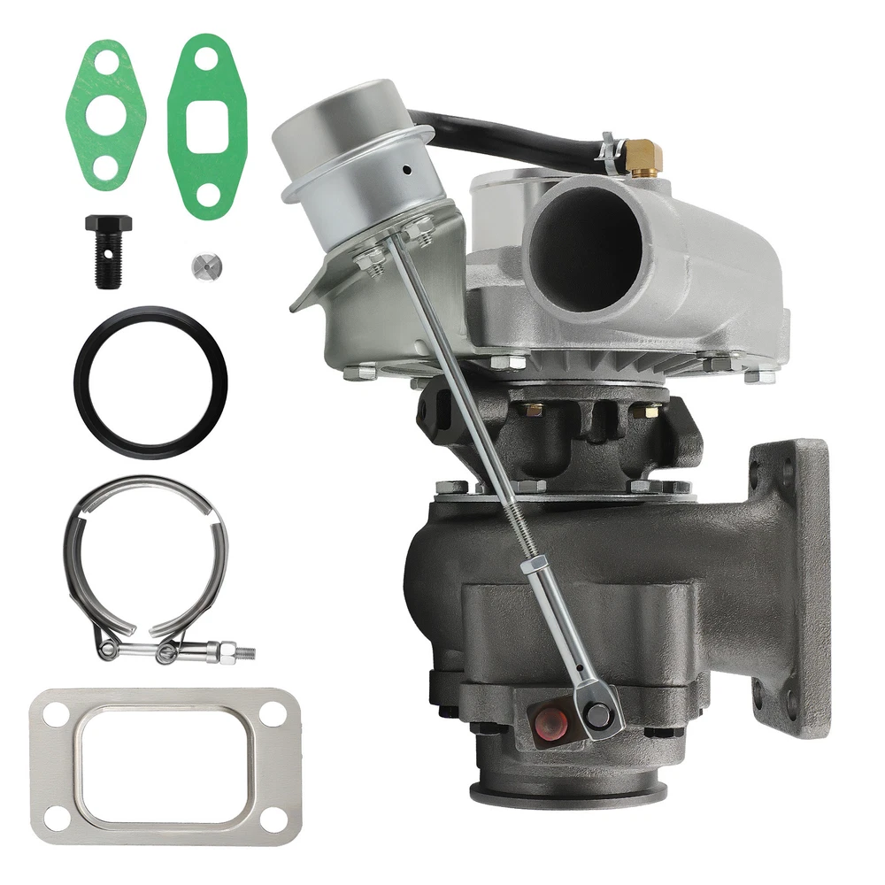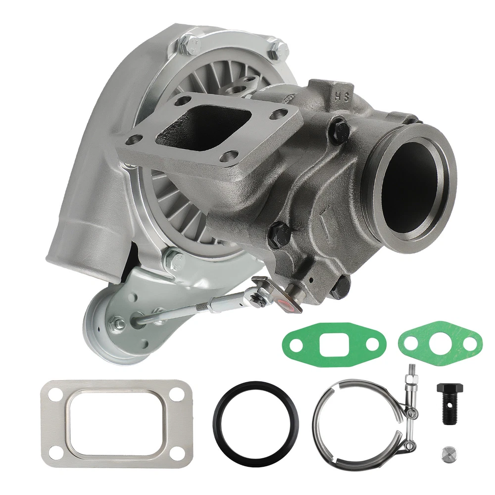 Universal T3 T04E V-band Turbocharger .63 A/R W/ Wastegate Application: Perfect for all 4 or 6 CYL, 1.5L-2.5L Engines *Notice:Please confirm that there is enough space in your car to install this turbo before purchasing. Product Specific: Exhaust Inlet (Turbo Manifold) Flange: T3 4 bolt Flange Patterns Exhaust Outlet Flange: V-Band Flange (ID/OD: 2.5"/3.1") Turbine Side: Turbine Trim: 74.2 Turbine A/R: 0.63 Turbine Inducer: 64.8mm Turbine Exducer: 55.8mm Turbine exhaust outlet : 79mm Turbine exhaust inlet: 44.7mm (length) / 85.8mm (width) Compressor Side: Compressor Trim: 48.1 Compressor A/R: 0.5 Compressor Inducer: 52.7mm Compressor Exducer: 76mm Compressor outlet:78 mm Compressor inlet:51.5 mm Oil Inlet: M12*1.25 & 2*M8*1.25 Oil Outlet: 2*M8*1.25 Bearing: Journal Bearing Cooling Type: Oil Cooled Wastegate: w/ Wastegate Thrust Bearings: 270 Degrees Hosepower: Up to 420 HP Turbo Type: Individual Condition: 100% Brand New Accessories: You will get exactly as shown as picture above Package Size: 30x 28x 24 cm Package Weight: 9180g Features: *Product Material 1. Turbine housing: Ductile iron QT450-10 - temperature resistant up to 700℃ 2. Steel turbine wheel: K418 alloy - high oxidation stability and resistance up to 900℃ 3. Compressor housing: ZL104 aluminum with lightweight 4. Compressor wheel: Cast aluminium blades – superior air tightness & corrosion resistance *Product Features 1. Rich experience in turbo production and own factory 2. High-Speed oil seal ring and Precision clearance 3. Built for durability and strength * Technology Advantage: 1. 100% balancing Test by TURBOTECHNICS VSR3 2. G3-min-Flow VNT Turbo testing 3. Advanced Actuator Tester/Programmer Note: * Replace, repair or reconnect air cleaner element per manufacturer's manual to avoid compressor wheel damage. * Make sure the oil drain line is lower than the turbo itself. * Ensure exhaust outlet are well sealed by welding * The degree of modification of the universal turbo depends on your individual vehicle.Professional installation is highly recommended. * This Turbo is not vehicle specific. Please check the specifications and verify compatibility prior to placing your order. * Before installing the new turbocharger, the cause that led to the failure of the turbo must be analyzed and eliminated (e.g. insufficient oil supply, foreign bodies in the intake area, crankcase ventilation without function, etc.)! MXR04FXJT