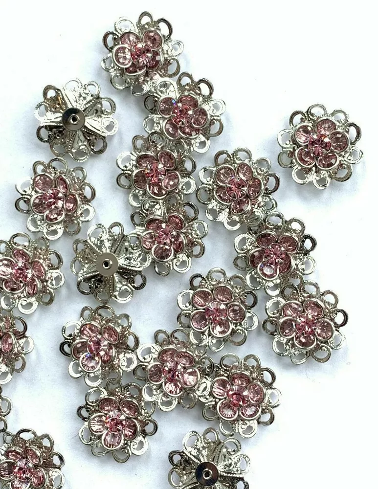 This auction is offering 24 beautiful Silver Plated Filigree Flower Components. You can easily use these as sew ons as well. They are 17mm in diameter and the second tier of petals consist of Lt. Rose Channel cut stones with a brilliant Lt. Rose center. Super Sparkle & Shine. All my auctions are 100% guaranteed or your money back. Thanks for looking.