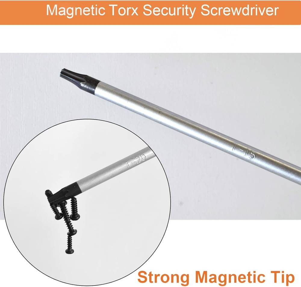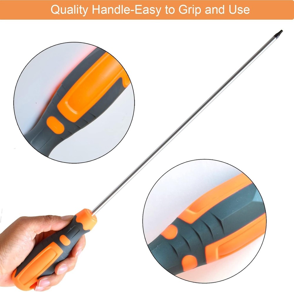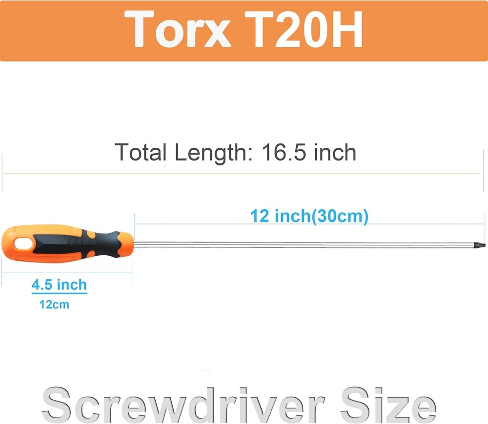 About this item What's in Package: 1 x 16.81 x 1.81 x 1.34 inches Extra Long T20 Torx Screwdriver. It’s used to install or remove T20 Torx Tamper Proof screws. Chrome Vanadium Steel Blade: The long blade of T20 screwdriver is constructed from shock-resisting S2 steel for maximum durability. Ergonomic anti-slip handle: Extra Long T20 Torx Screwdriver features an ergonomically-designed and non-slip handle to ensure a comfortable grip while working with square screws. Material of Handle: Made of a composite of hard PVC and covered with non-slip, soft TPR to improve grip. Magnetic Tip: Magnetic blade tip can hold metal screws on its tips, making it easy to take the screw out after unraveling and preventing them from falling to the ground. Dimensions: 16.81 x 1.81 x 1.34 inches.